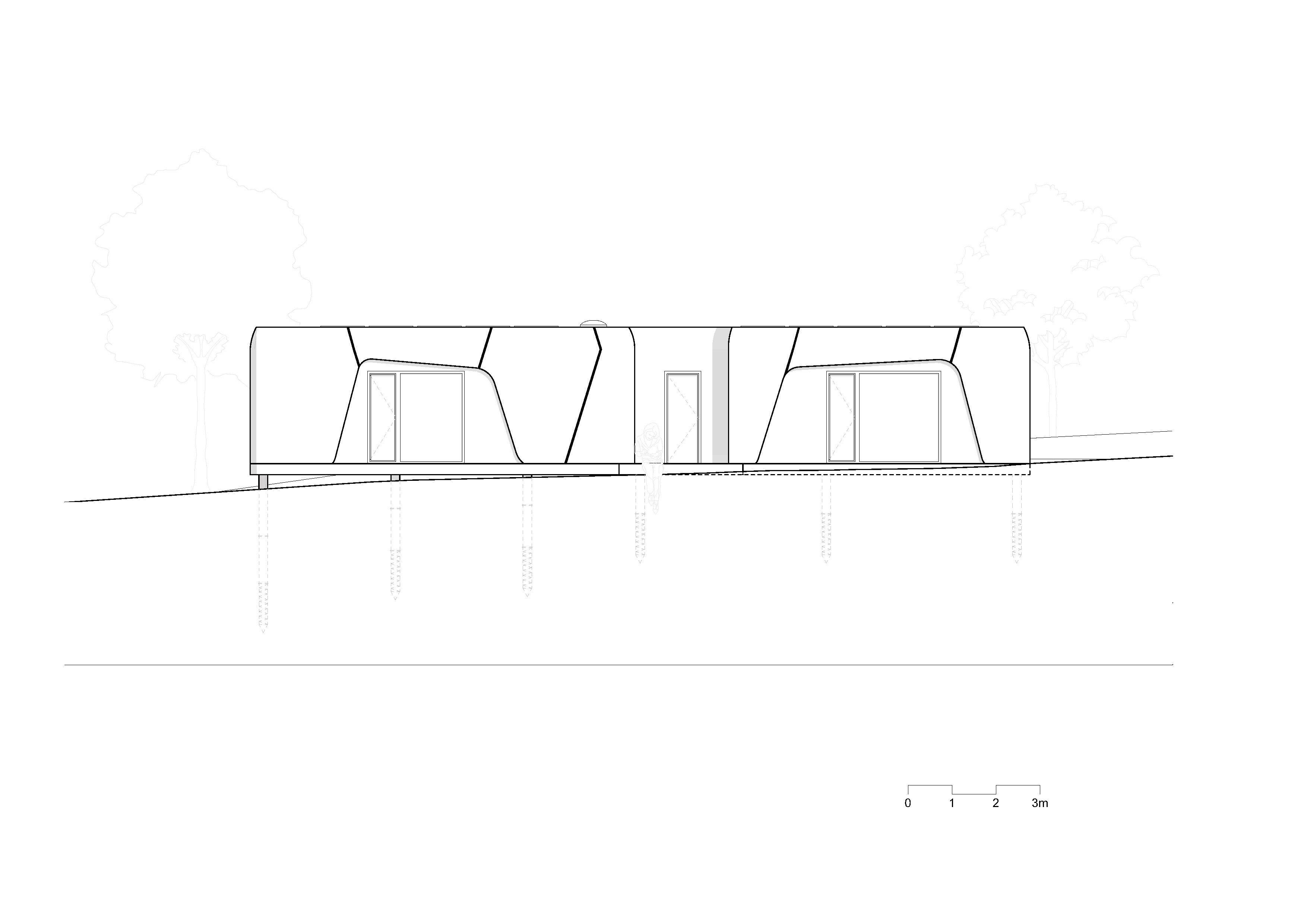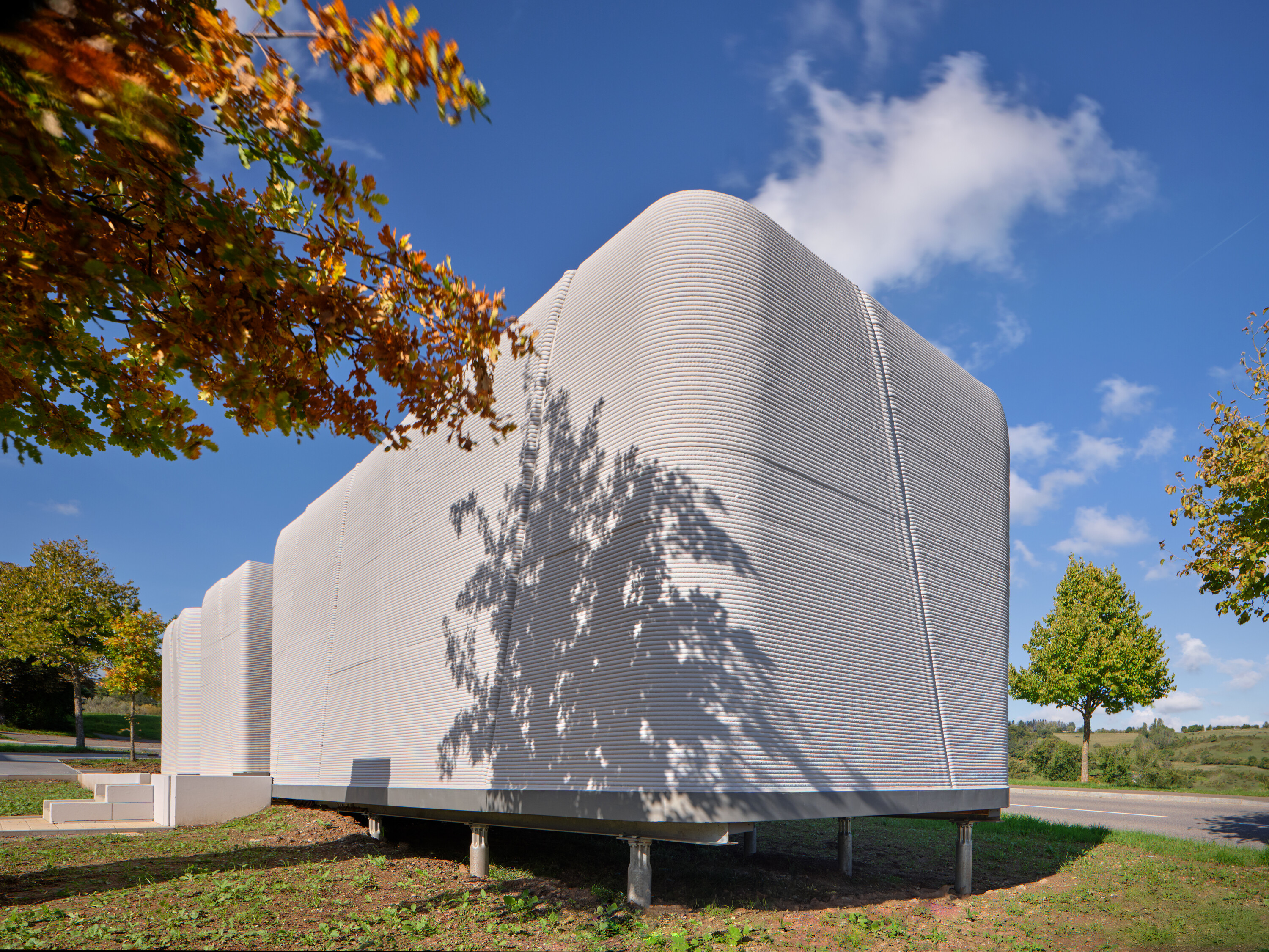 첫 번째 파일럿 주택은 폭 3.5m, 깊이 17.7m의 협소한 부지(실면적 약 47㎡)에 세워졌다. 양쪽 벽면에는 가구와 수납, 서비스 공간을 배치하고, 중앙에는 시각적으로 열린 축을 두어 실내가 실제보다 넓고 차분하게 느껴지도록 했다. 이 주택은 룩셈부르크 최초로 현지 골재를 사용한 3D 프린트 주택이자, 콘크리트 기초 대신 목재 바닥 플랫폼과 스크루 파일 기초를 적용한 사례다. 이를 통해 중량을 줄이고, 시공 및 해체 과정에서도 환경적 부담을 최소화했다.