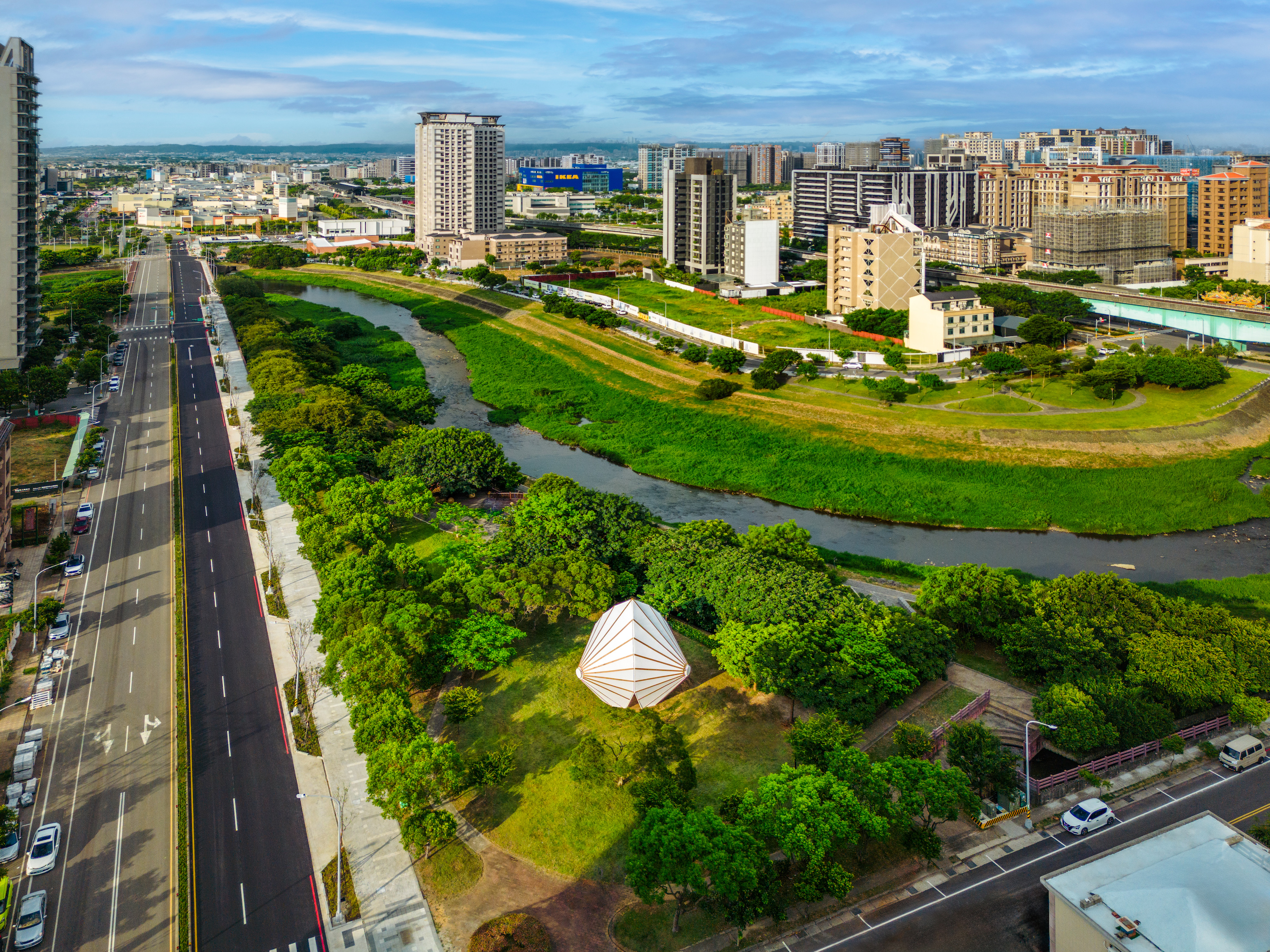 건축가는 하카(Hakka) 문화에서 중요한 상징을 지닌 우산에서 출발한다. 하카 사람들에게 우산은 온전함과 재회의 의미를 품은 물건이며, 인연과 만남이 우연과 필연 사이에서 형성된다는 믿음을 담고 있다. 특히 ‘우산’을 뜻하는 한자 【傘】 안에는 여러 개의 【人】 자가 반복되는데, 이는 사람들이 모이고 기대며 함께 살아가는 관계성을 상징한다. 이러한 중층적 의미를 해석한 작가 펑청쭝은 전통 공예의 구조적 미학을 현대적으로 번역해온 작업으로 잘 알려져 있다. 이번 작업에서도 우산을 중심 모티프로 삼아 세 개의 거대한 돔 형태로 확장해 수평으로 펼쳐지는 보호막과 같은 캐노피를 만들었다. 관람자는 그 아래에 들어서 잠시 멈추고 머무는 경험을 하게 된다.