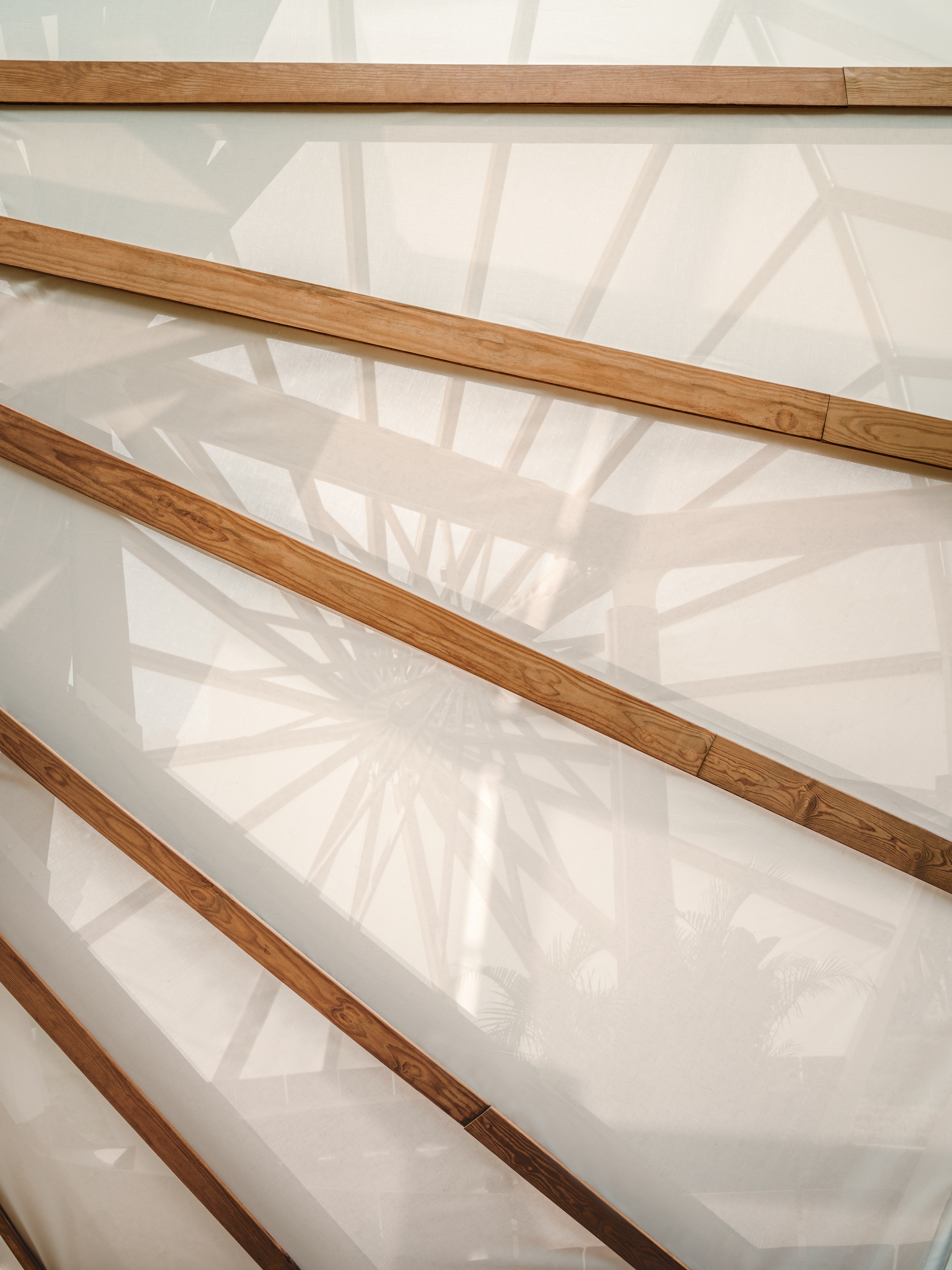 세 개의 캐노피는 중심축을 기준으로 바깥 방향으로 퍼져 나가며 관람자의 시점에 따라 다양한 기하학적 장면을 만들어낸다. 내부에 서면 마치 우주의 어딘가를 부유하는 거대한 비행체 안에 들어온 듯한, 낯설면서도 따뜻하고 고요한 감각이 형성된다.