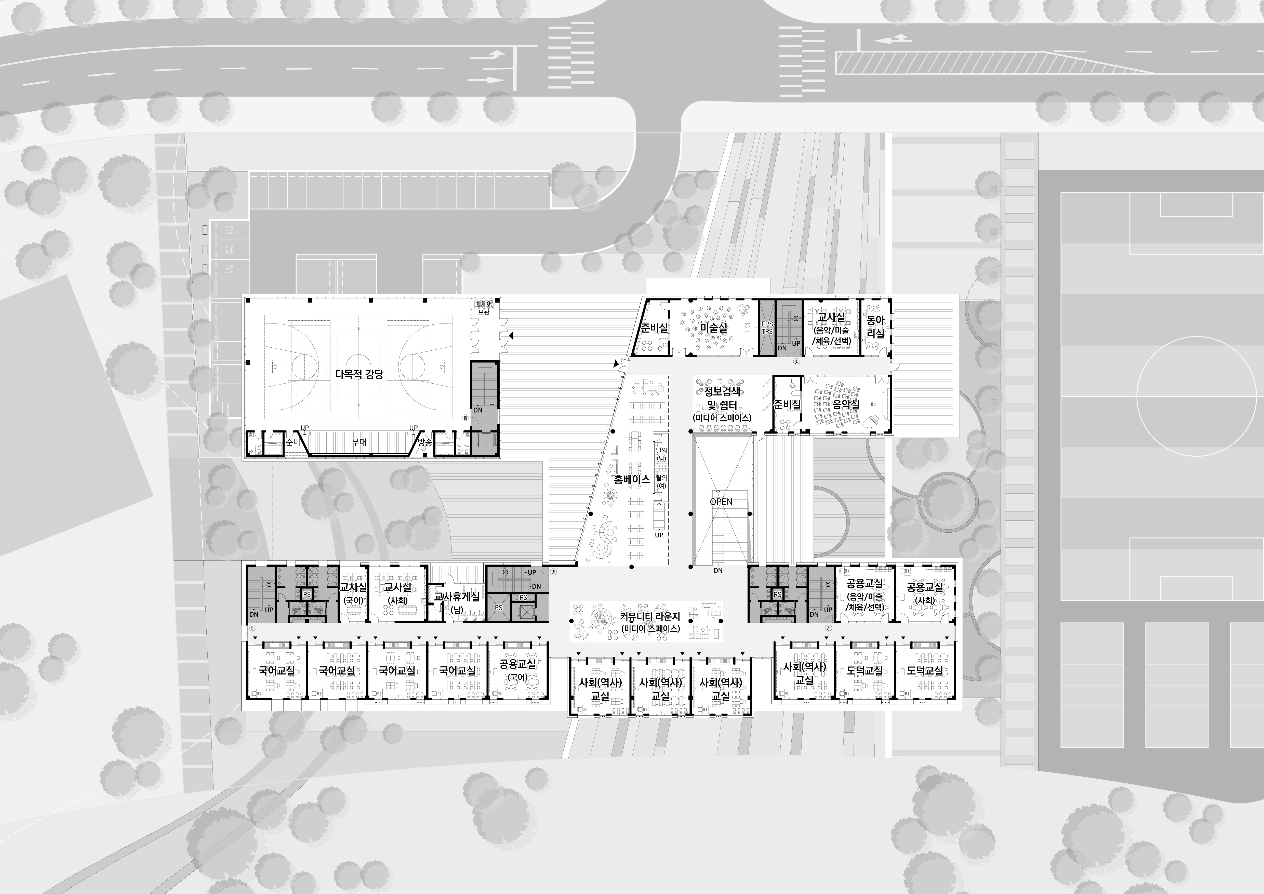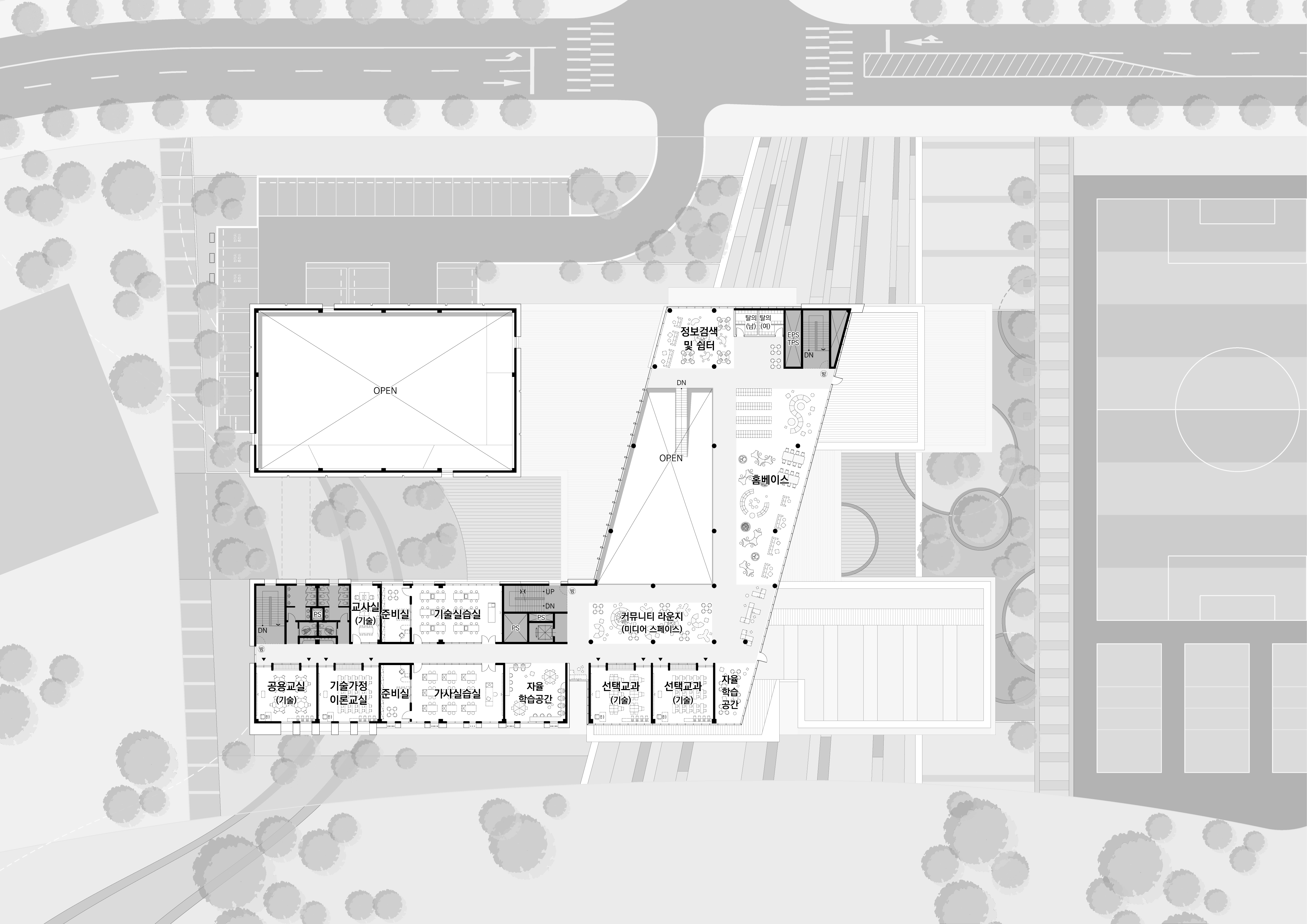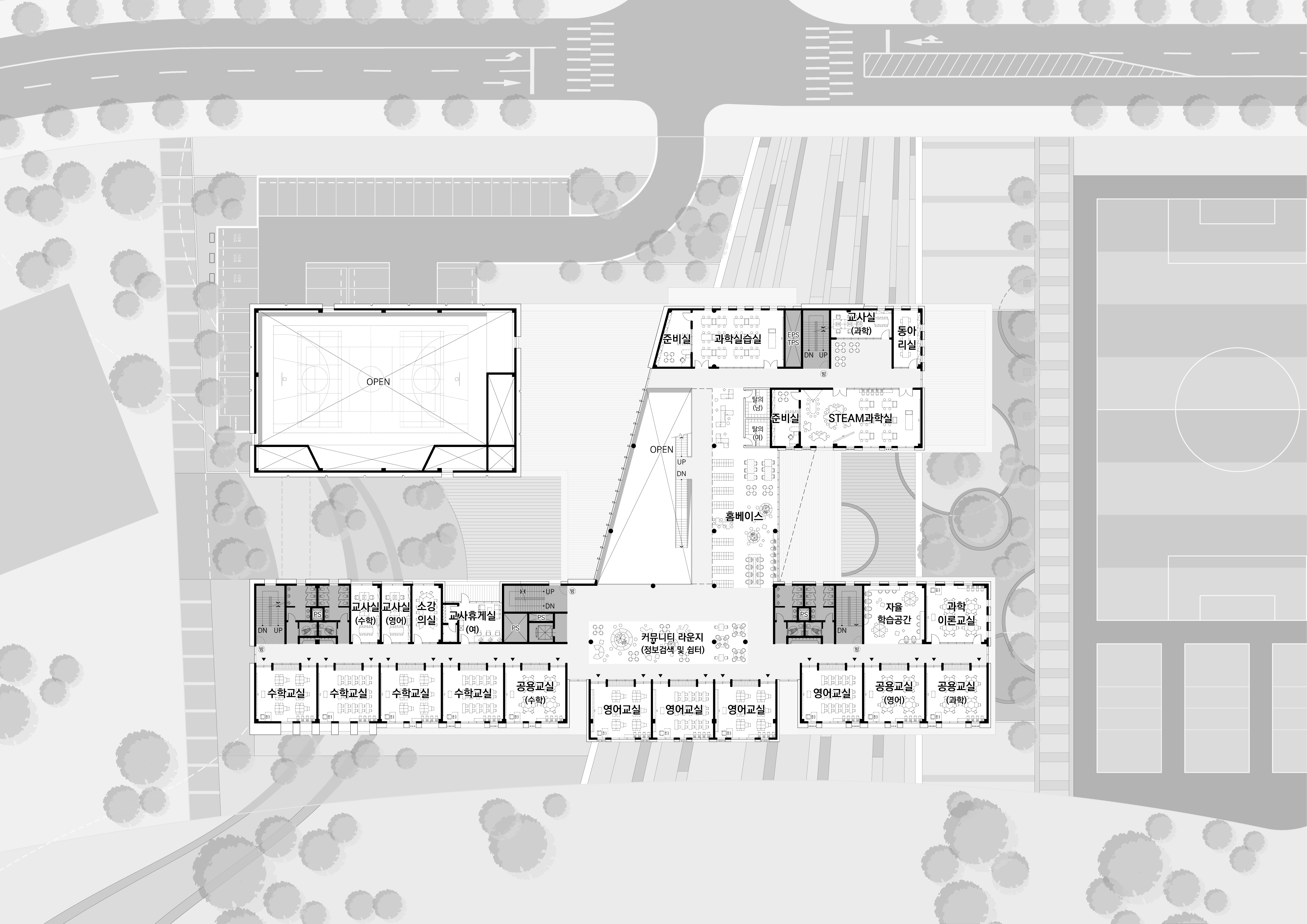 주거단지와 공원을 연결하는 보행로에서 내어주는 개방공간(도서실, 시청각실, 식당 등)계획으로 지역사회와 교류하고 일상을 연결하는 학교 계획