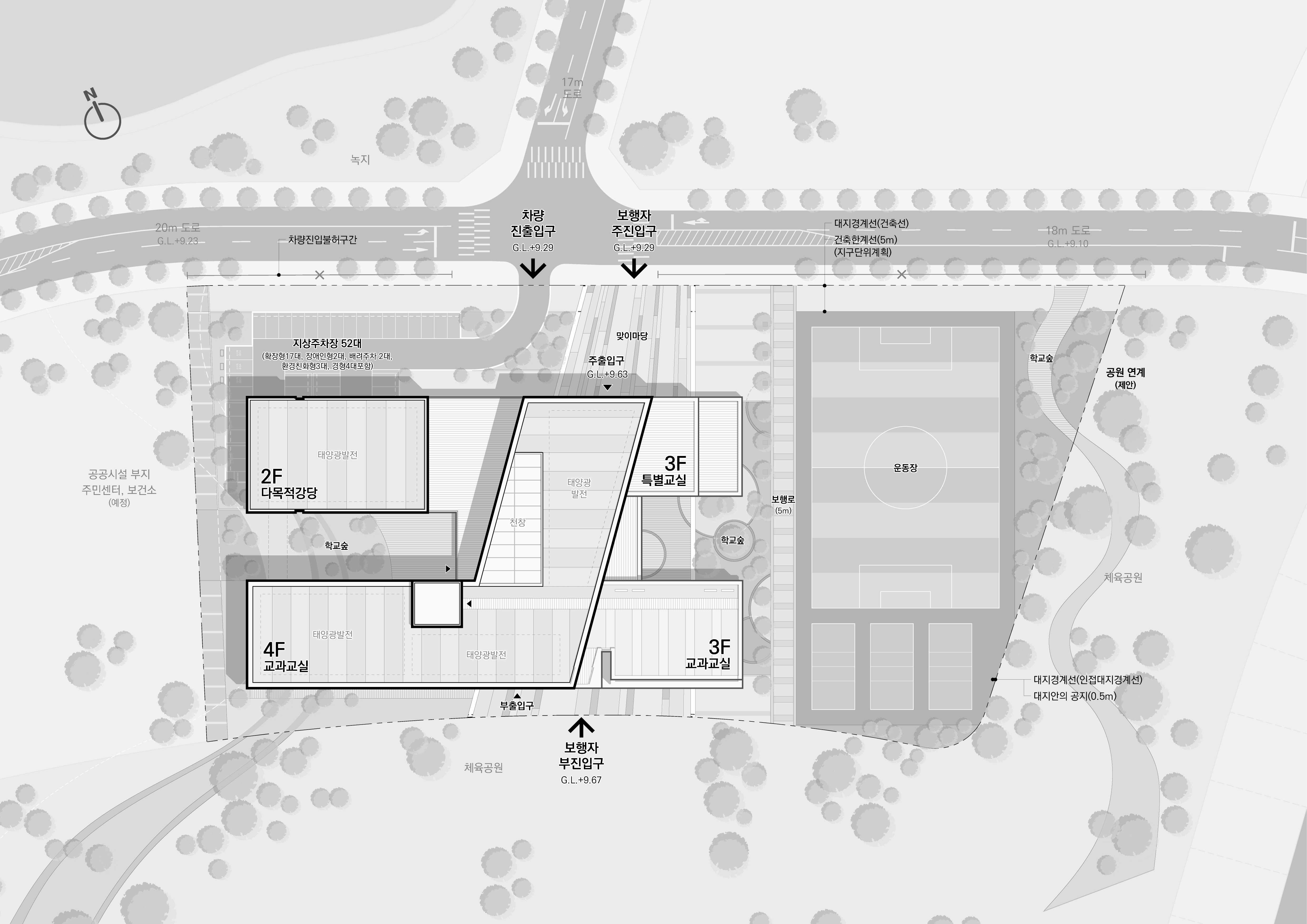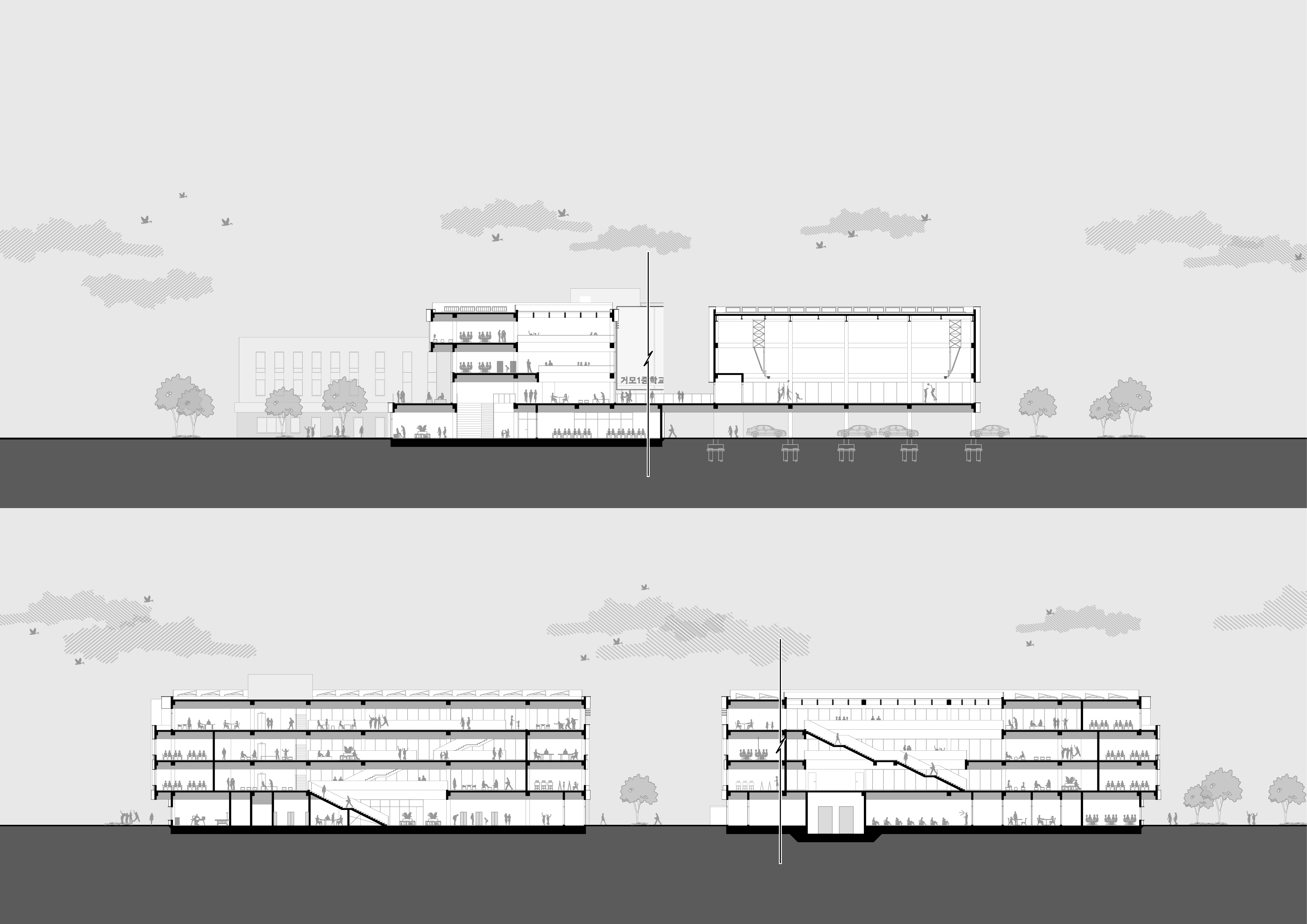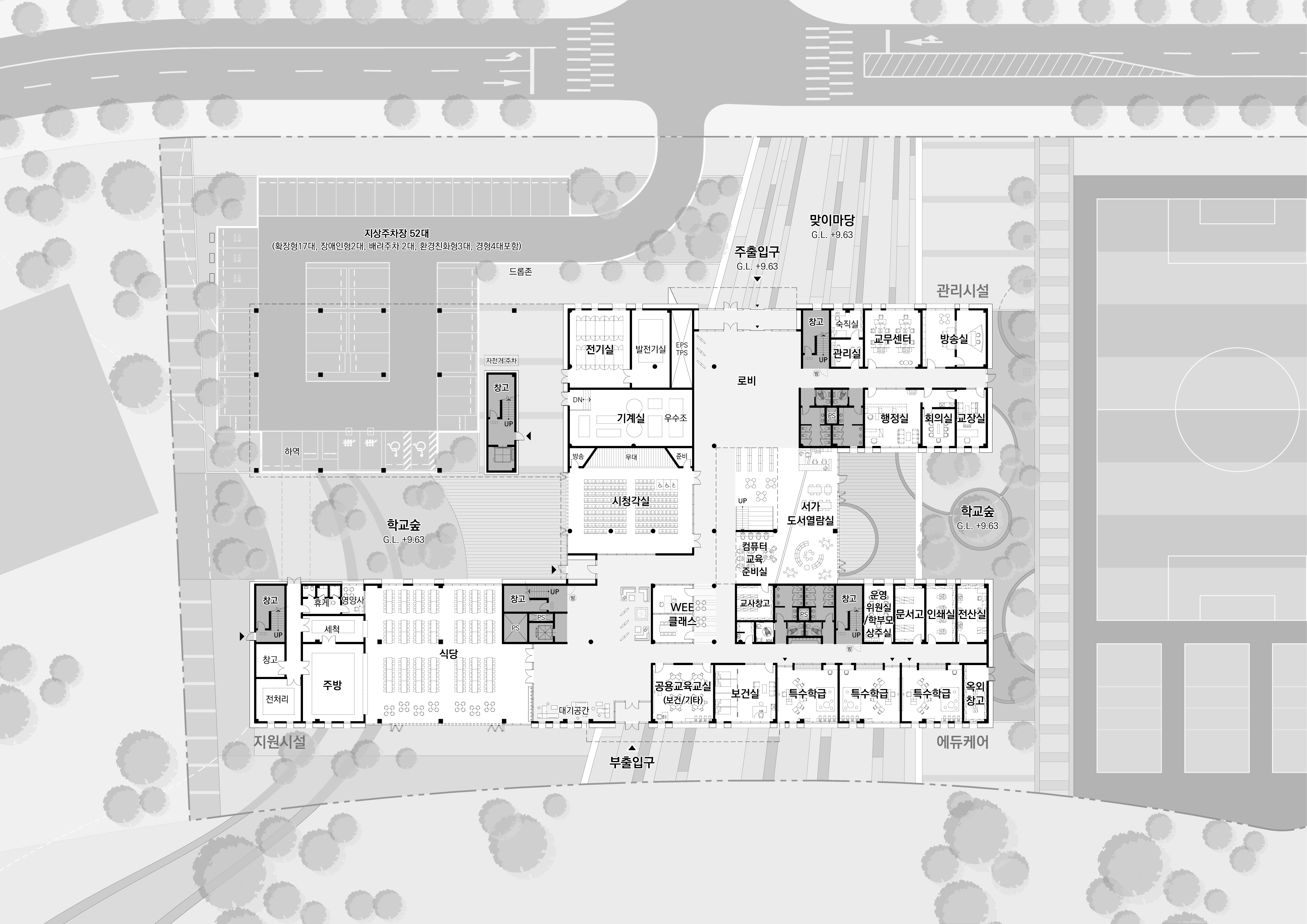 주거단지와 공원을 연결하는 보행로에서 내어주는 개방공간(도서실, 시청각실, 식당 등)계획으로 지역사회와 교류하고 일상을 연결하는 학교 계획