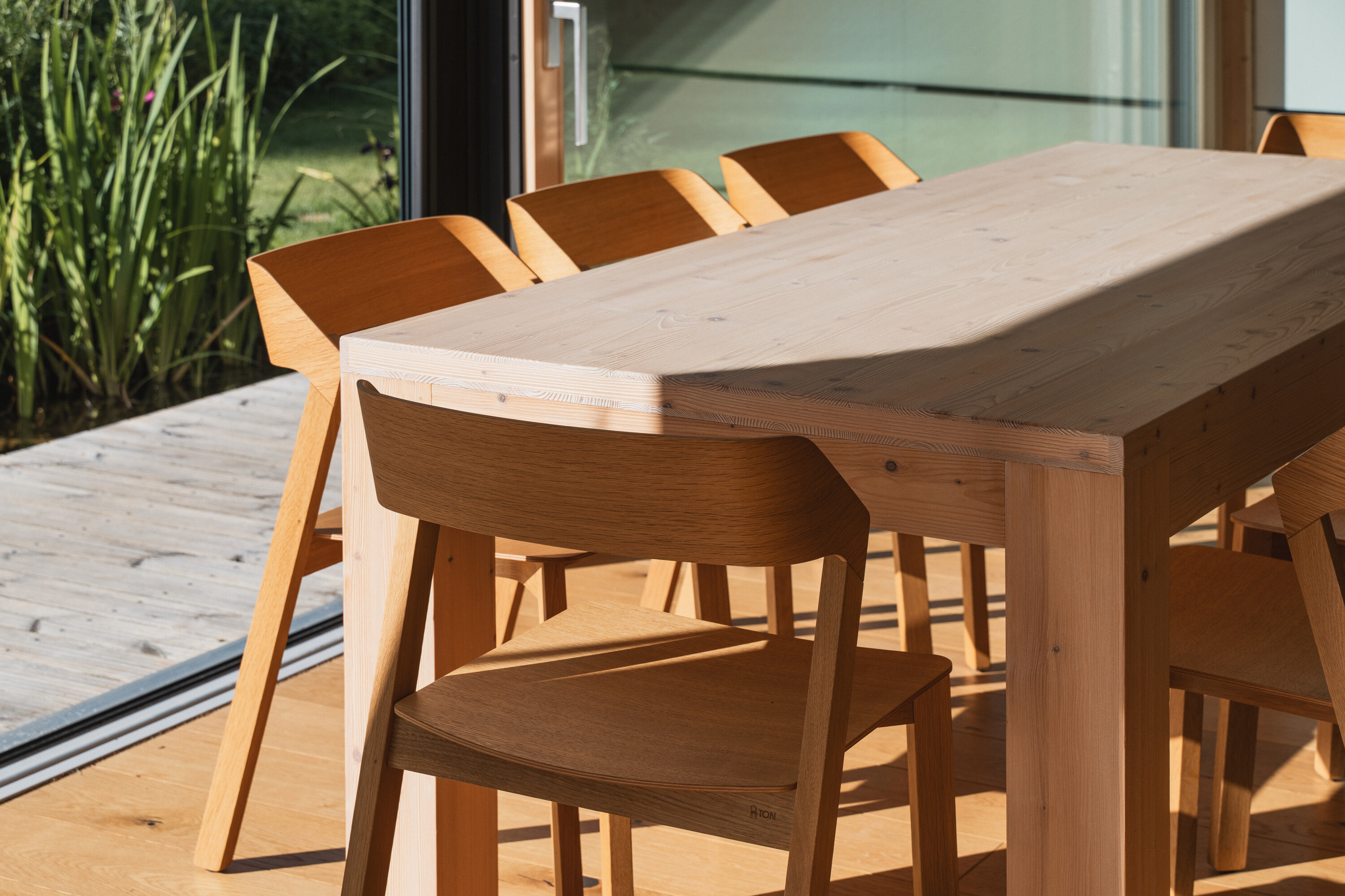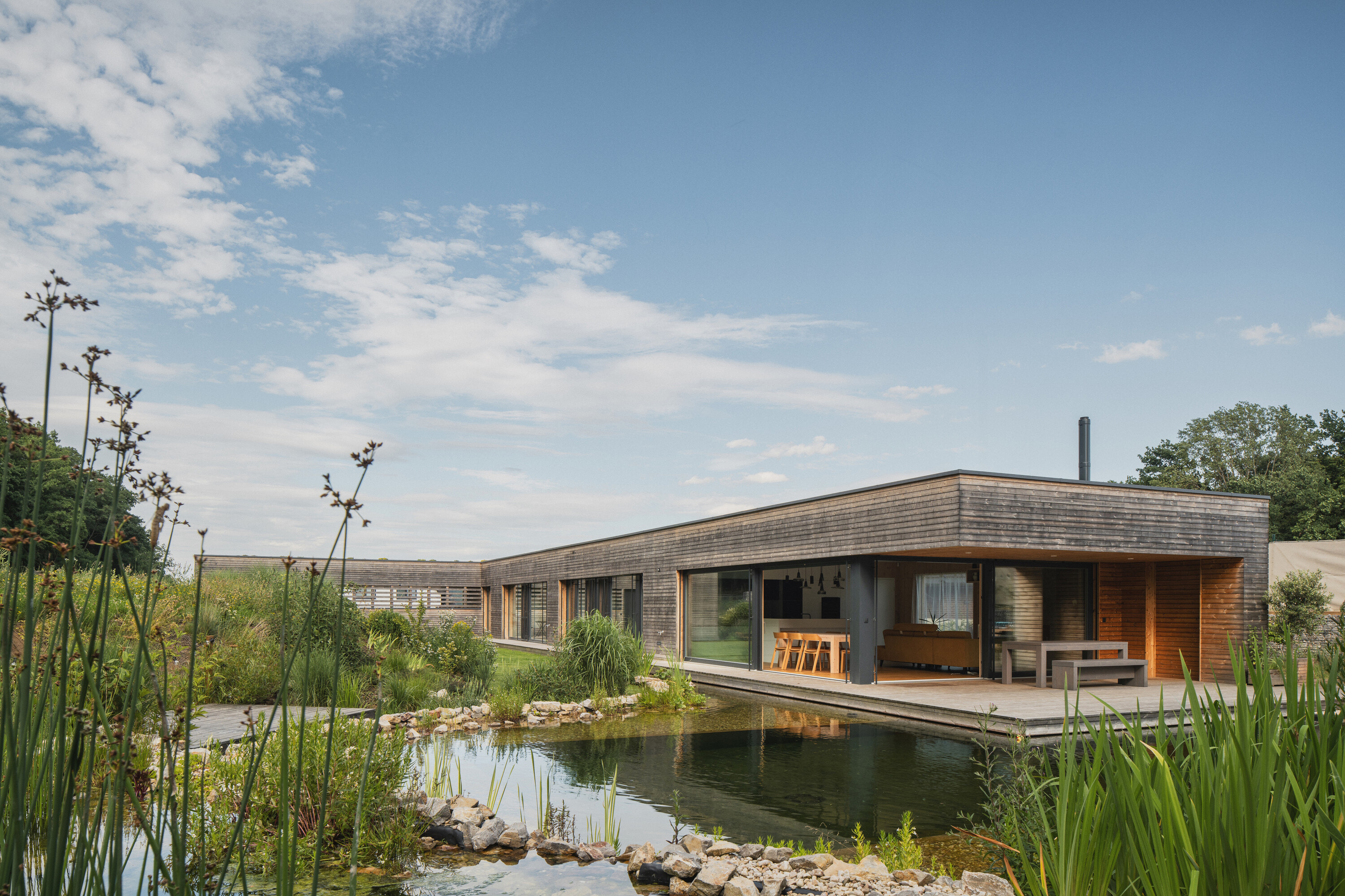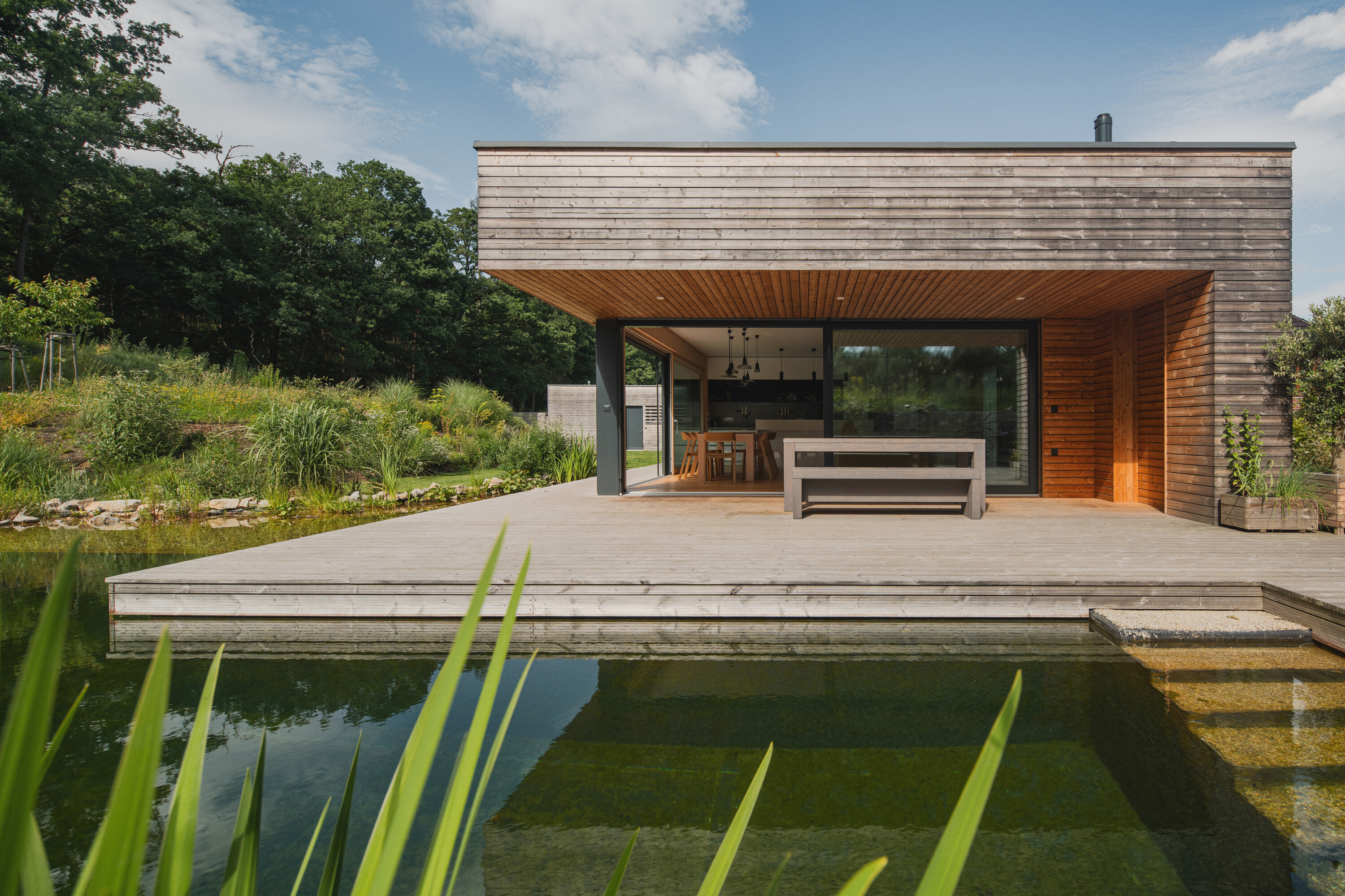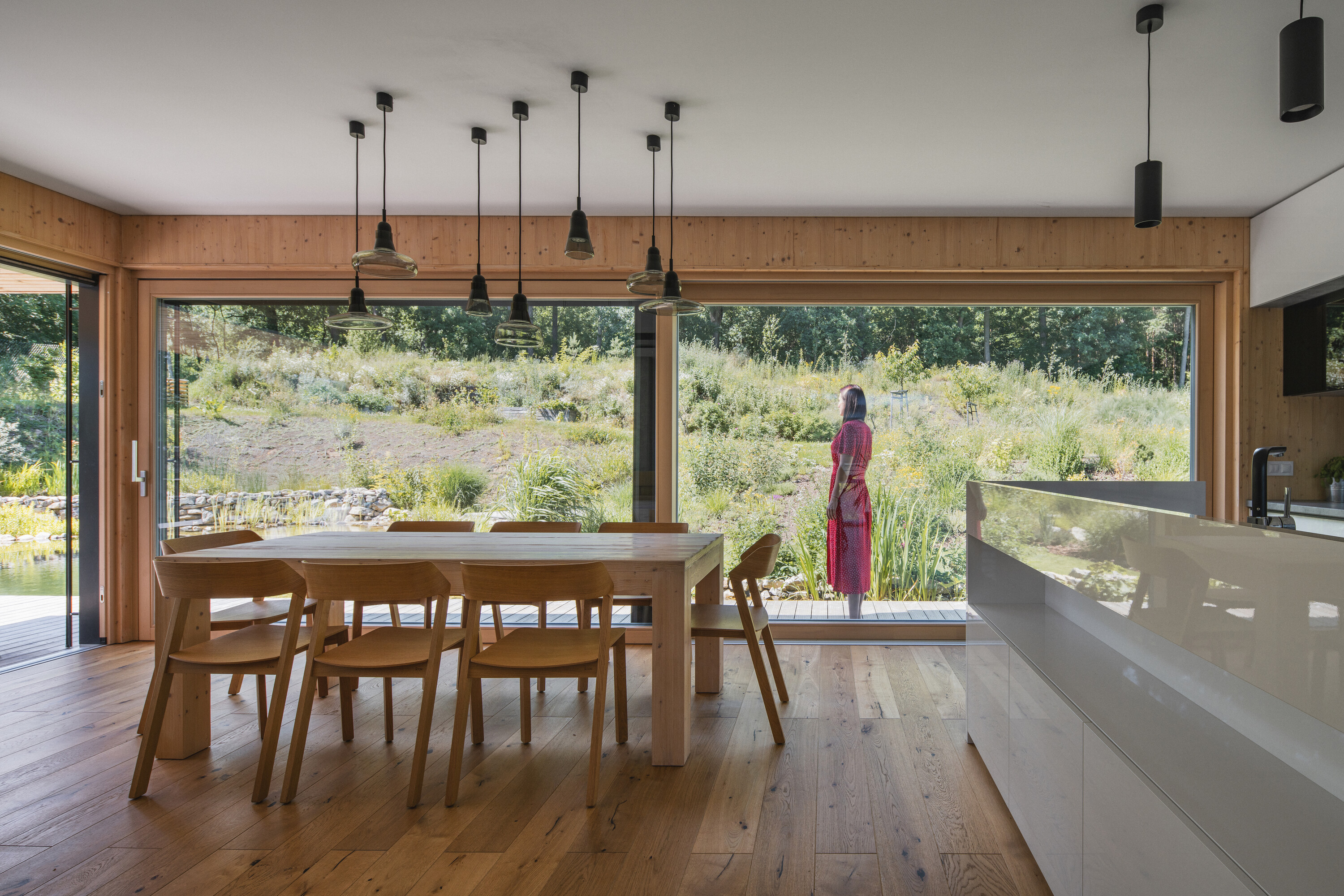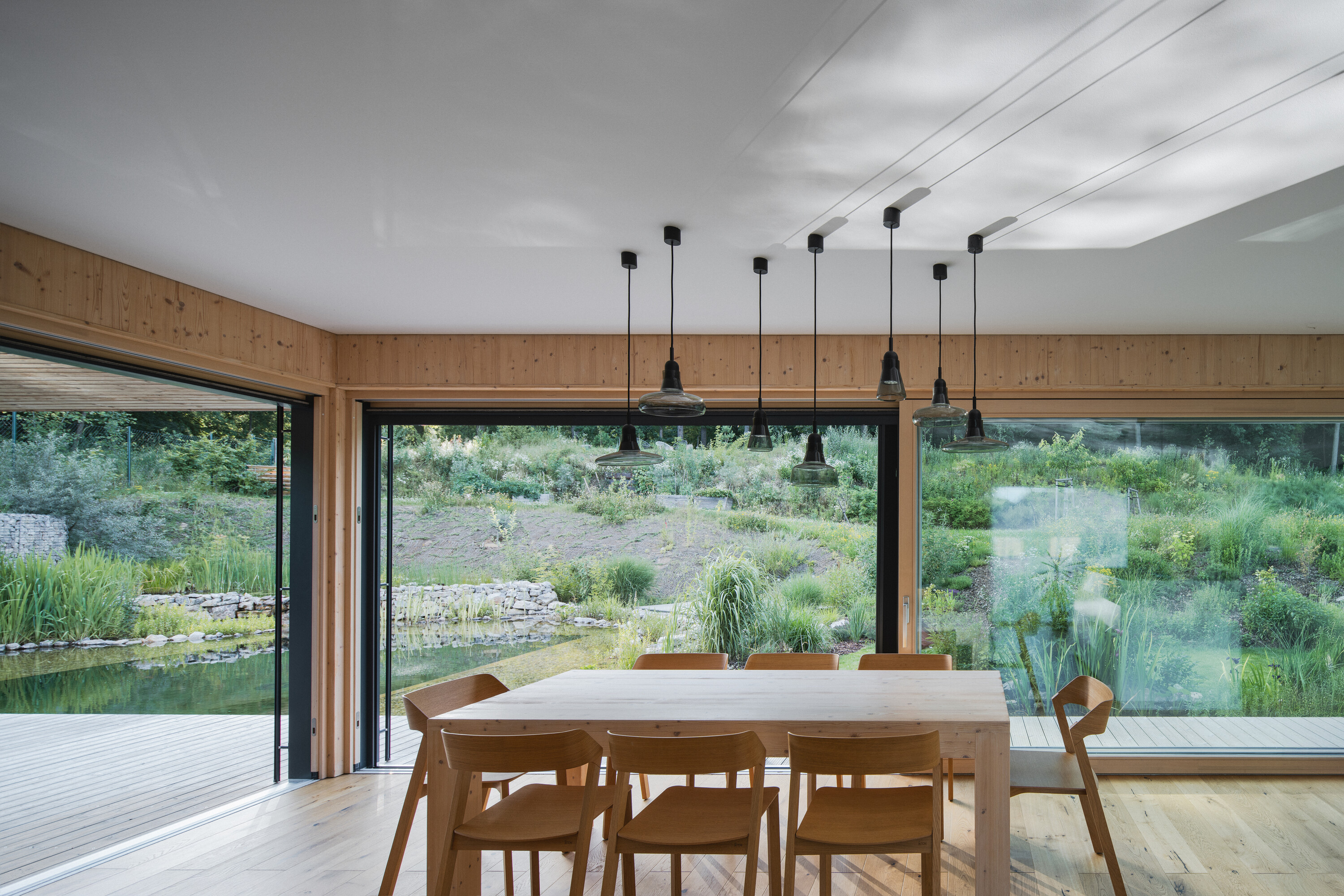 정원의 중심에는 수영 연못(schwimmteich)이 자리한다. 거실과 이어지는 목재 데크와 맞닿아 집의 일상 풍경을 구성하는 핵심 요소가 된다. 두 개의 대형 슬라이딩 포털(HS 포털)이 실내외의 경계를 지우며 거실–테라스–정원이 하나의 연속된 생활 장면을 완성한다.