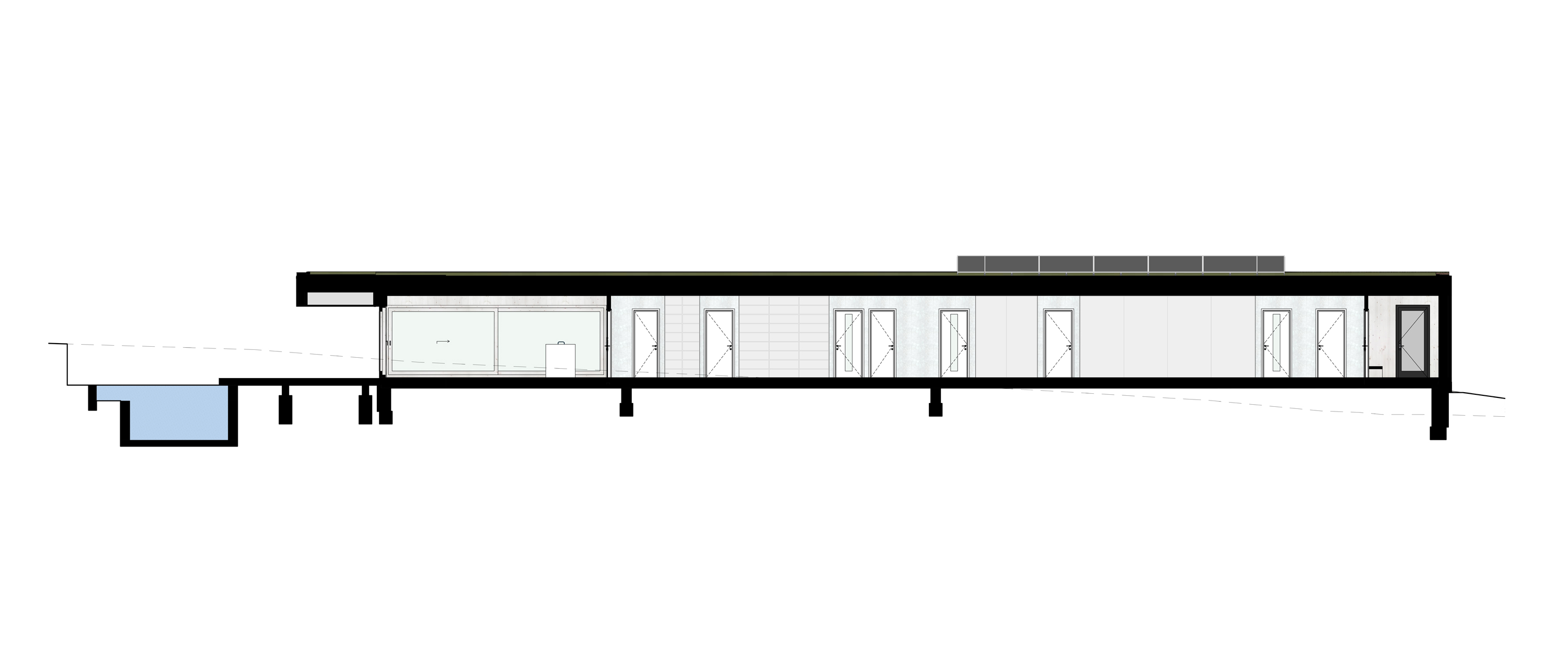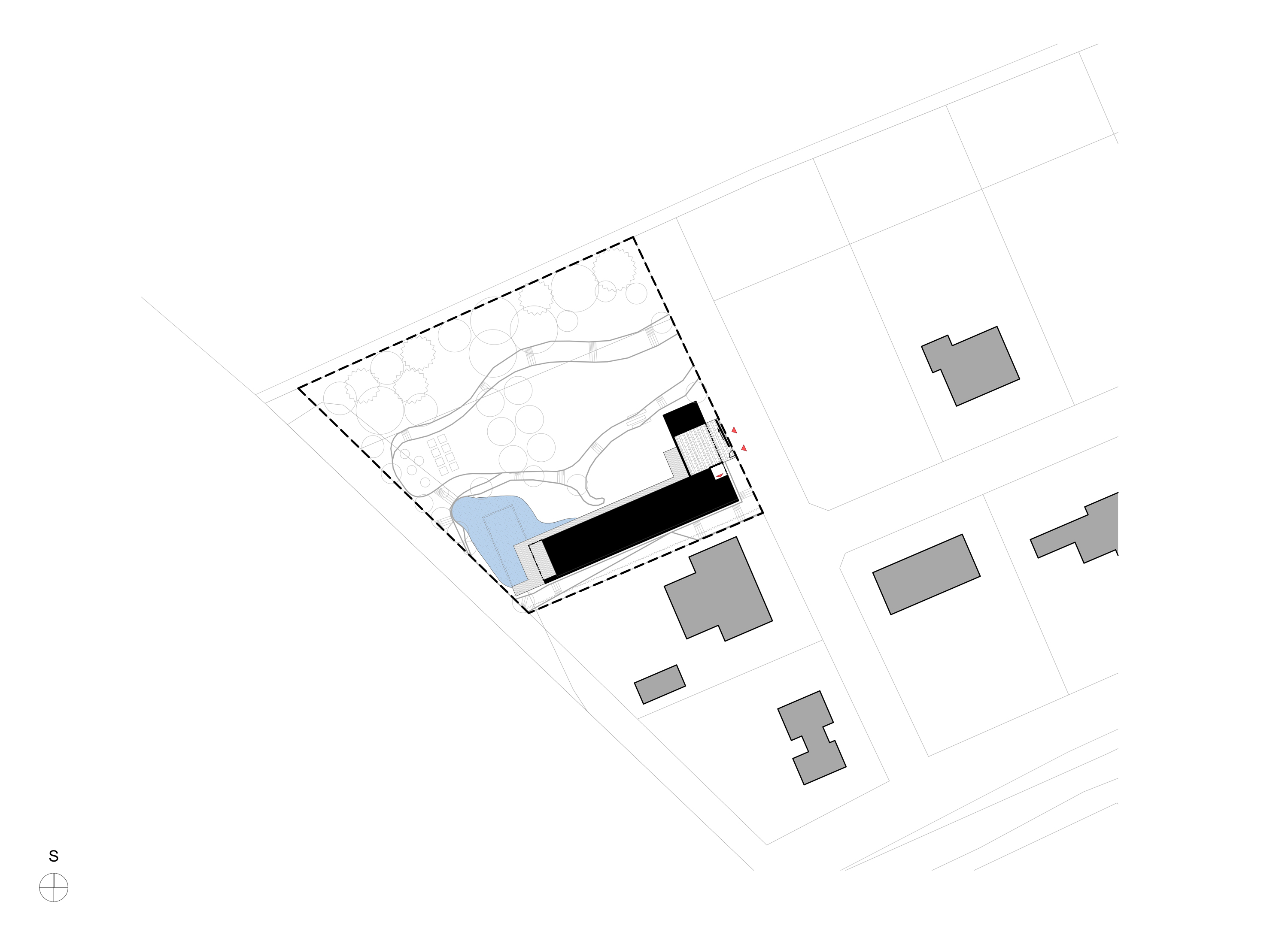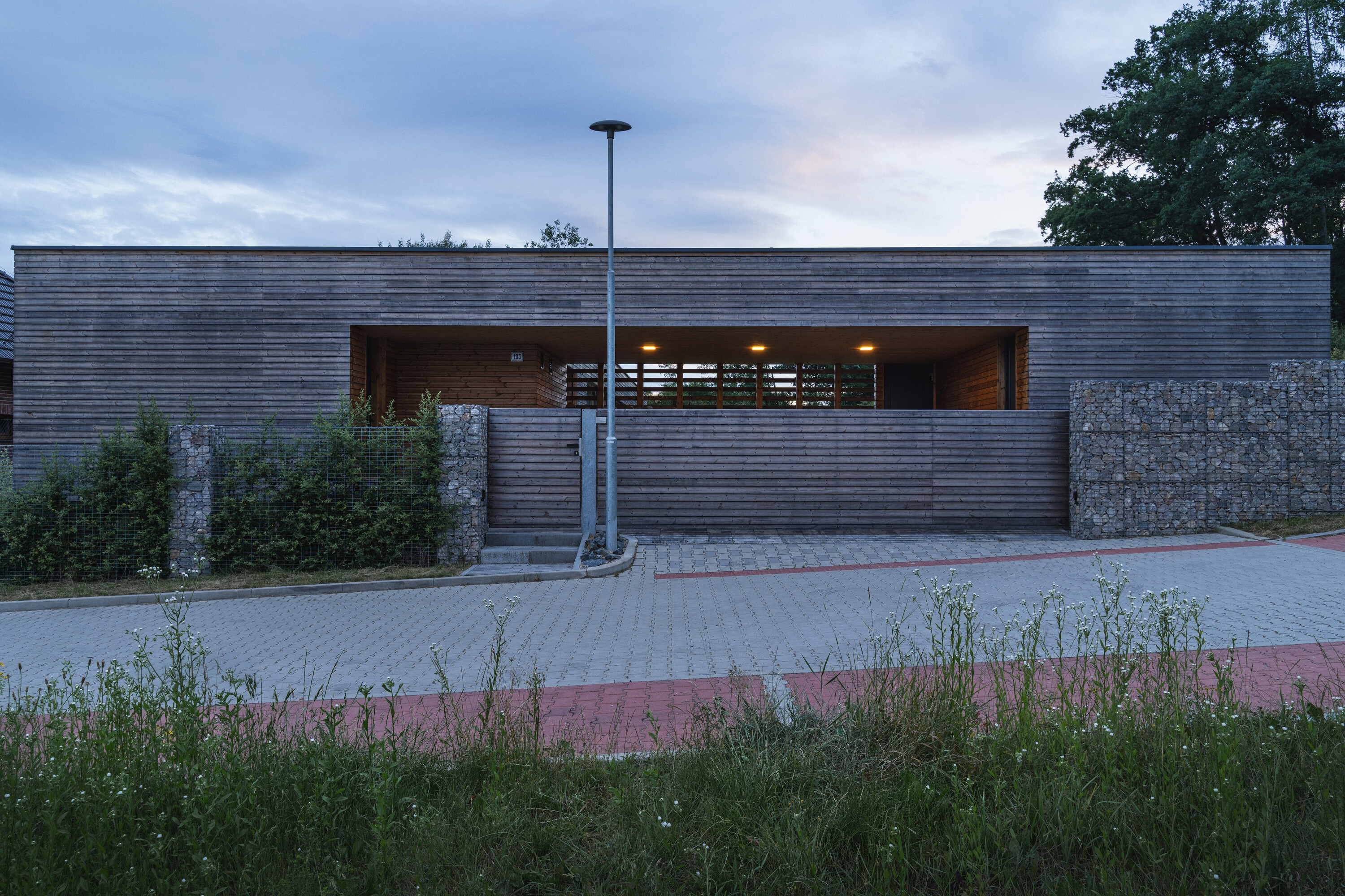 건물은 ㄱ자 배치로, 완만한 경사를 자연스럽게 흡수하며 구성된다. 도로 측에서는 낮고 폐쇄적인 인상을 주어 주변 마을과 조화를 이루고 사생활을 보호하지만, 내부로 들어서면 반대로 정원과 깊게 연결되는 열린 공간이 펼쳐진다. 경사지 위에 조성된 테라스형 정원은 숲으로 이어지며, 실내의 연장선처럼 작동한다.