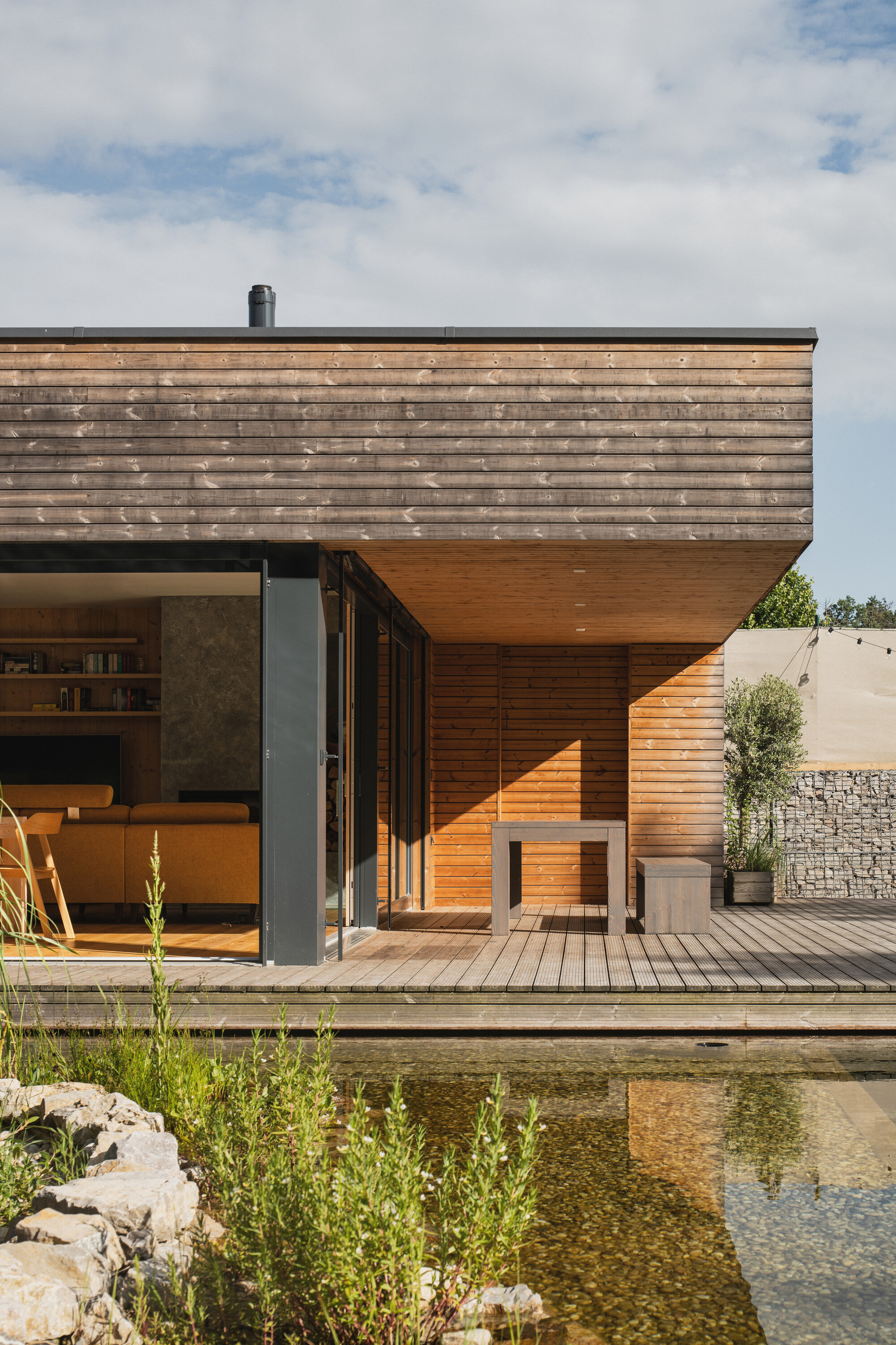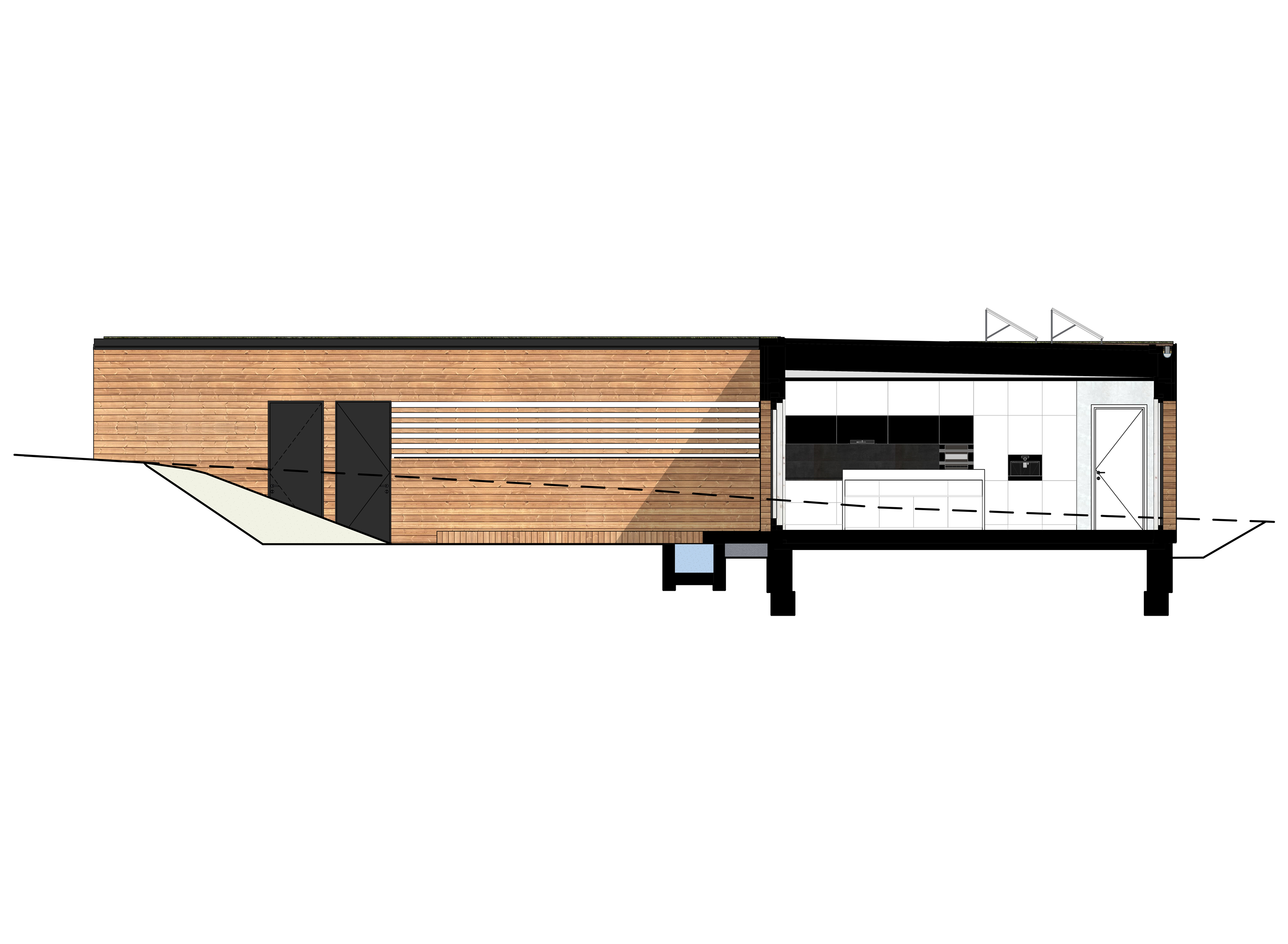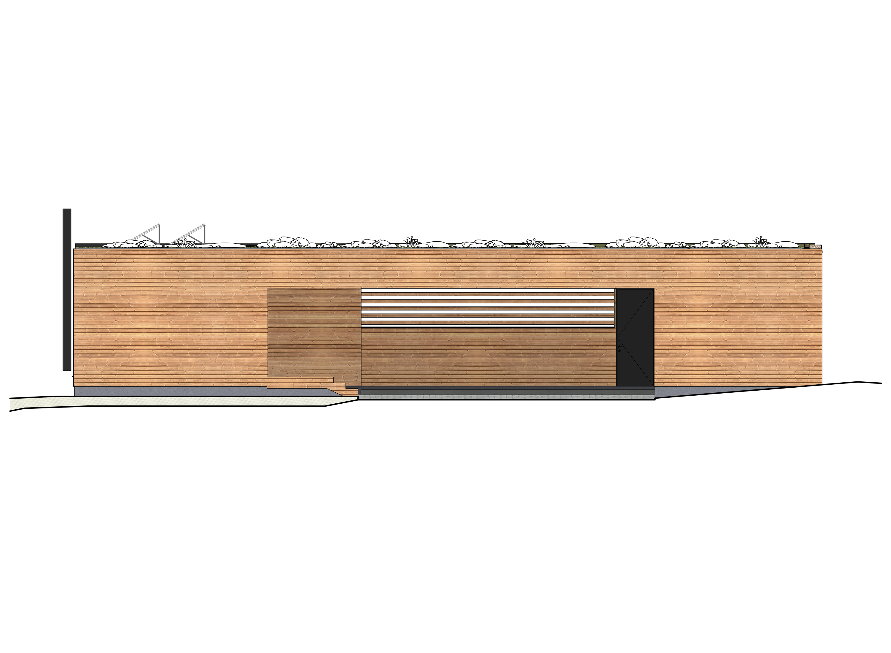 구조는 대면적 집성목 패널을 사용해 높은 강성과 단열 성능을 확보했고, 외장은 서서히 은은하게 변색되는 Thermowood를 사용해 주변 녹지와 자연스럽게 어우러진다. 단면 녹화 지붕은 열 환경을 완화하며 집을 지형 속에 스며들도록 만든다.