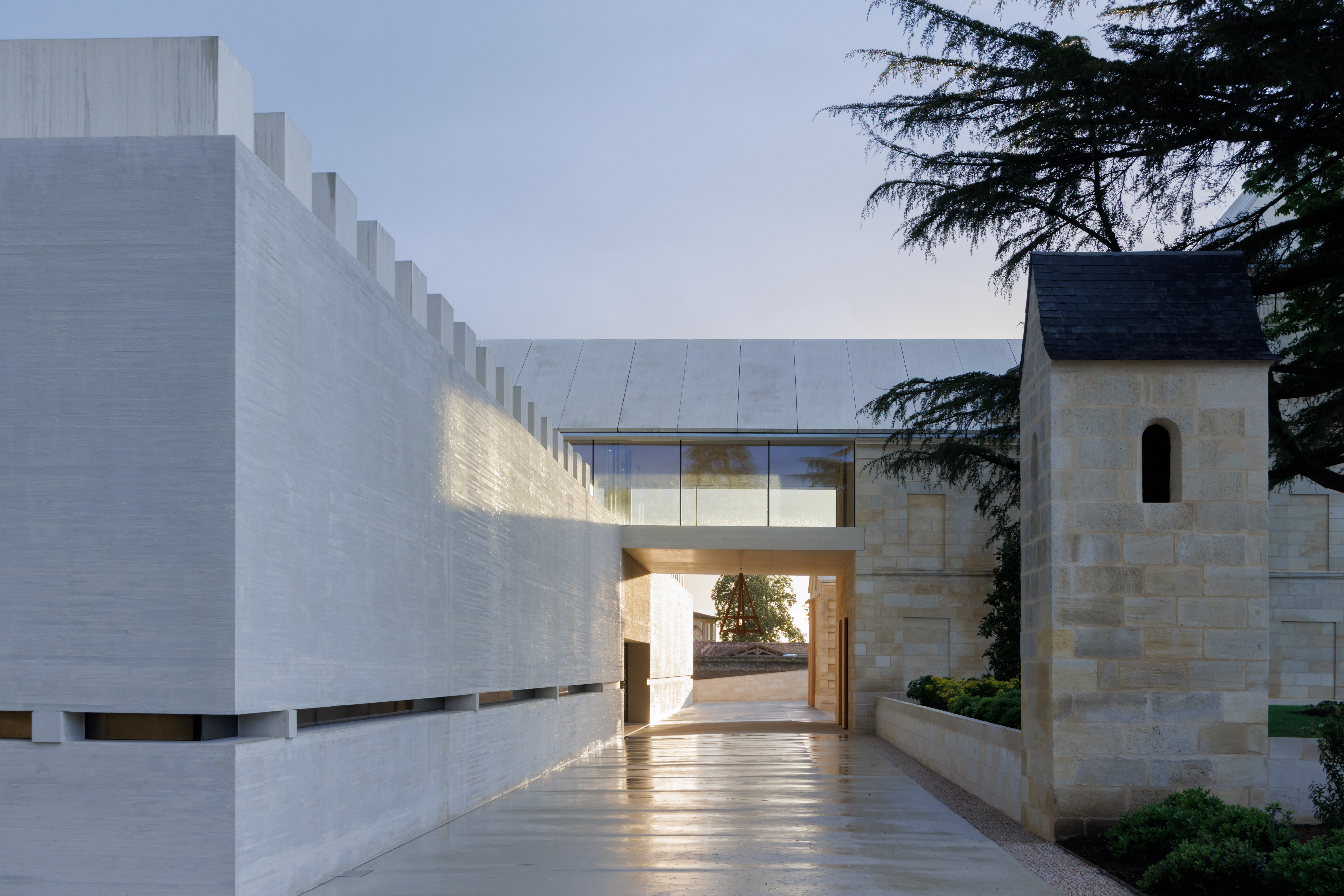 생트에밀리옹은 중세 수도원과 포도 재배 전통이 켜켜이 중첩된 지역이다. 건축가는 이 ‘건축적·조경적 직조물’ 속에 새 와이너리를 다시 놓는 방식으로 접근했다. 대상지는 지중해 기단이 드러나는 점토·석회암 지형의 고원부로, 인근에는 오래된 보호수림 성격의 마그델렌(Magdelaine) 공원이 자리한다. 이와 같은 맥락적 요소는 새 건축의 배치, 재료, 매스 구성에 깊이 영향을 주었다. 1845년에 지어진 기존 석조 주택은 보존 대상이었다. 건축가는 대부분의 창을 막아 입면을 ‘조용한 조각적 형태’로 만들고, 필요 기능에 따라 세 개의 새로운 창을 신중하게 배치했다. 기존 개구부는 매입된 충전재 뒤로 은은한 흔적만 남겨, 과거와 현재가 겹쳐 보이는 팔림프세스트적 표현을 의도했다.