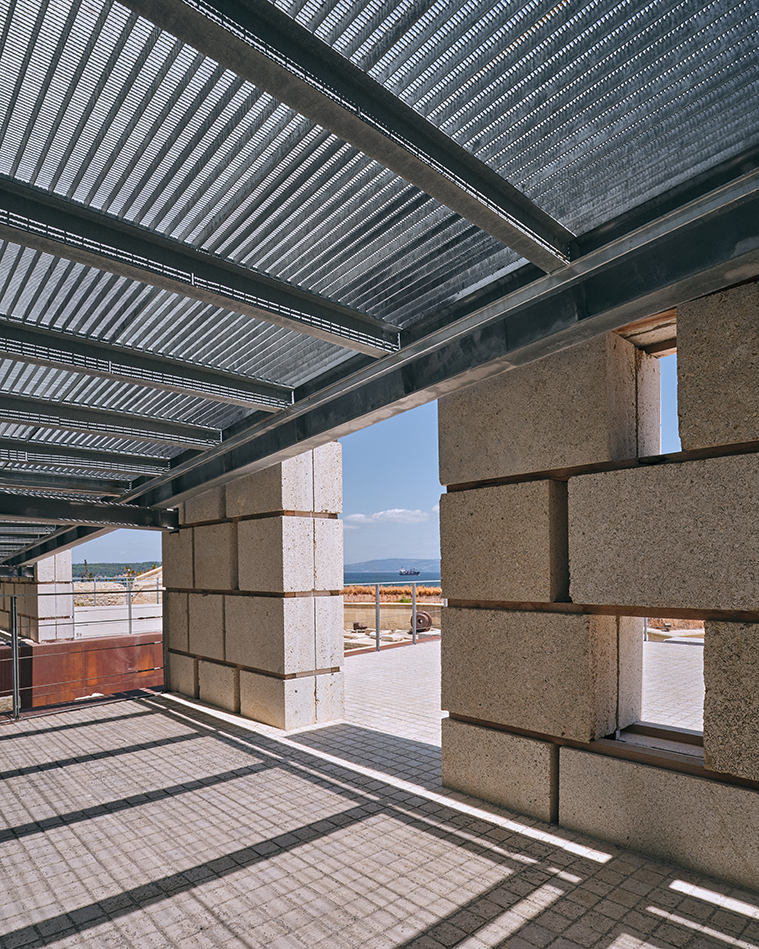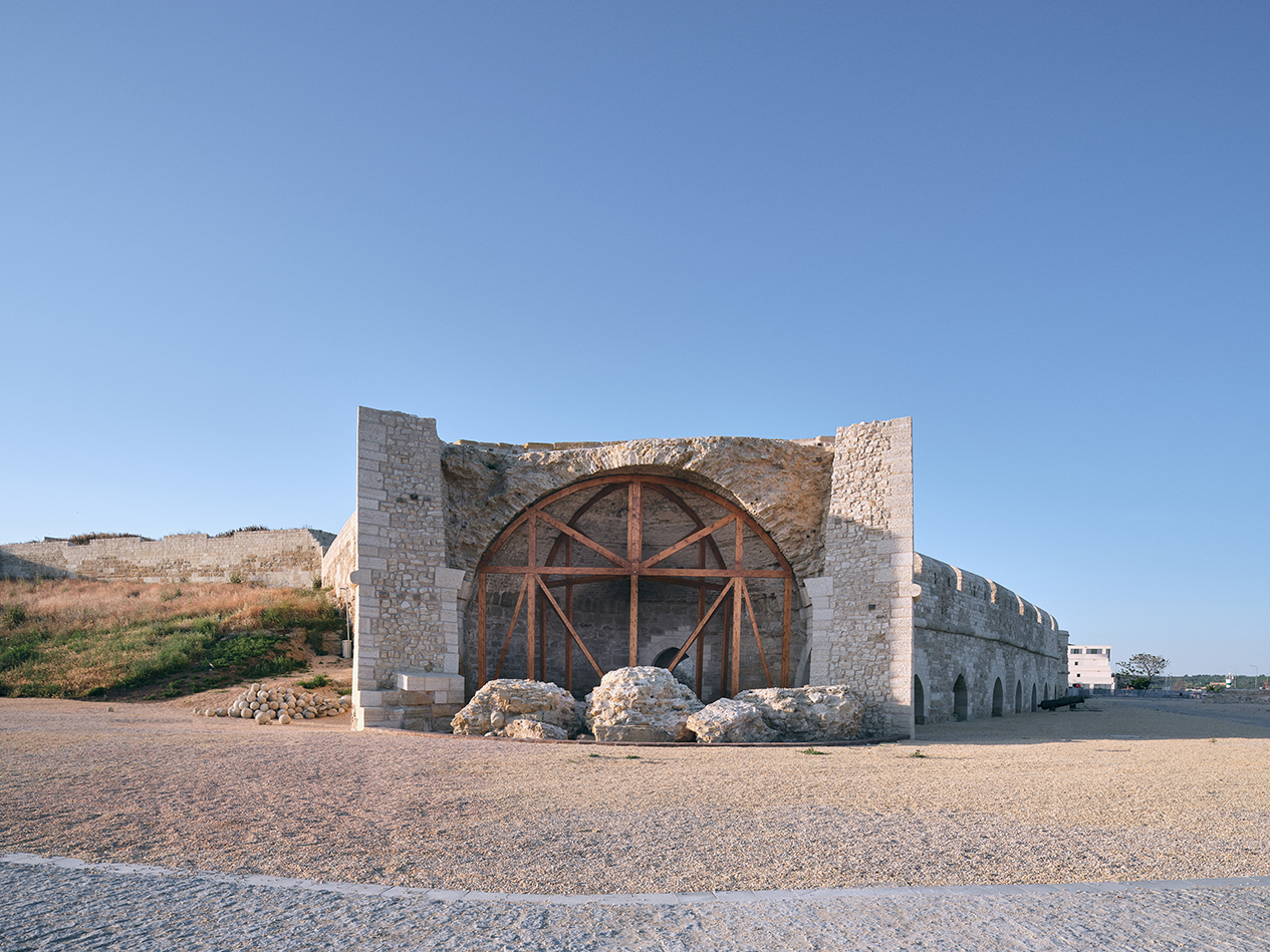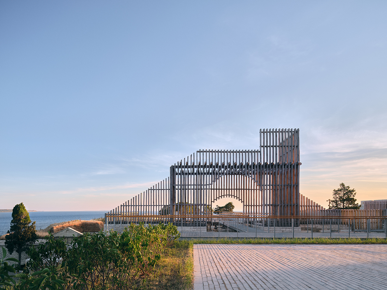 반면, 주 출입문과 일부 붕괴된 건물은 가벼운 목구조 실루엣으로 재해석되었다. 완전한 복원이 아닌 ‘암시적 재구성’을 통해 당시 형태를 상상하게 하며, 특히 입구의 세로로 슬릿 처리된 목재 프레임은 햇빛과 공기가 스며드는 투명한 문장(門狀)의 공간을 만든다. 이는 모든 복원 행위가 반드시 ‘되돌릴 수 있어야 한다’는 원칙을 강조하며, 오스만 시대의 건축 기술을 현대적으로 최소 반영한 개입으로 남는다.