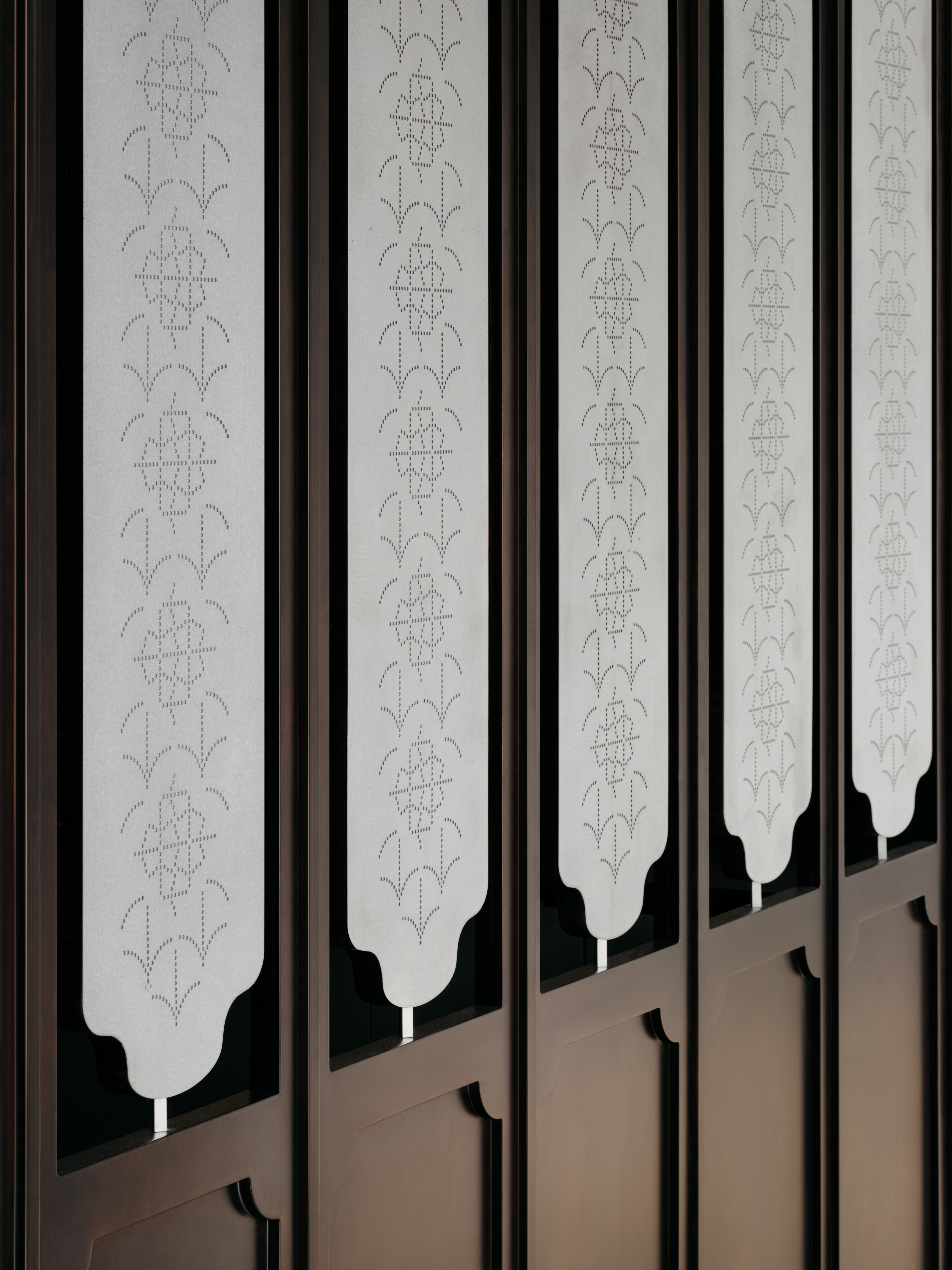 당밍단 북측 파사드는 기존 공간에서 발견된 헌 목재문을 탄화 기법으로 가공해 새로운 질감을 입혔다. 손때 묻은 목질의 온기를 드러내는 방식이다. 반면 남측 파사드는 도금 천공 강판으로 구성해 전통성과 현대성이 대비되는 표정을 만든다. 천공 패턴은 곤곡 배우의 초승달 장식을 추상화한 형태로, 가까이에서 보면 서예적 리듬감을 지닌다. 기존 건물의 조각창은 장식적 보존이 아닌, 새로운 구조 속에서 의미를 갱신하는 서사적 요소로 재배치되었다.