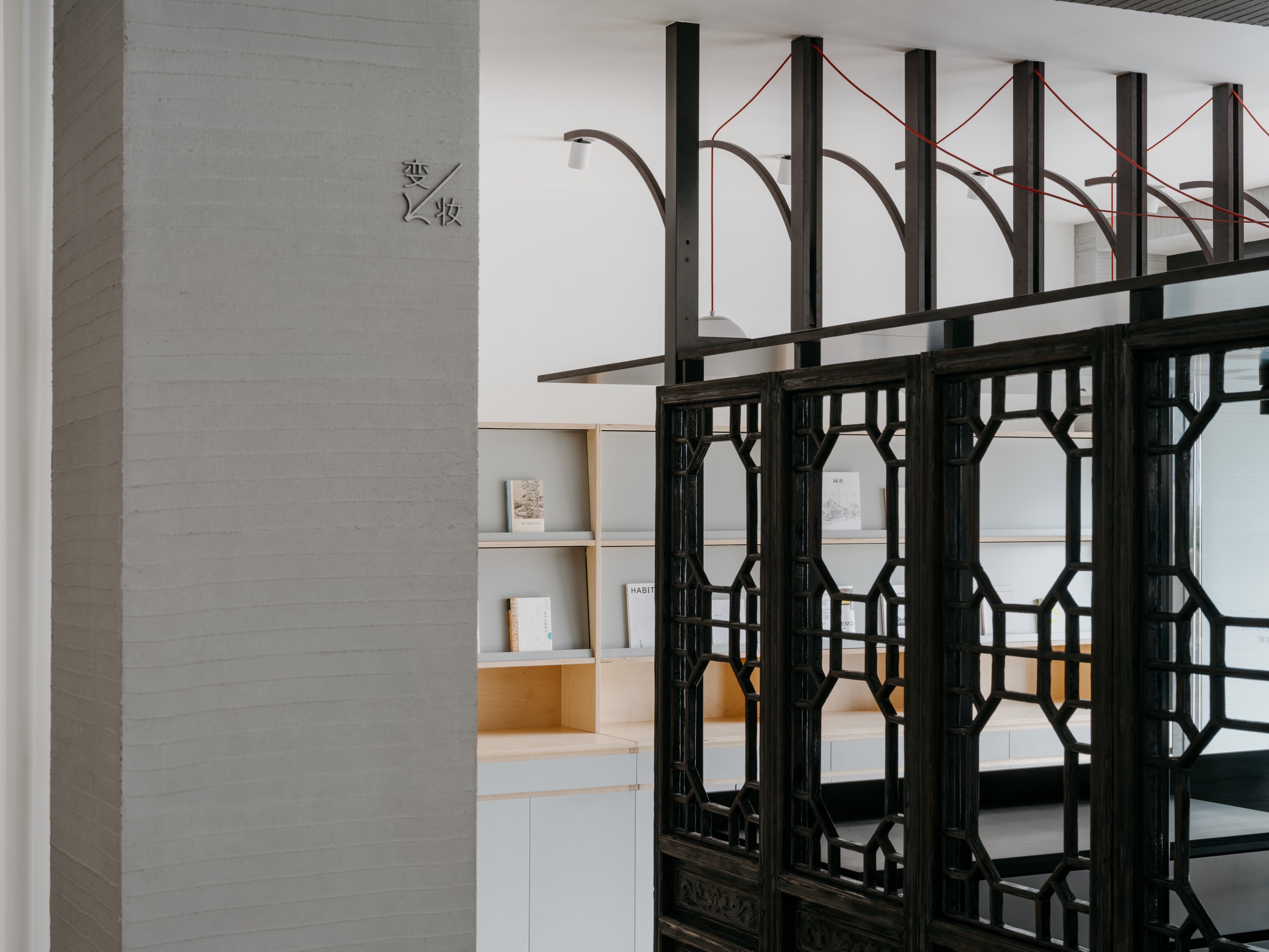 디자인의 출발점은 박물관 소장품 중 하나인 ‘당밍단’—중국 남방 지역의 전통 오페라가 이동공연에 사용하던 휴대식 무대 파사드였다. 이 장치는 가벼운 구조, 조립과 해체가 가능한 구성, 이동을 전제로 한 유연성이 특징이다. 본 프로젝트는 당밍단의 형식을 모방하는 대신, 그 구조적 사고방식을 현대적 공간 장치로 번역한다. 서점의 중심에는 약 7㎡ 규모의 새로운 당밍단을 배치했다. 네 개의 서로 다른 재료를 사용한 파사드가 상징적 경계를 형성하며, 책방 내 다양한 프로그램(전시, 낭독회, 소규모 공연)을 유연하게 수용하는 핵심 장치로 작동한다.