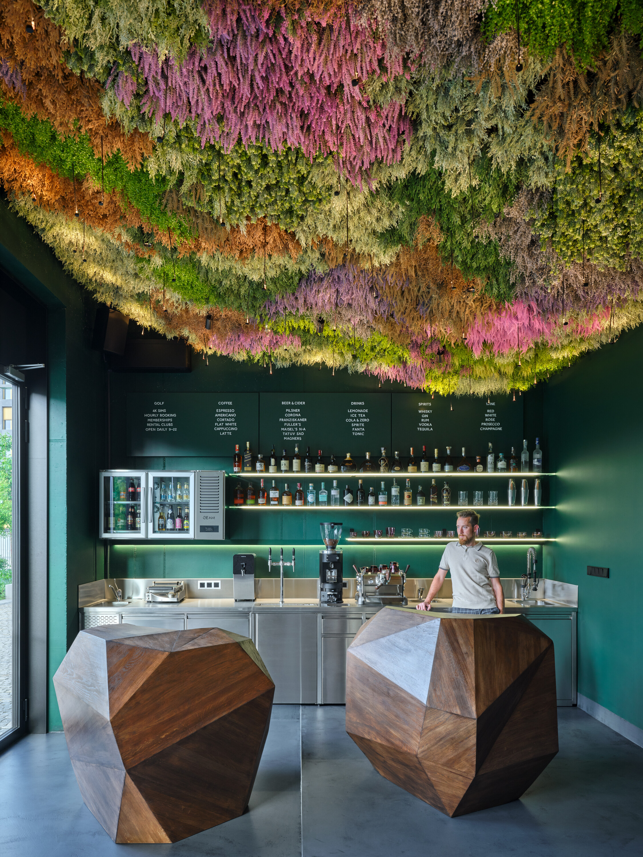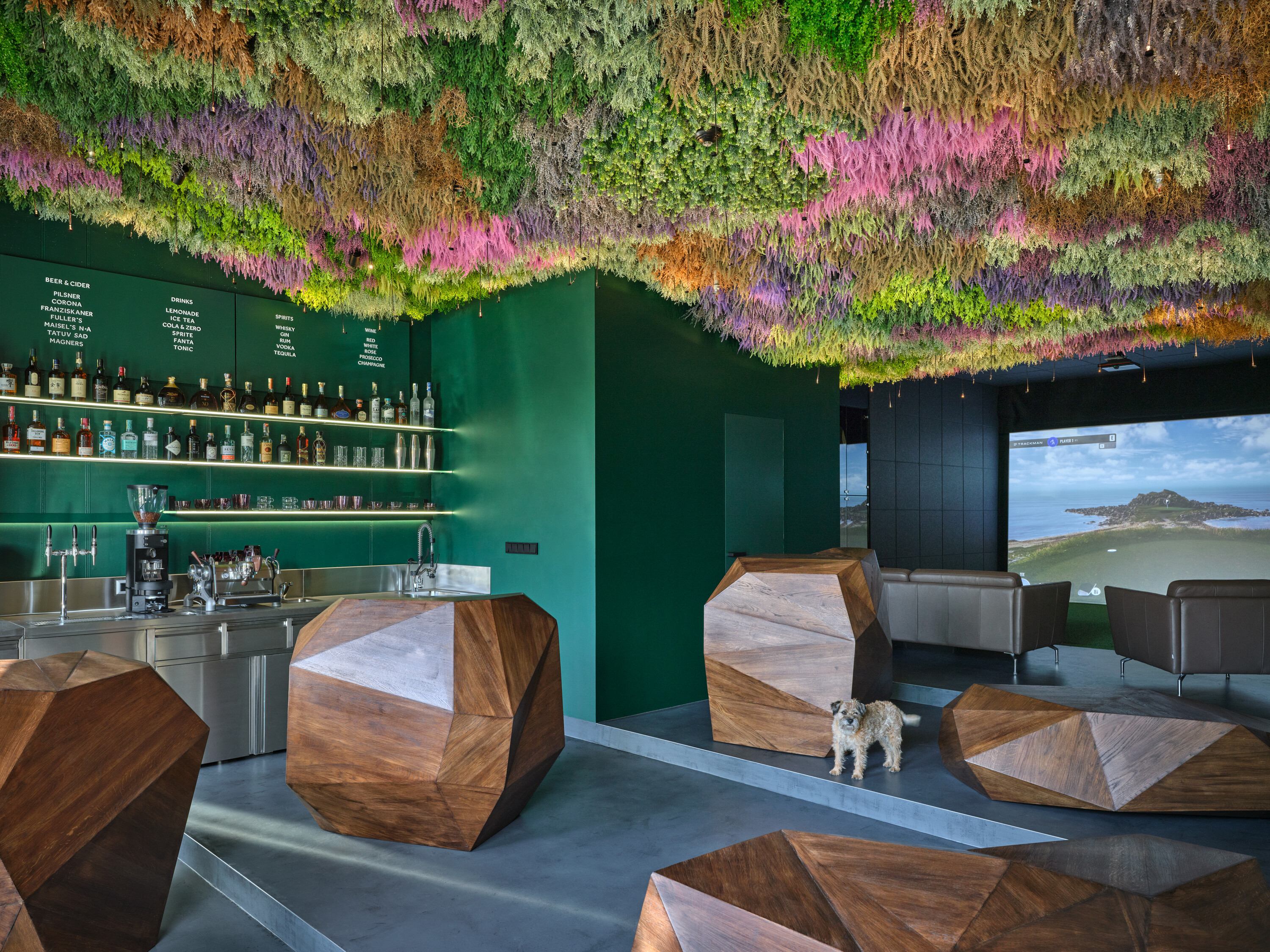 디자인의 출발점은 골프의 발상지이자 거친 자연 풍광으로 유명한 스코틀랜드 하이라랜드다. 건축가는 테마 장식이 아닌, 자연의 구조·색·기류를 실내에 구현하는 데 집중했다. 천장에는 헤더(heather) 군락을 연상시키는 설치물이 파도처럼 이어지며 공간 전체에 빛과 그림자의 결을 만든다. 바닥에는 단차를 둔 플랫폼과 다섯 개의 ‘돌’ 오브제가 놓여, 풍경적 모티프와 디자인 요소가 자연스럽게 연결된다. 콘크리트, 목재, 짙은 녹색톤으로 이루어진 절제된 재료 구성은 실내 풍경에 차분한 리듬을 부여하며, 사용자 경험을 위한 배경으로 조용히 존재한다.
