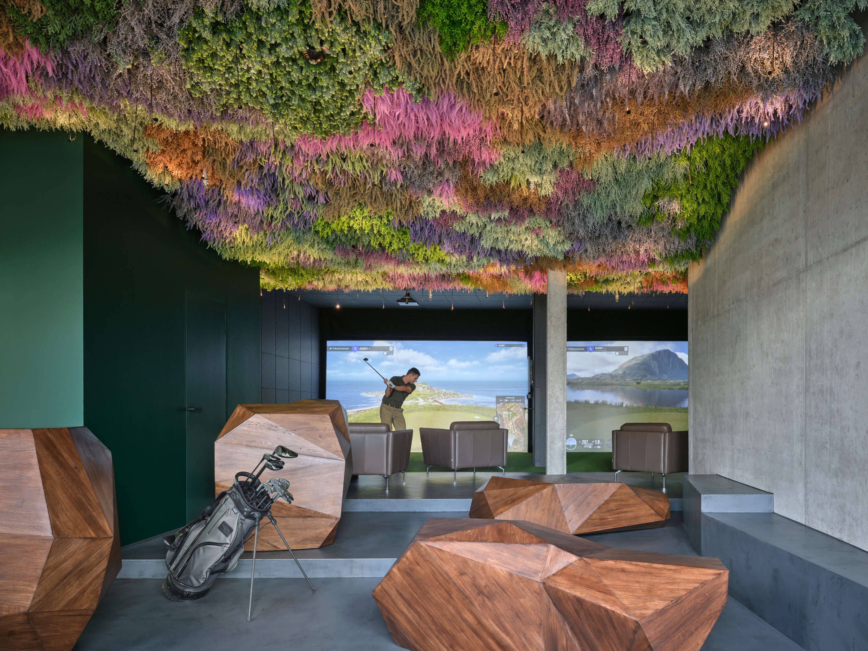 동선은 단순하고 명확하다. 입구의 바와 리셉션을 지나면 편안한 완충 공간이 이어지고, 그 너머에 프로젝트의 핵심인 트랙맨 IO(TrackMan IO) 시뮬레이터 두 대가 배치된다. 실제 클럽과 공을 사용하는 이 시스템은 레이더와 카메라로 스윙을 분석해 비거리, 궤적 등 모든 데이터를 즉시 시각화한다. 골프 입문자에게는 친절한 피드백을, 그룹 사용자에게는 게임적 재미를, 상급자에게는 정교한 통계를 제공하며, 누구나 자신의 속도로 공간을 즐길 수 있다.