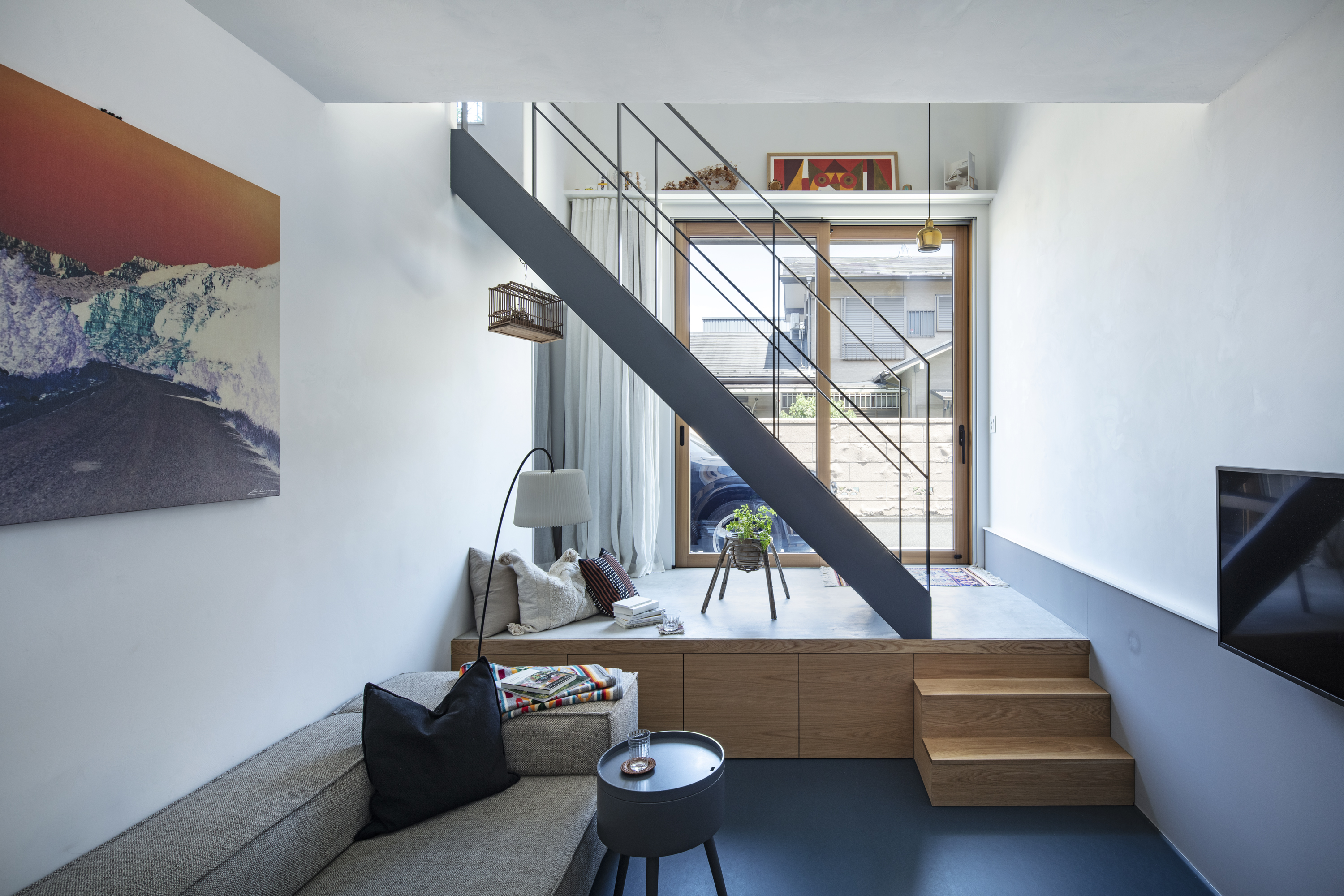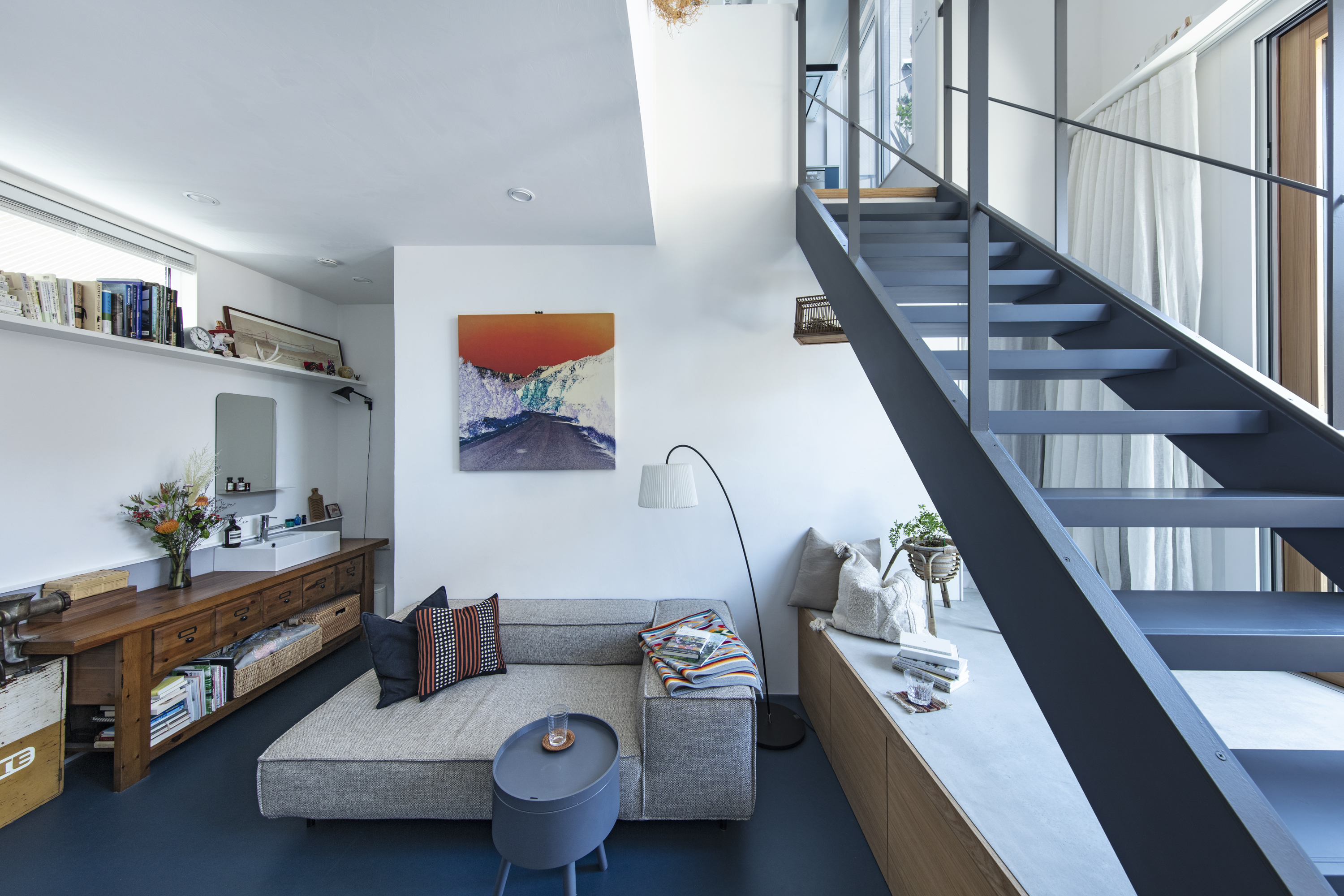 재료 선택 역시 일상의 감각을 고려했다. 벽과 천장은 습도 조절에 유리한 석회 미장으로 마감했고, 거실 바닥에는 관리가 용이한 리놀륨을 적용했다. 전체 색채는 화이트를 기본으로 하되, 부부가 선택한 네이비 그레이를 바닥, 계단, 빌트인 가구 곳곳에 반복해 공간의 리듬을 형성했다.