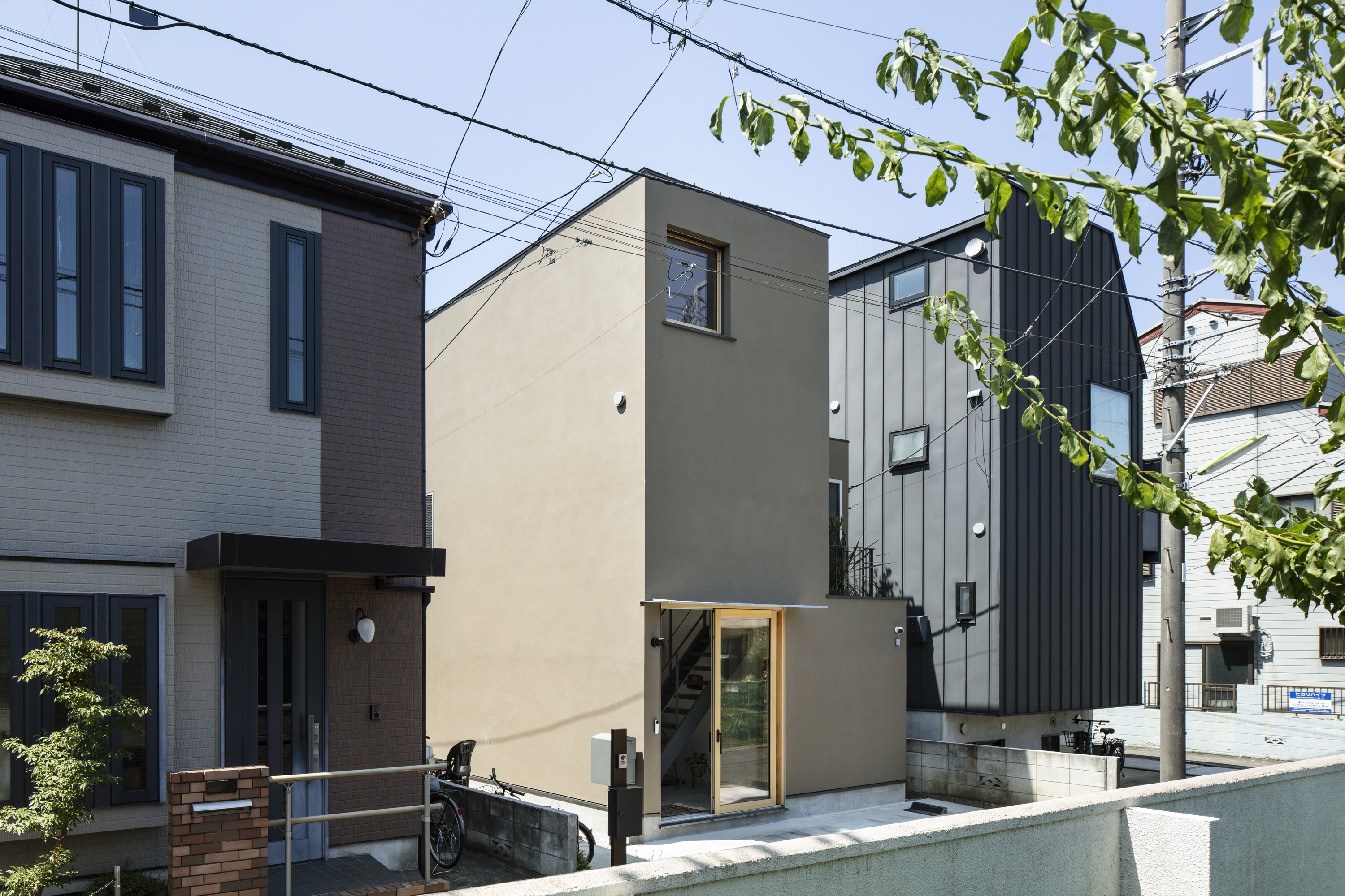 설계의 핵심은 층을 관통하는 공간적 연결이다. 수직 동선을 적극적으로 활용해 빛과 바람, 공기가 집 안 깊숙이 스며들도록 했고, 부부 각자의 영역은 느슨하게 이어지면서도 서로의 사생활을 존중하는 구조로 계획했다. 북측 사선제한으로 형성된 건물 매스는 2층과 3층에 녹지 테라스를 품고 있으며, 이 테라스들은 실내와 외부를 완충하는 중간 영역으로 작동한다. 흙빛 계열로 마감된 L자형 파사드는 도시 풍경 속에 입체적인 녹지의 표정을 더한다.