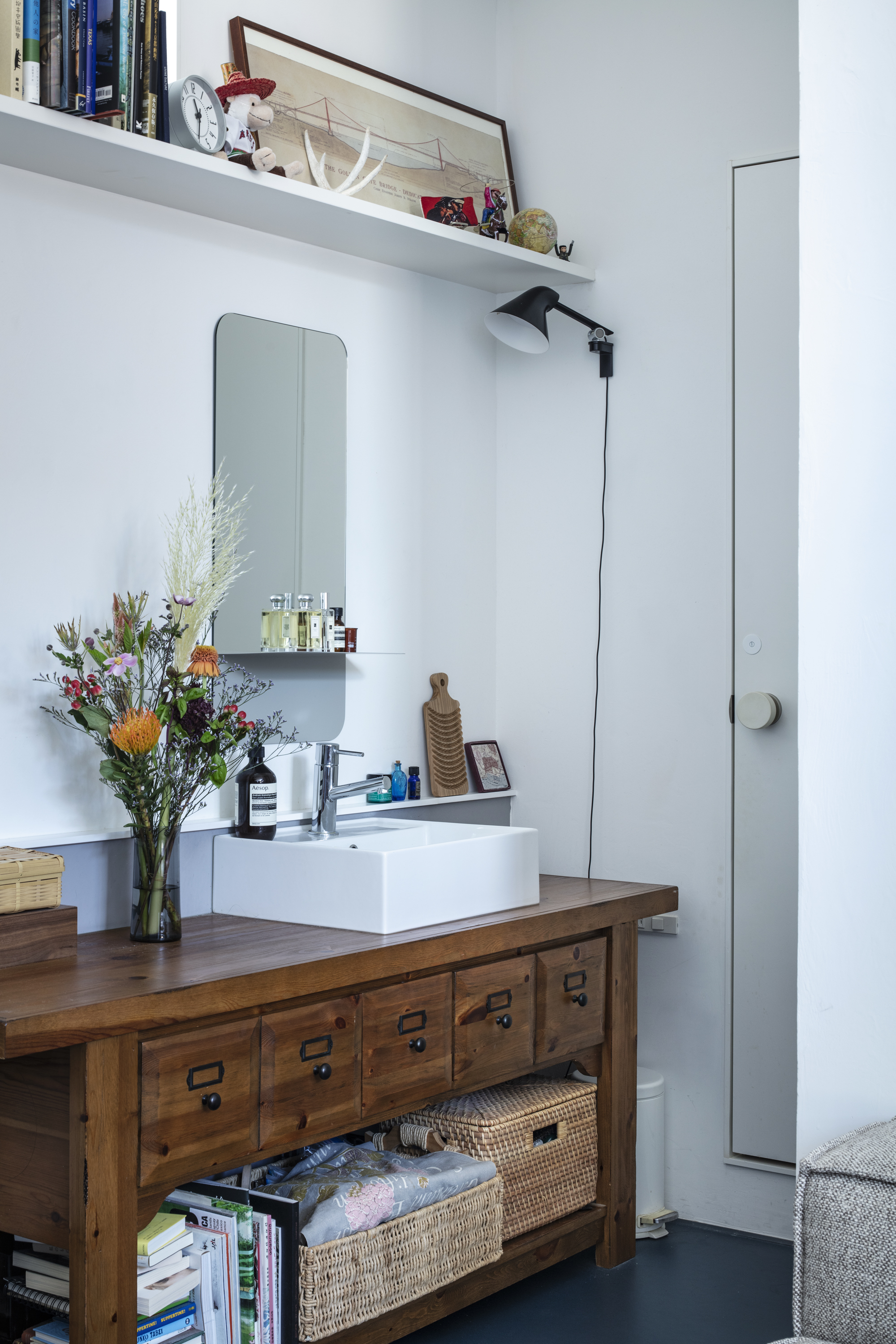 이 집에는 부부의 시간이 고스란히 스며 있다. 미국에서 사용하던 빈티지 가구를 새로운 공간에 맞게 재해석해, 대형 선반은 주방 카운터의 일부로, 콘솔 테이블은 세면대 하부장으로 다시 사용했다. 오래된 목재의 질감은 공간에 깊이를 더하고, 예술 작품과 책, 소장품들은 장식이 아닌 생활의 일부로 자연스럽게 배치되었다.