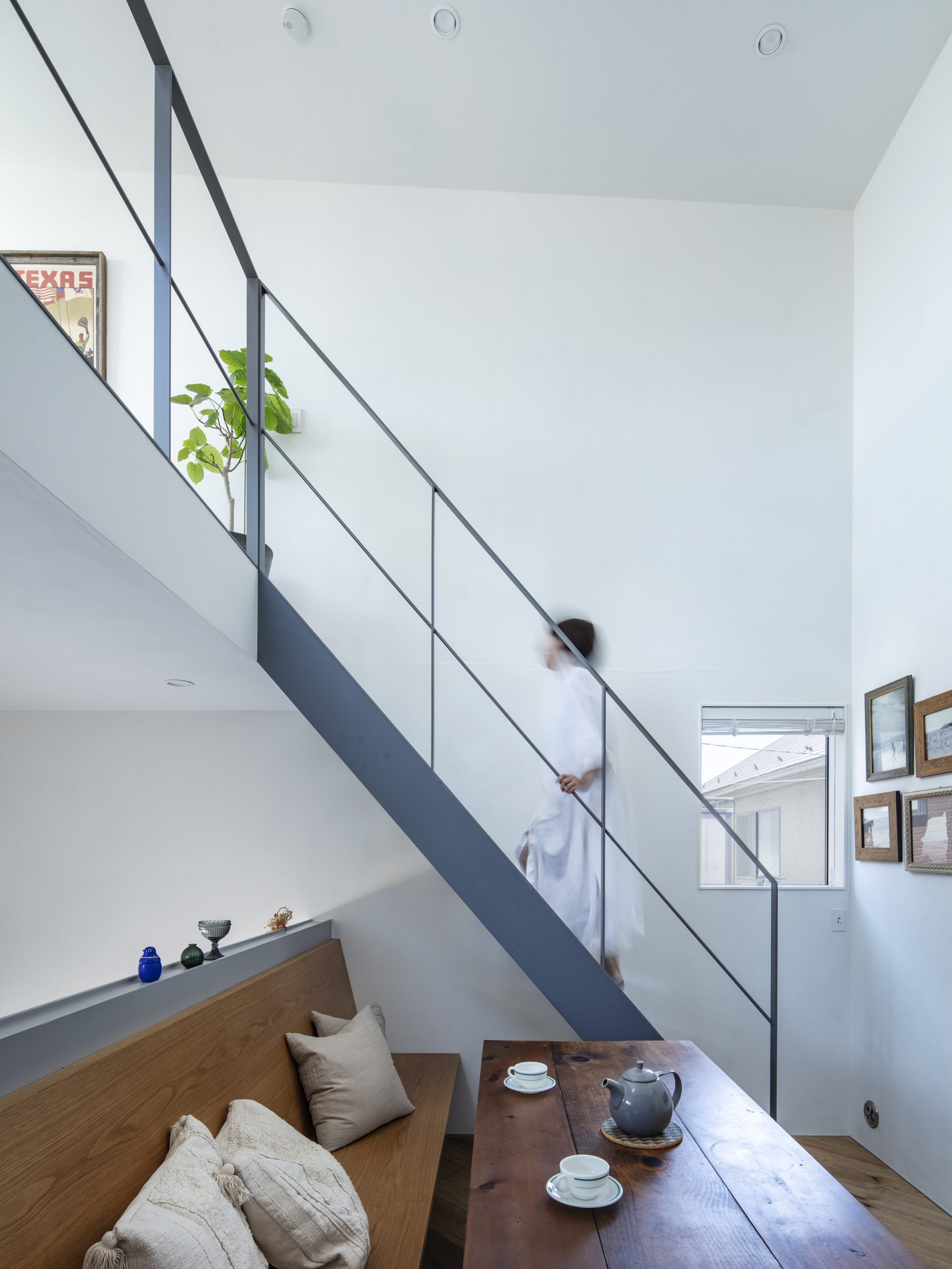 외부 환경을 자연스럽게 끌어들이기 위해 현관에는 목재 프레임의 대형 슬라이딩 유리문을 설치했다. 상부로 이어지는 개방형 계단과 마주하는 이 요소는 시선을 막지 않으면서도 실내와 외부 사이를 부드럽게 분리하는 장치다. 현관 바닥은 외부 지면보다 약 40cm 낮게 설정되어, 도심에 있으면서도 한 단계 내려앉은 듯한 차분한 감각을 만든다. 동시에 시선은 자연스럽게 들어 올려져 외부와의 연결감은 유지된다.