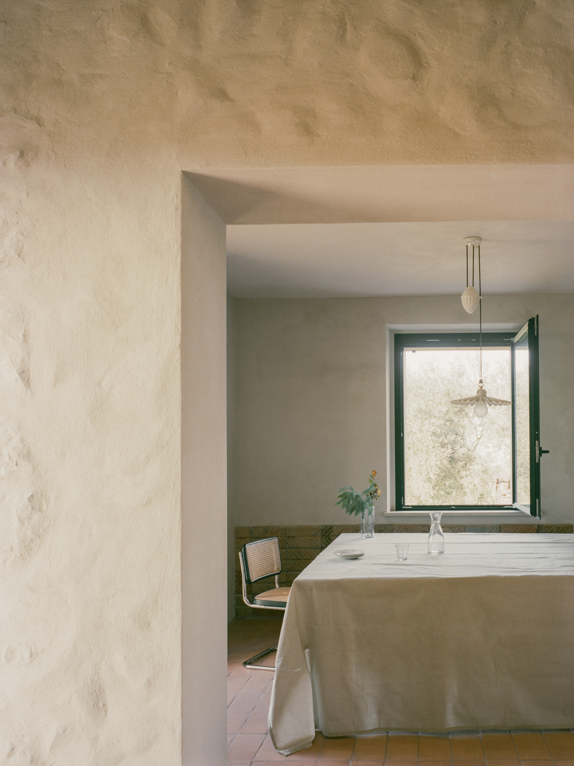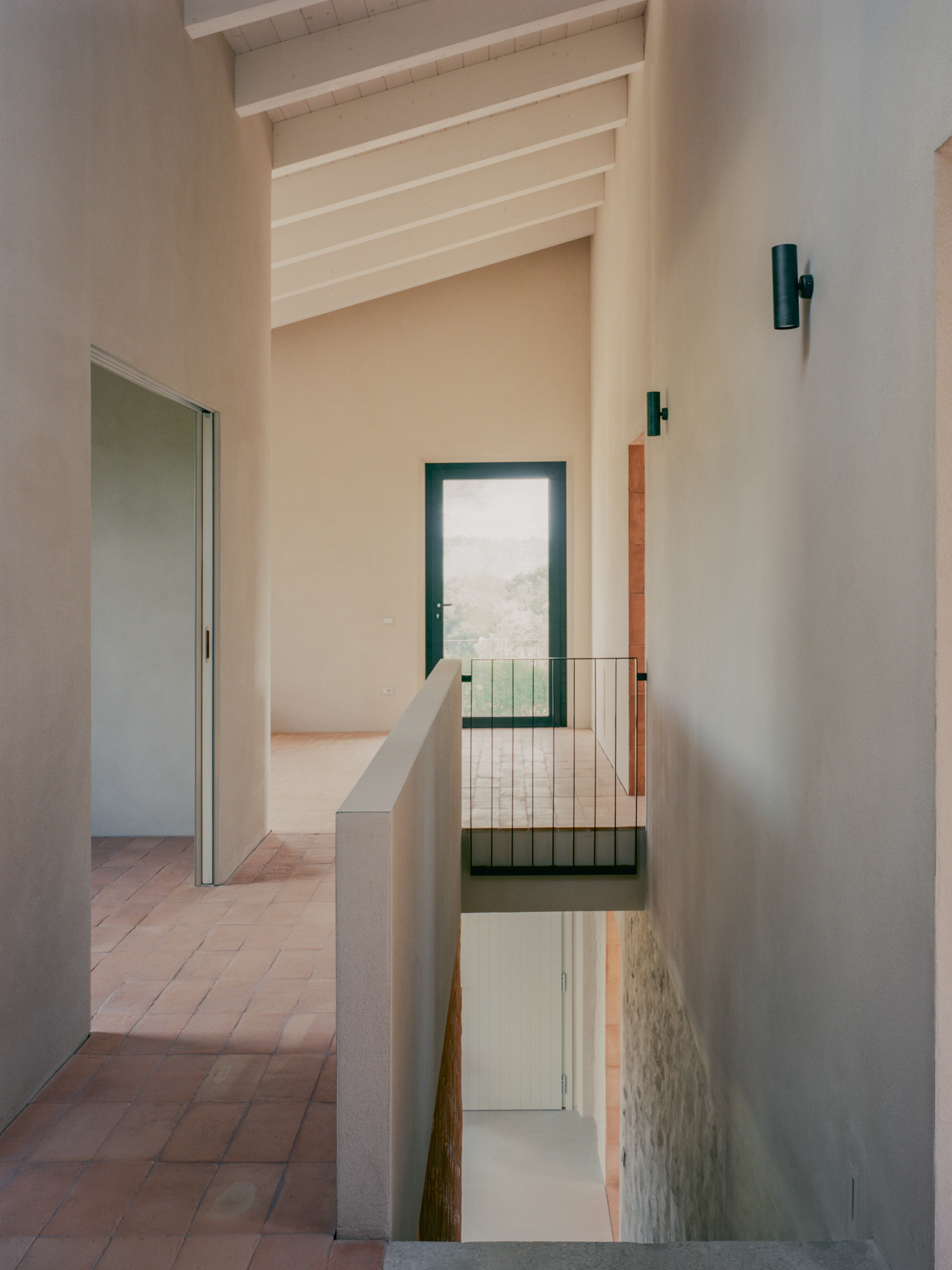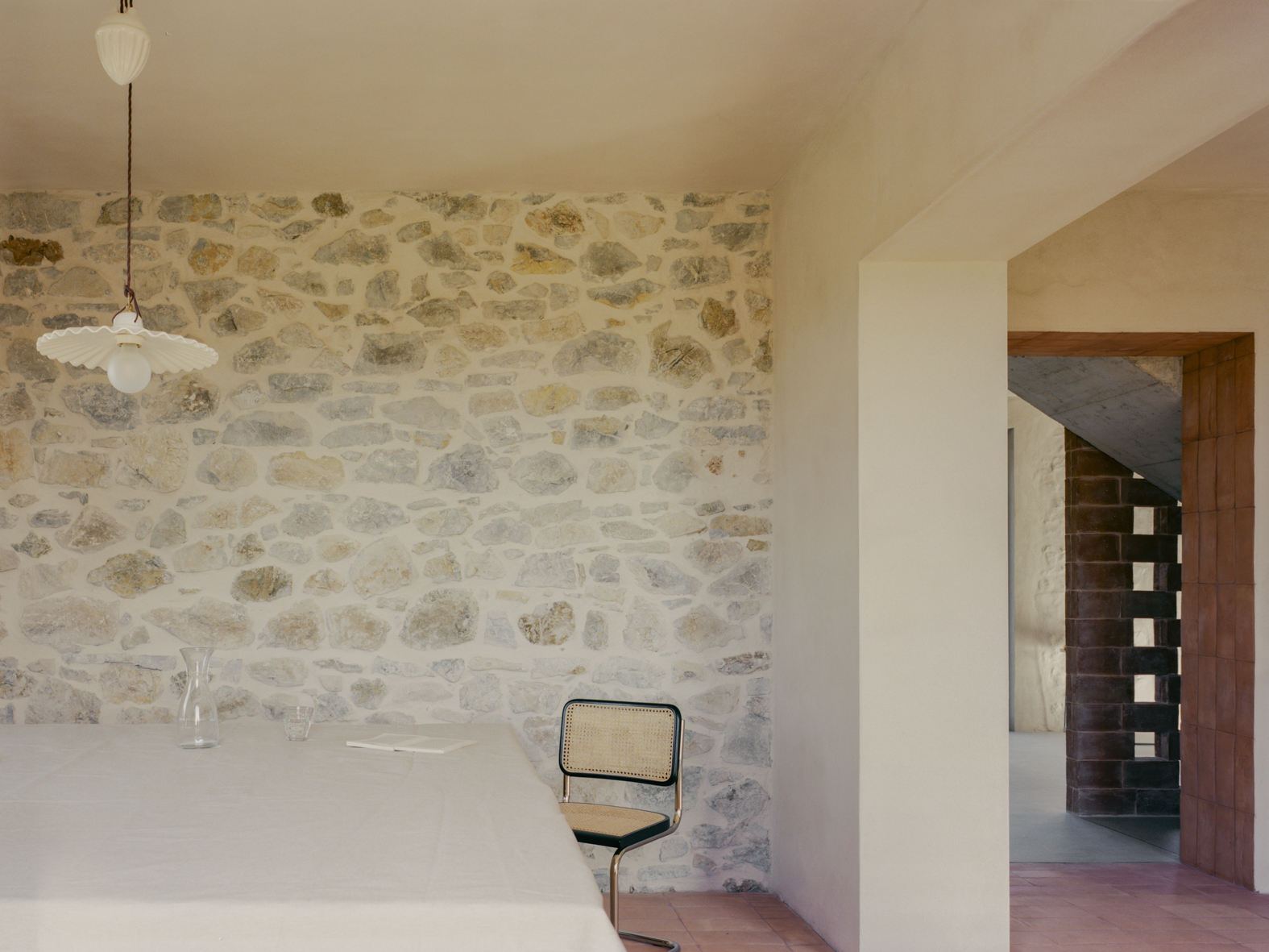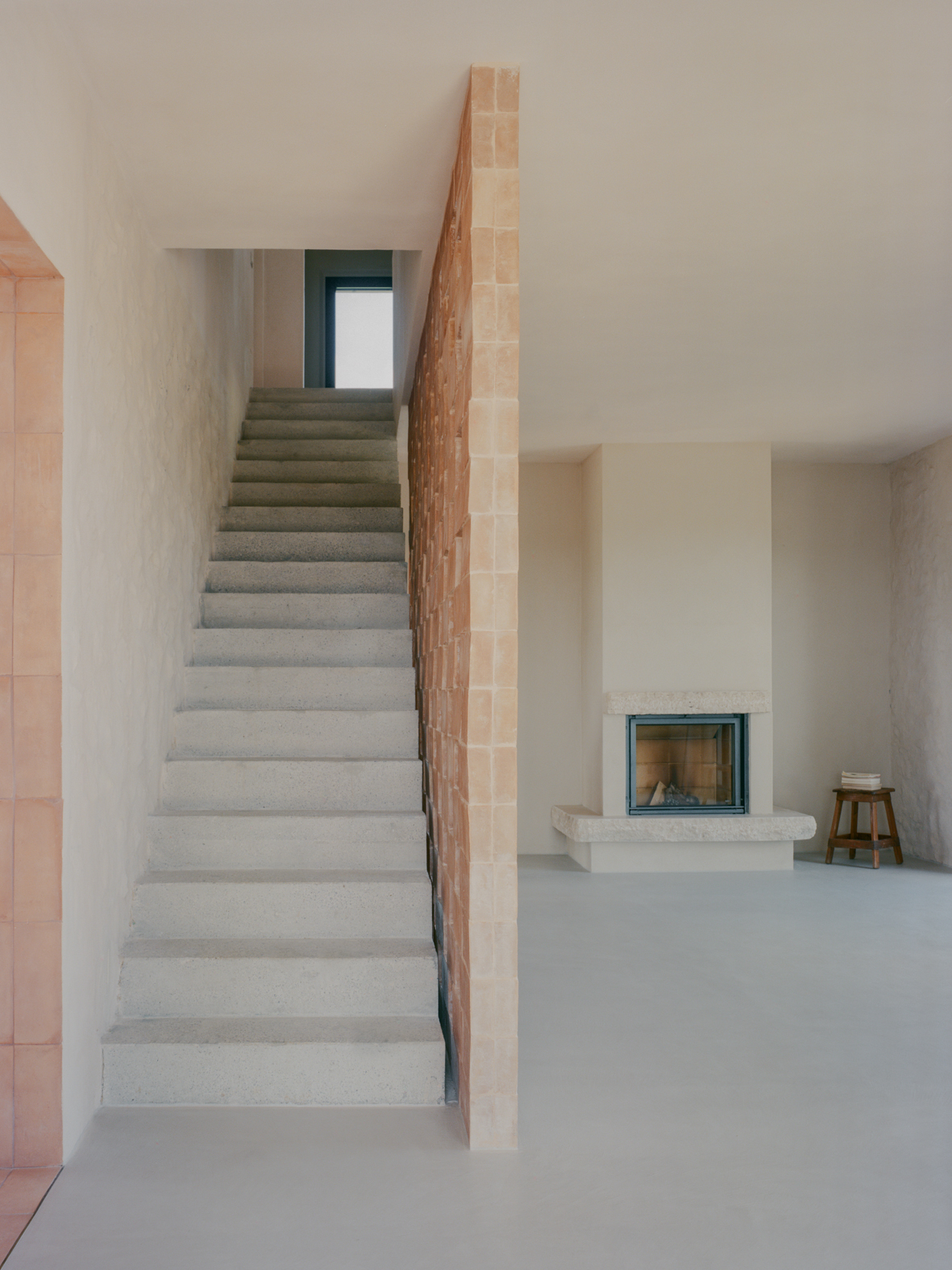 기존 석재 벽은 오래된 미장을 제거해 다시 드러냈고, 마구간 바닥에 사용되었던 테라코타 벽돌은 회수해 식당과 2층 침실의 벽 마감으로 재사용했다. 이 과정에서 테라코타와 콘크리트가 이 주택을 규정하는 핵심 재료로 자리 잡았다. 내부 통로와 일부 수평 면에는 은은한 분홍빛 톤이 적용됐고, 투스카니 농가에서 흔히 볼 수 있는 벽돌 격자벽은 새로 삽입된 내부 콘크리트 계단과 거실 사이를 나누는 요소로 사용됐다.