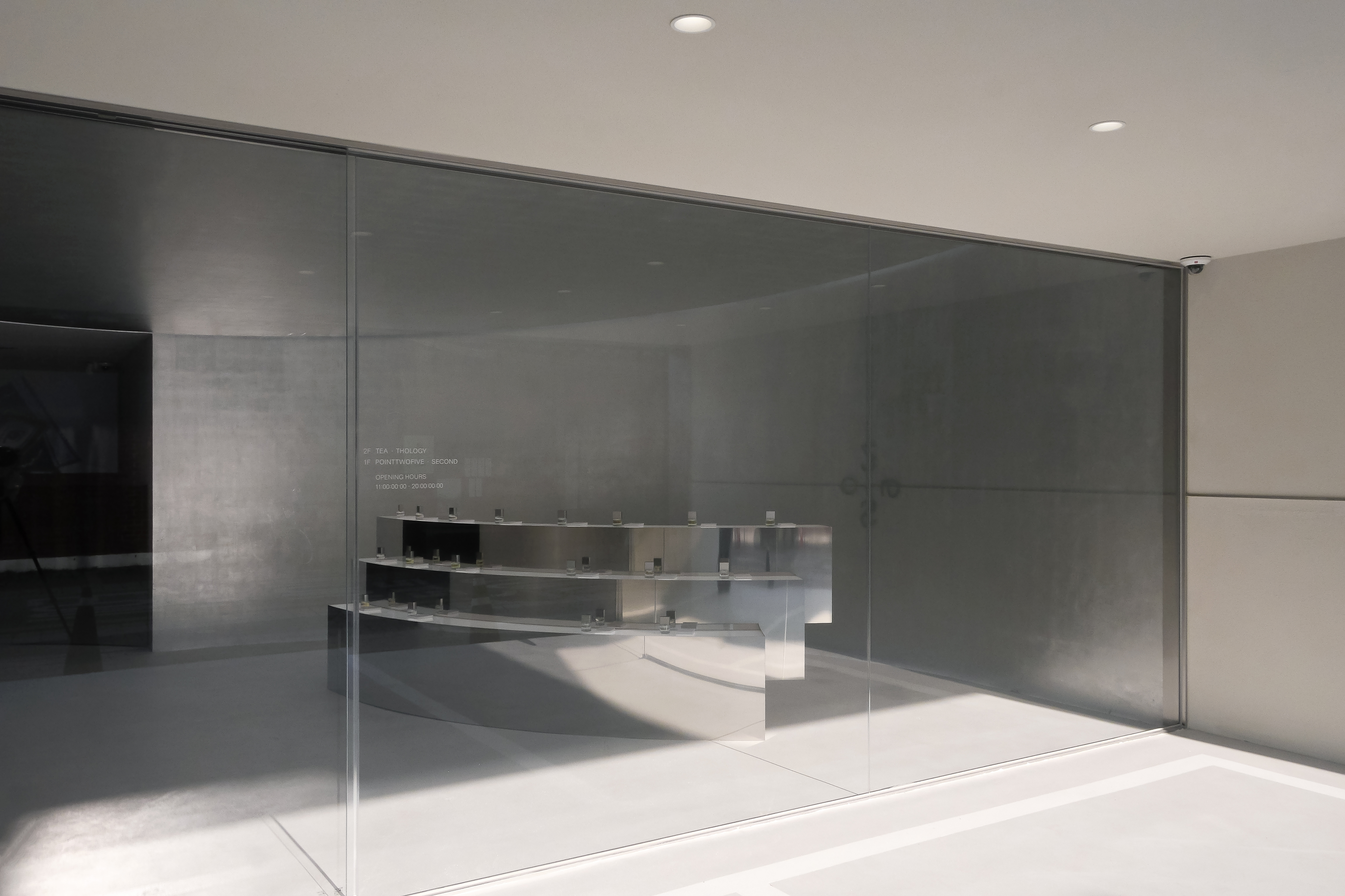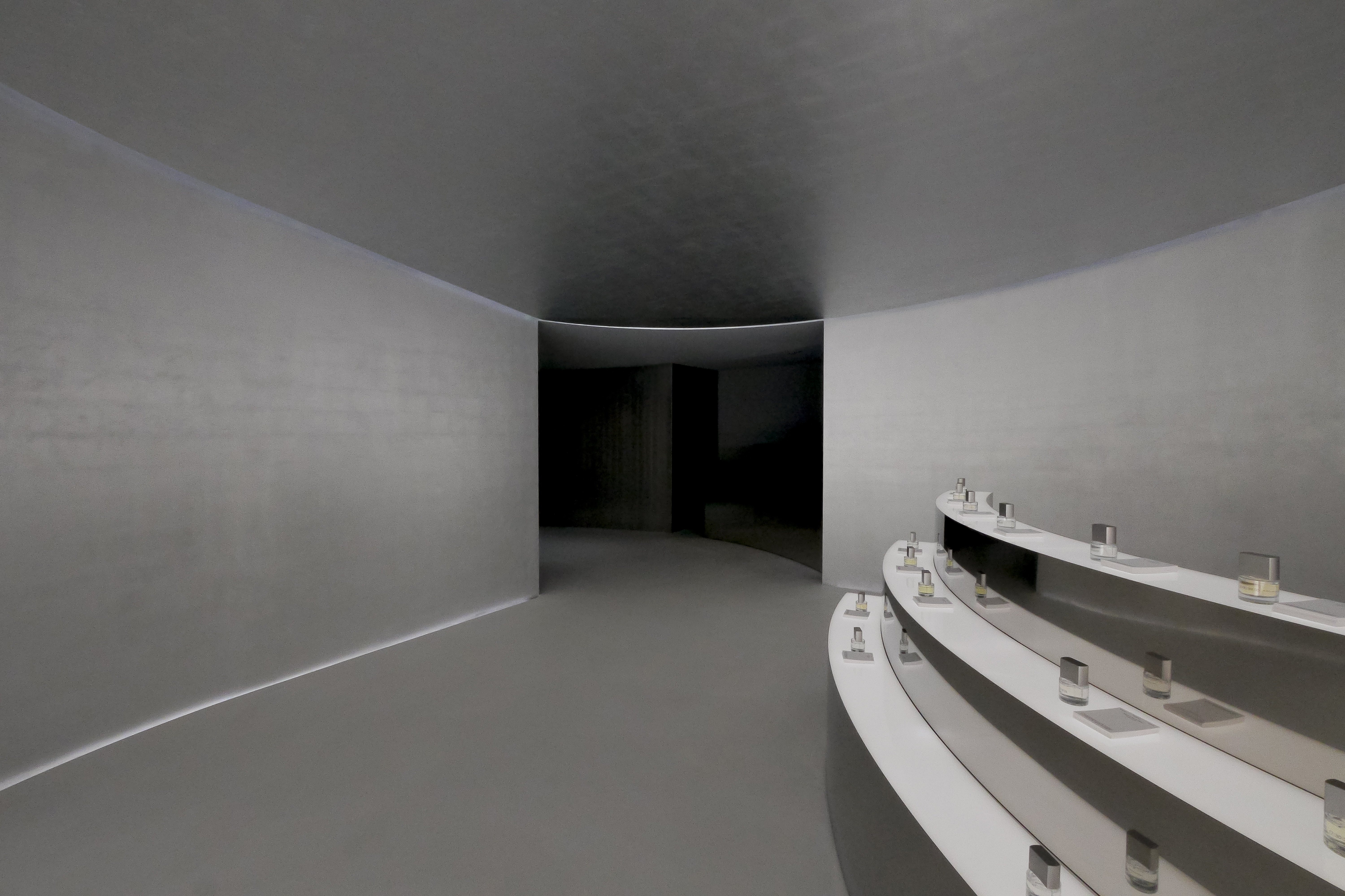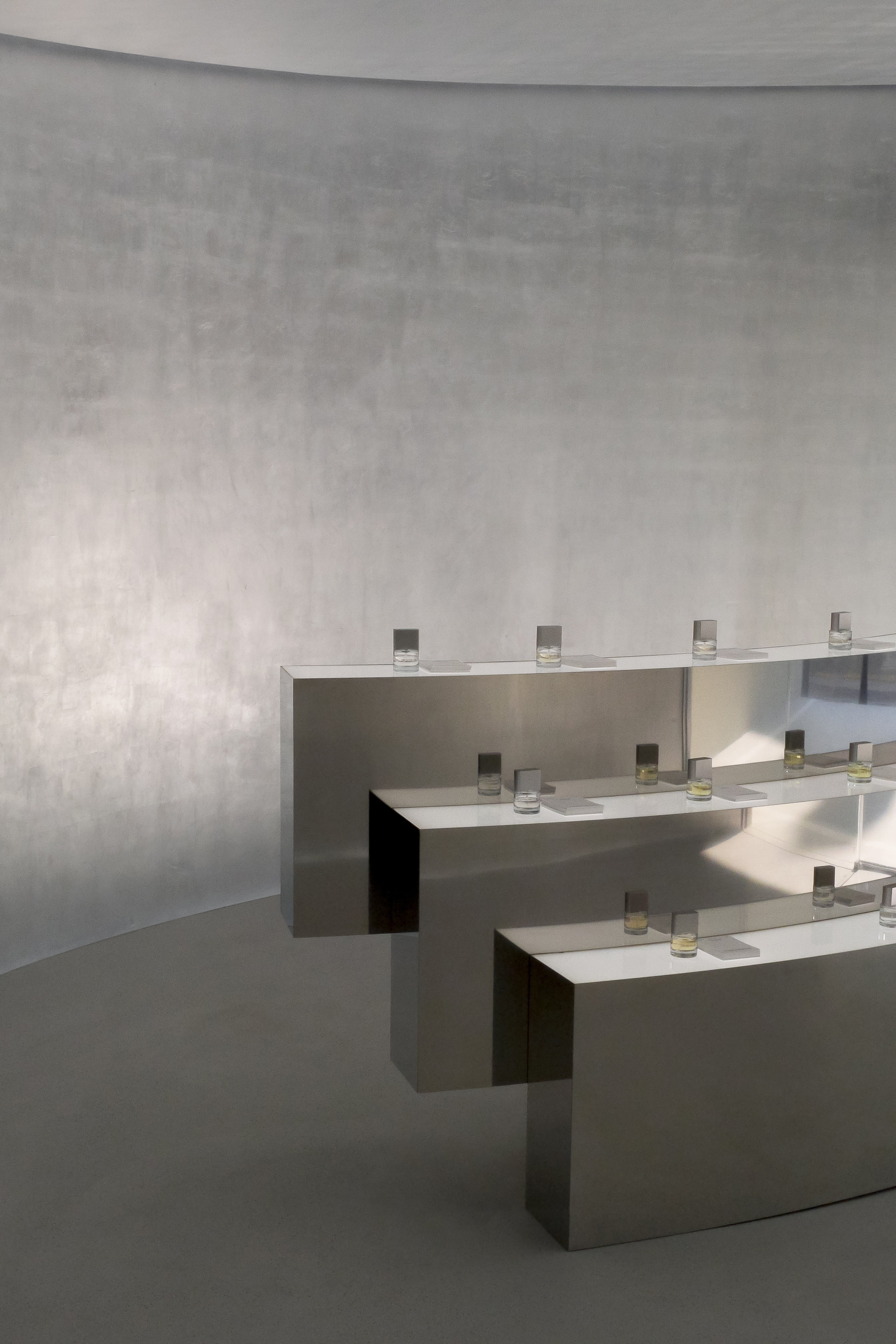 공간은 총 세 개의 단계로 구성된다. 첫 번째 구간은 ‘감각의 전환’에 해당하는 영역으로, 시각 중심의 인지에서 후각 중심의 경험으로 자연스럽게 이동하도록 유도한다. 쇼룸 입구에서 마주하는 은빛 물결은 일상의 시간에서 벗어나 다른 감각의 세계로 진입하는 장면을 연출하며, 브랜드와 방문자가 처음 조우하는 상징적인 장치로 기능한다. 층층이 쌓인 3단 진열대는 구조체가 드러나지 않도록 설계되어 부유하는 인상을 주고, 곡선 형태의 벽은 방문자를 감싸며 차분하게 향에 집중하도록 돕는다.