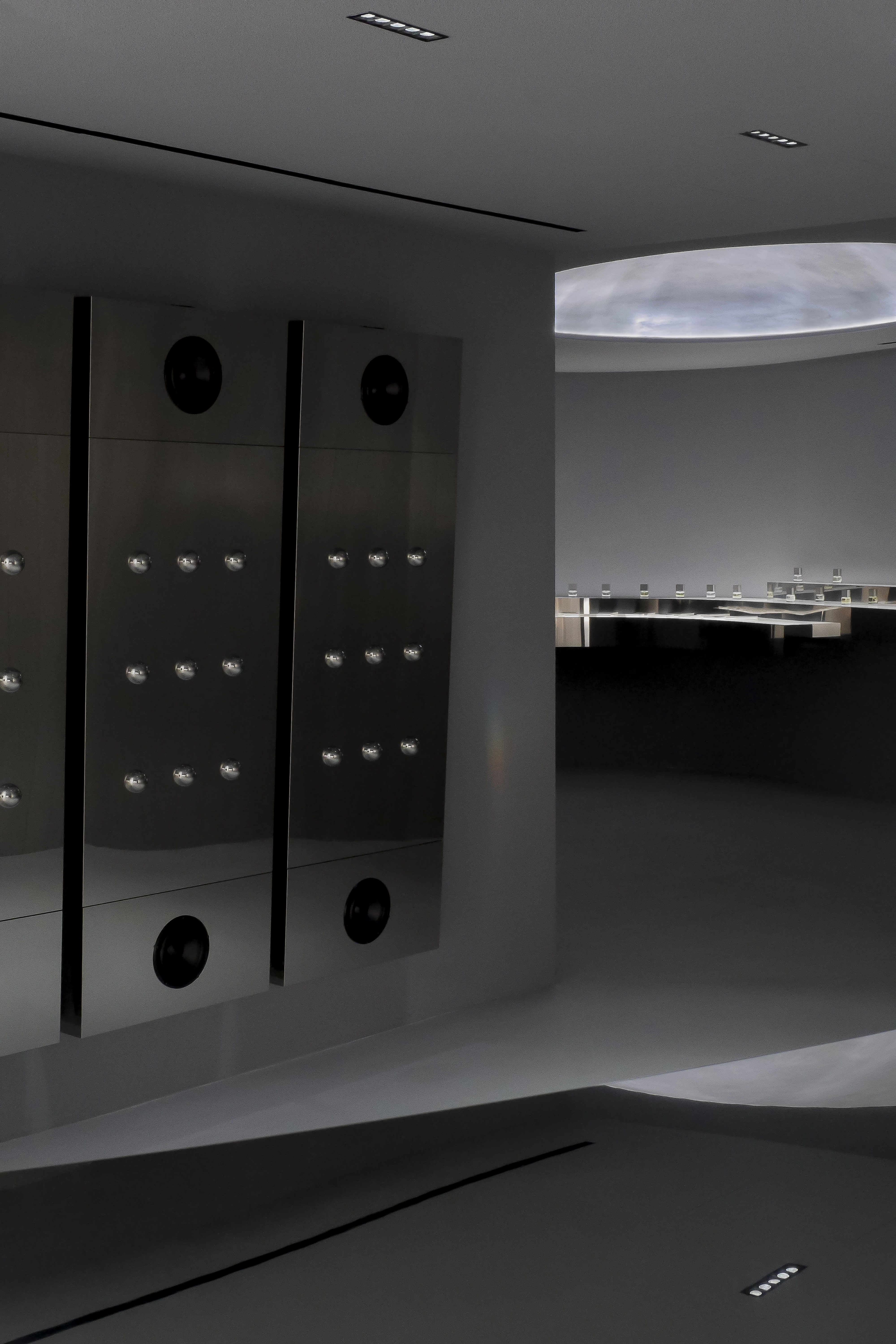 두 번째 단계는 ‘몰입의 과정’이다. 점차 어두워지는 조도와 유선형으로 굽어진 통로는 공간의 긴장감을 높이며, 마지막 공간을 향한 심리적 집중을 강화한다. 벽면에 설치된 스피커에서는 이 쇼룸을 위해 제작된 음악이 흐르며, 청각을 통해 감각의 밀도를 한층 끌어올린다. 이 구간은 다음 단계로 넘어가기 전, 감각을 예민하게 조율하는 전이 공간으로 작동한다.