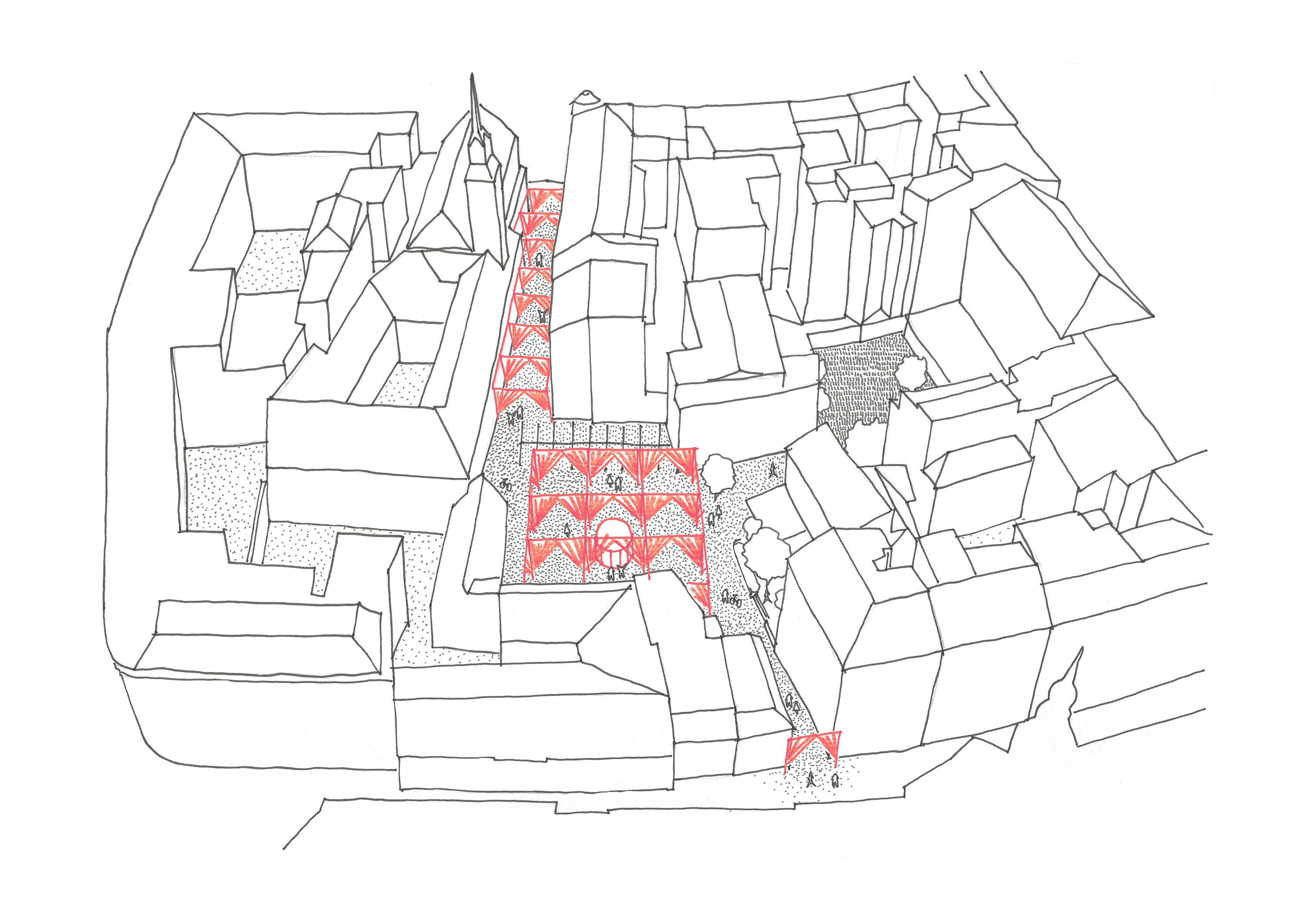 공간 구성은 피어 콜렉티브의 절제된 건축적 개입으로 완성됐다. 무대 구조에 쓰이는 모듈형 트러스 시스템 위에 흰색과 붉은색 패브릭 커튼을 걸어, 광장을 18개의 ‘방’처럼 분절했다. 이 커튼들은 방문자의 이동에 따라 연속적인 통로와 시선을 만들며, 하늘 아래 놓인 임시적인 실내 공간처럼 작동한다. 전체 면적은 약 2,478㎡로, 열 개의 테니스 코트에 해당하는 규모다.