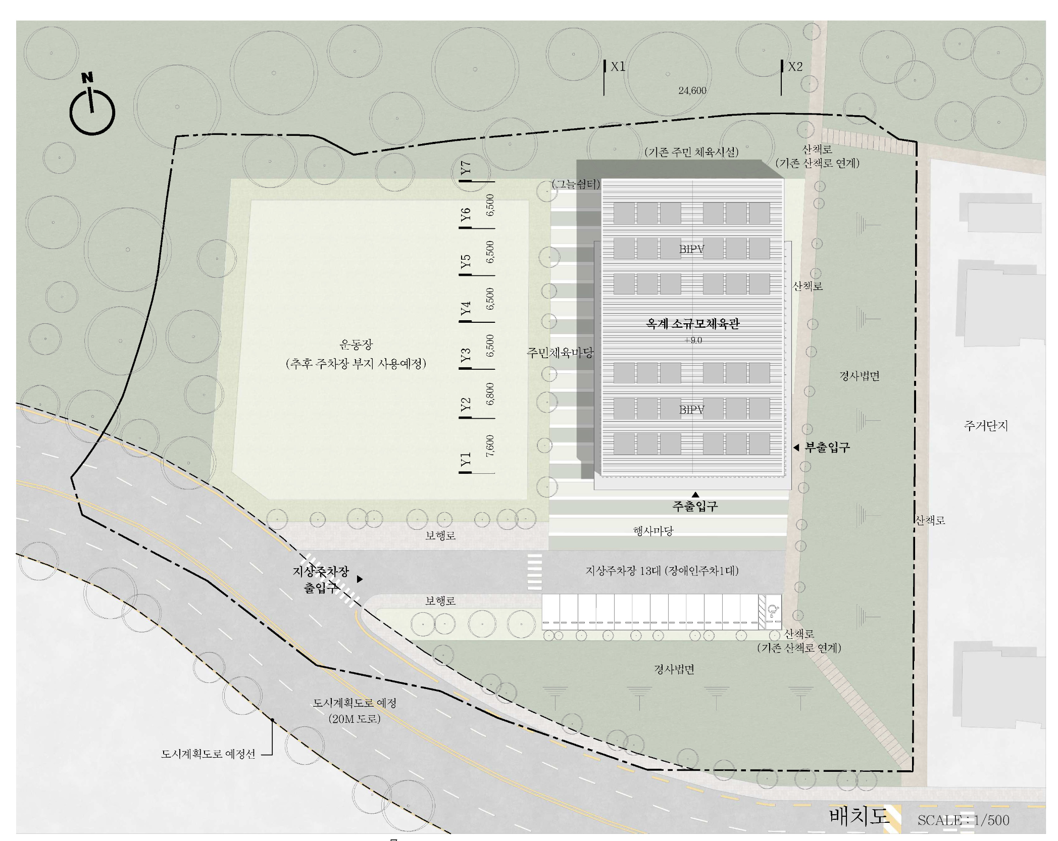 남측 도시계획도로를 따라 차량과 이용자들의 진, 출입을 원할하게 확보하고, 기존 동측 산책로와 연계 될 수 있도록 새로운 보행 동선을 조성하여 이용자의 접근성을 높이는 배치계획을 하였다.