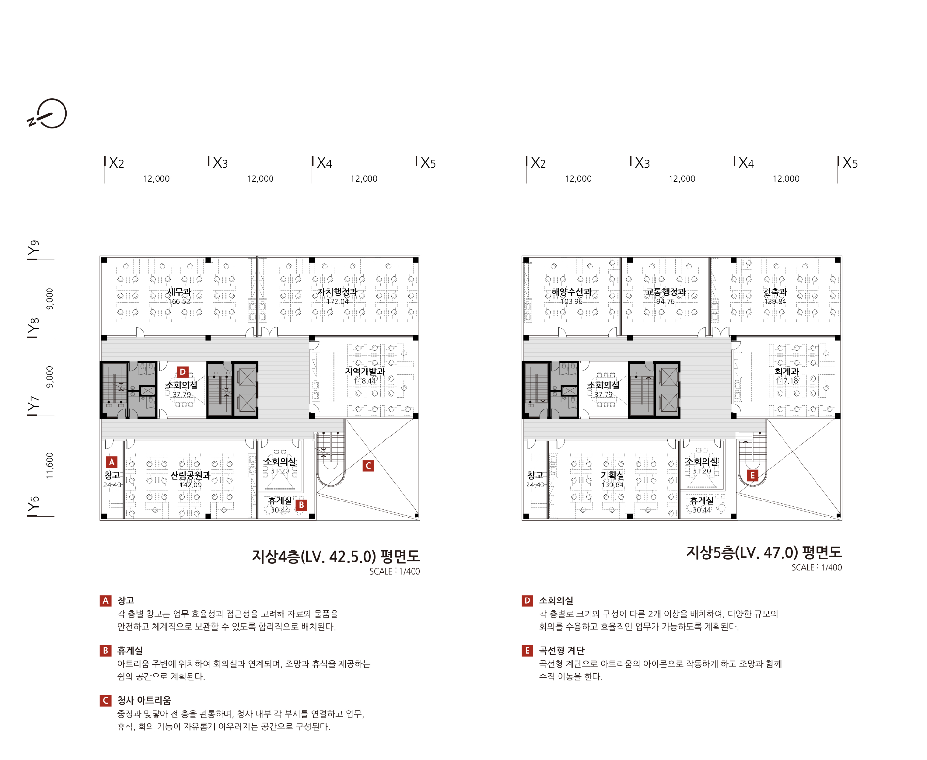 무안군청은 ‘무형의 공간 가치’를 지향합니다. ‘중정–회랑–그리고 다수의 마당’으로 구성된 중정형 구조는 ‘비움–연결–만남–확장’의 공간 개념을 구현합니다. 공적 공간과 행정 공간은 명확히 구분하되, 중정과 아고라와 같은 공적인 허브를 통해 유기적으로 연결되도록 했으며, 층별 기능 배치는 향후 운영·관리 효율을 고려해 구성했습니다.