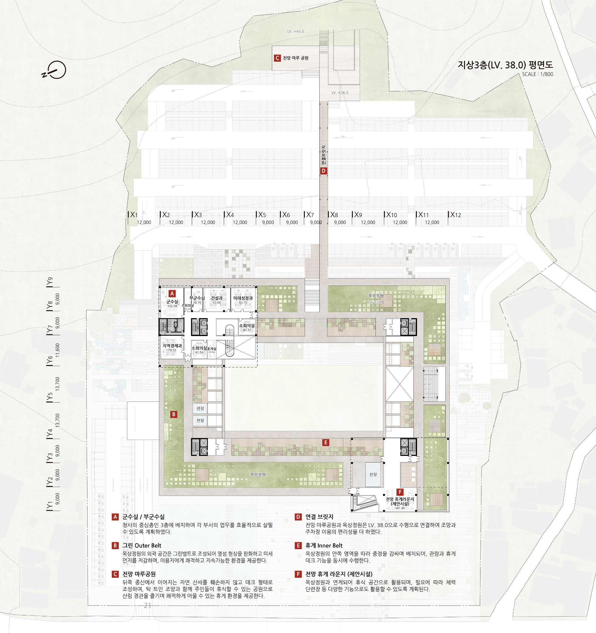 무안군 신청사는 —공적 교류와 시민의 장—을 의미하는 고대 그리스의 ‘아고라(Agora)’ 의 정신을 현대적으로 재해석하여, 새로운 무안 청사가 시민의 일상적 만남과 연대가 실천되는 장소가 되도록 했습니다. 전면의 대형 웰컴광장으로 환대하는 공간을 지나 아고라의 개념을 담은 중정공간은 도시의 열린 마당으로서 주변 거리와 자연스럽게 연결되고 신청사의 각 프로그램과 유기적으로 연결됩니다. 건축물 후면에 위치한 지상주차장을 가로지르는 브릿지를 지나 전망마루공원과 전망대까지 연결되는 광장 축과 레벨차를 이용해 계획된 신청사는 이용객의 접근성과 시각적 연속성을 높이기 위해 의도적으로 설계한 결과물입니다.