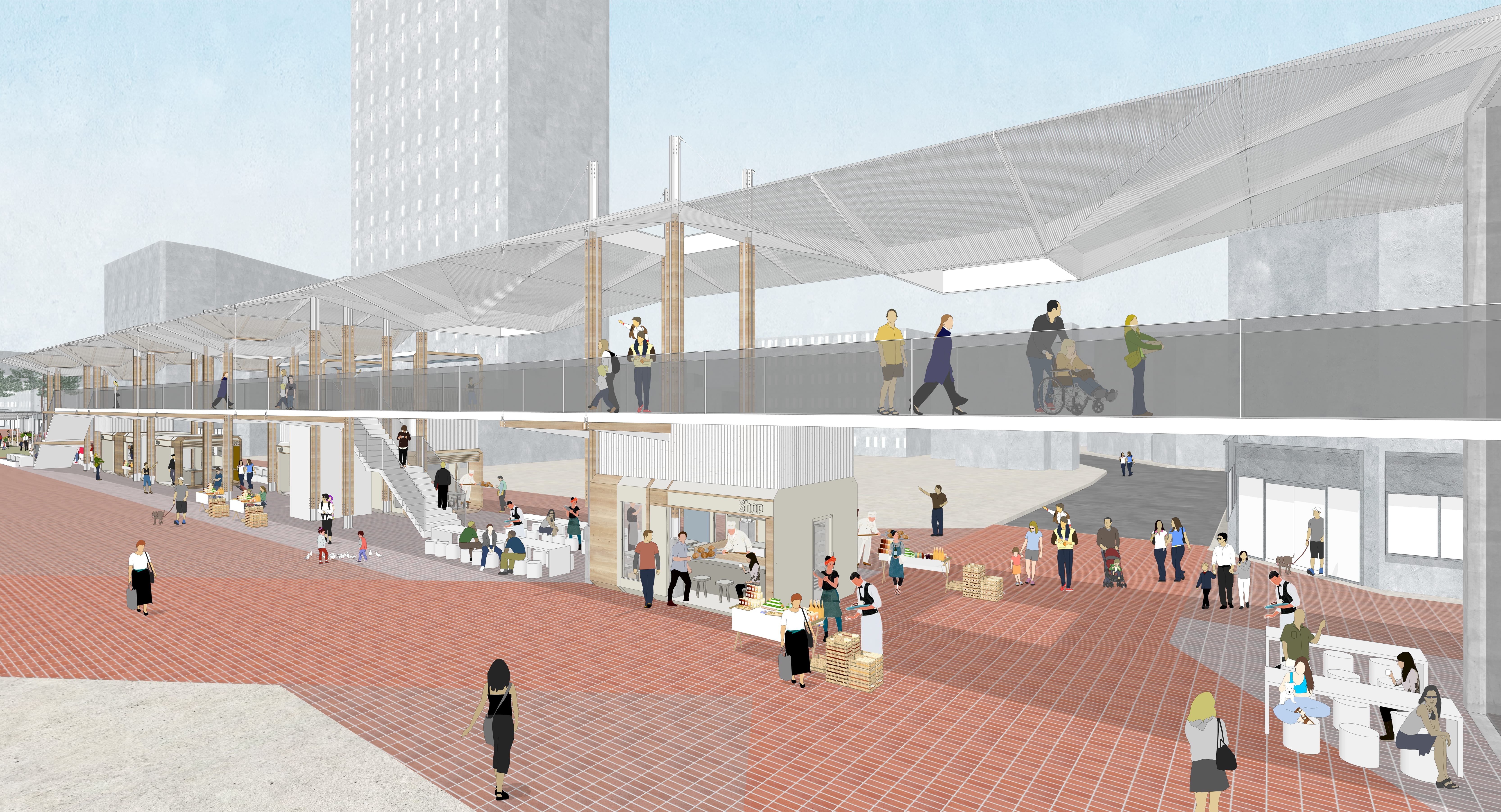 C구간은 파발교차로와 인접해 상대적으로 활기가 부족했던 지역으로, 이곳을 새롭게 활성화하기 위해 조각보 마당 + 아케이드 구조를 도입하였다. 전통의 ‘조각보’가 음식을 덮고 상 위를 가리는 덮개에서 출발하는 것처럼, 본 계획은 먹거리 중심의 도시적 프로그램을 품기 위해 이를 현대적으로 재해석한 입체적 지붕 구조를 제안한다. 지붕의 솔리드·반투명 패널은 빛과 그늘을 조절하며 독특한 공간감을 형성하고, 기둥을 안쪽으로 배치하여 열린 외부 경계?깊은 내부 공간이 자연스럽게 이어지도록 했다. 이 열린 공간 아래에는 1·2층 레벨을 활용한 다양한 유형의 키오스크(판매·조리·복층형)가 배치되어, 일상적인 식음 활동에서부터 축제·야간 먹거리 행사까지 확장 가능한 '먹거리 문화의 축(Food Culture Spine)'을 형성한다. 또한 조각보 마당은 A구간의 비움·B구간의 그린 테라스를 넘어 최종적으로 도시의 새로운 랜드마크적 경험을 제공하며, 선형 축의 종점을 강력한 목적 공간으로 만들어준다.