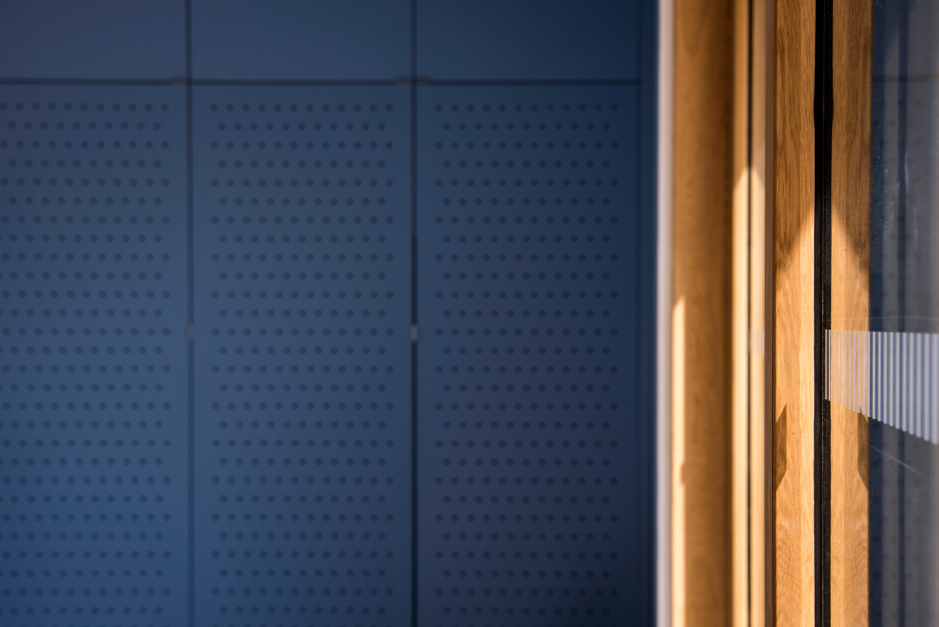 교실 내부는 식사 공간과 놀이 공간으로 명확히 구분되며, 강렬한 색 대비를 통해 아이들의 일과 리듬을 돕는다. 아침에는 활동을 정리하는 기준이 되고, 오후에는 놀이를 나누는 경계로 작동한다. 맞춤 제작된 벽면 가구는 수납과 놀이 요소를 동시에 담당하며, 거리와 정원을 향한 창에는 넓은 창턱이 마련되어 아이들도 편안히 앉아 바깥을 바라볼 수 있다. 목모 시멘트 천장, 부드러운 비닐 바닥, 실내 블라인드는 쾌적한 음환경을 만든다.