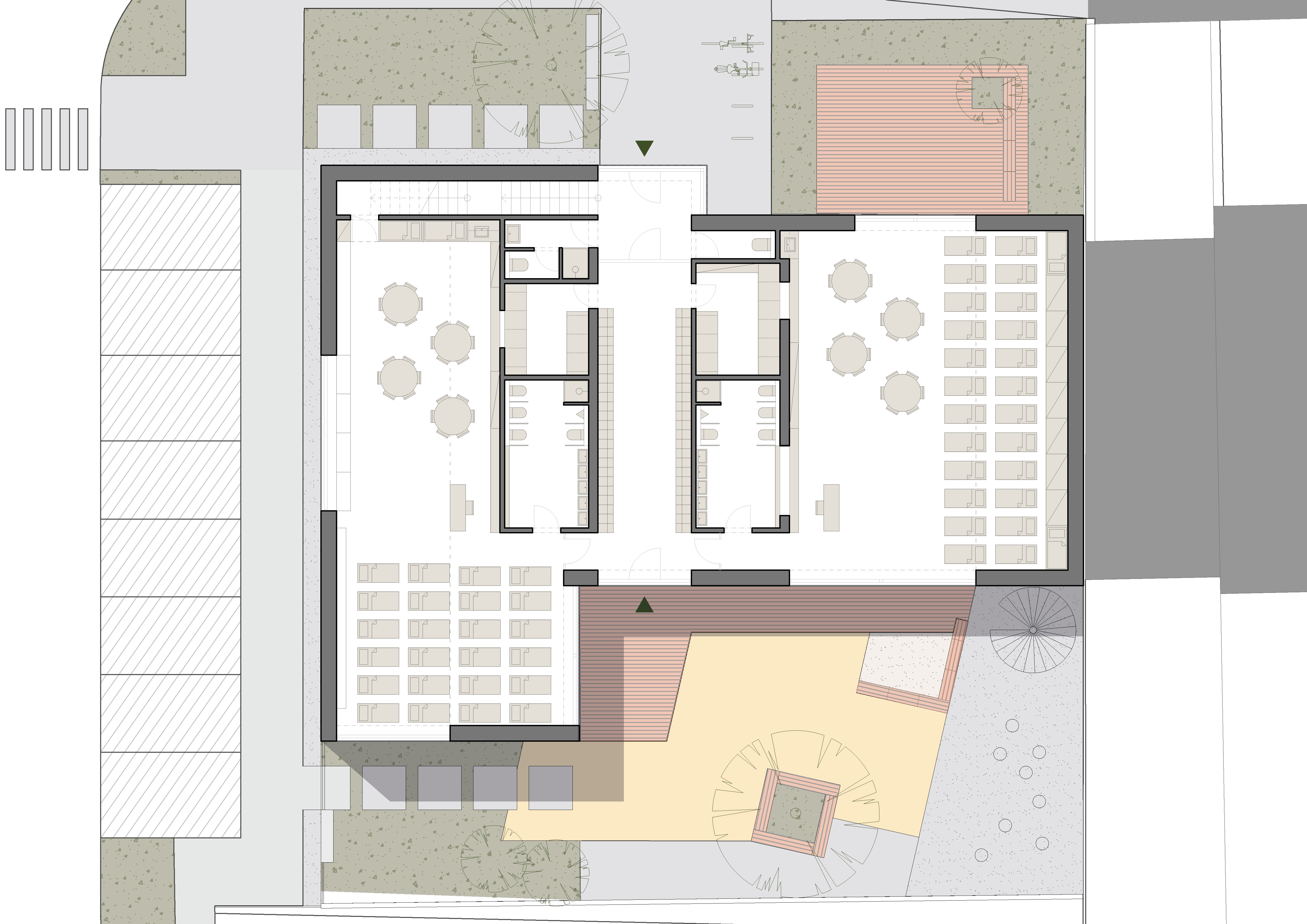 주 출입구는 북측에 위치하며, 입면이 살짝 들어간 형태로 계획되었다. 이는 인접한 주택의 가로선을 유지하면서도 최대한의 건축 면적을 확보하기 위한 선택으로, 동시에 출입구를 명확히 드러내고 아침의 작별 인사와 오후의 놀이를 마무리하는 작은 앞마당을 만들어낸다. 이 전면 마당의 일부는 한 교실의 외부 테라스로도 활용된다.
