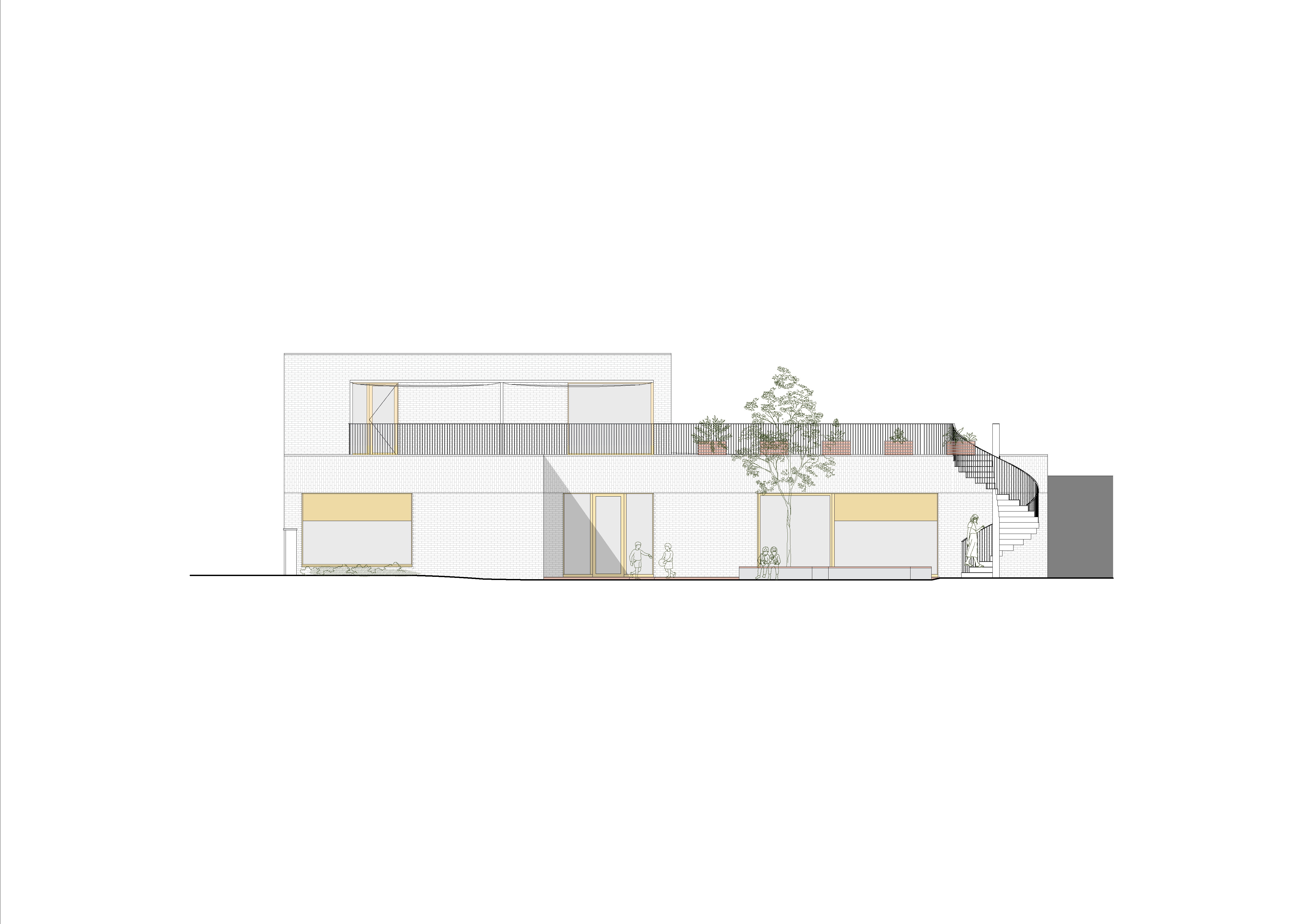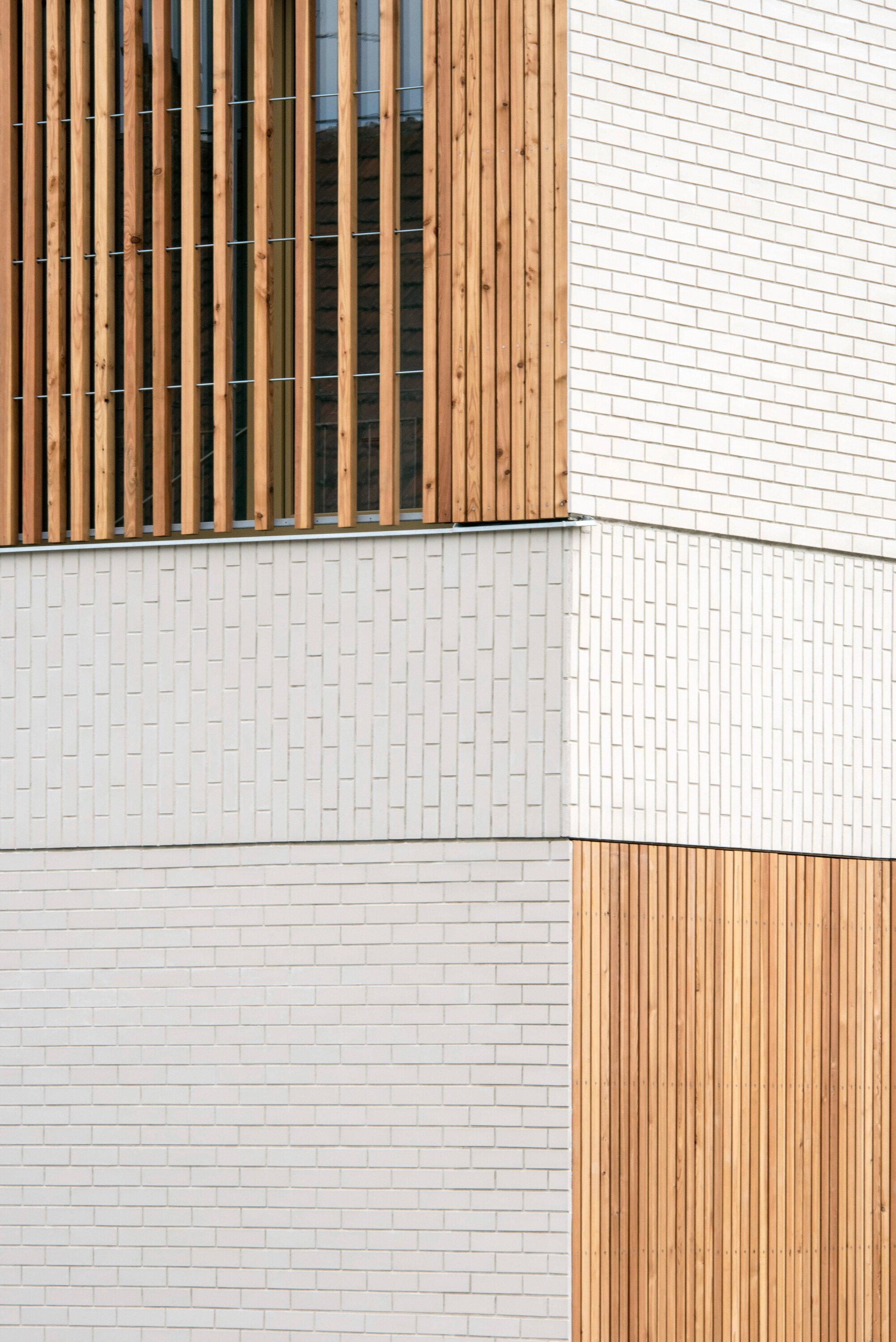 건물은 단순한 매스와 활용 가능한 평지붕, 그리고 내부의 밝은 색감을 드러내는 대형 창으로 구성된다. 남측 정원 쪽의 창에는 반투명한 노란색 차양이 설치되어 햇빛을 부드럽게 조절한다. 입면은 벽돌 마감과 창 앞의 목재 격자로 구성되어 규모감을 부드럽게 완화하고 따뜻한 인상을 더한다.