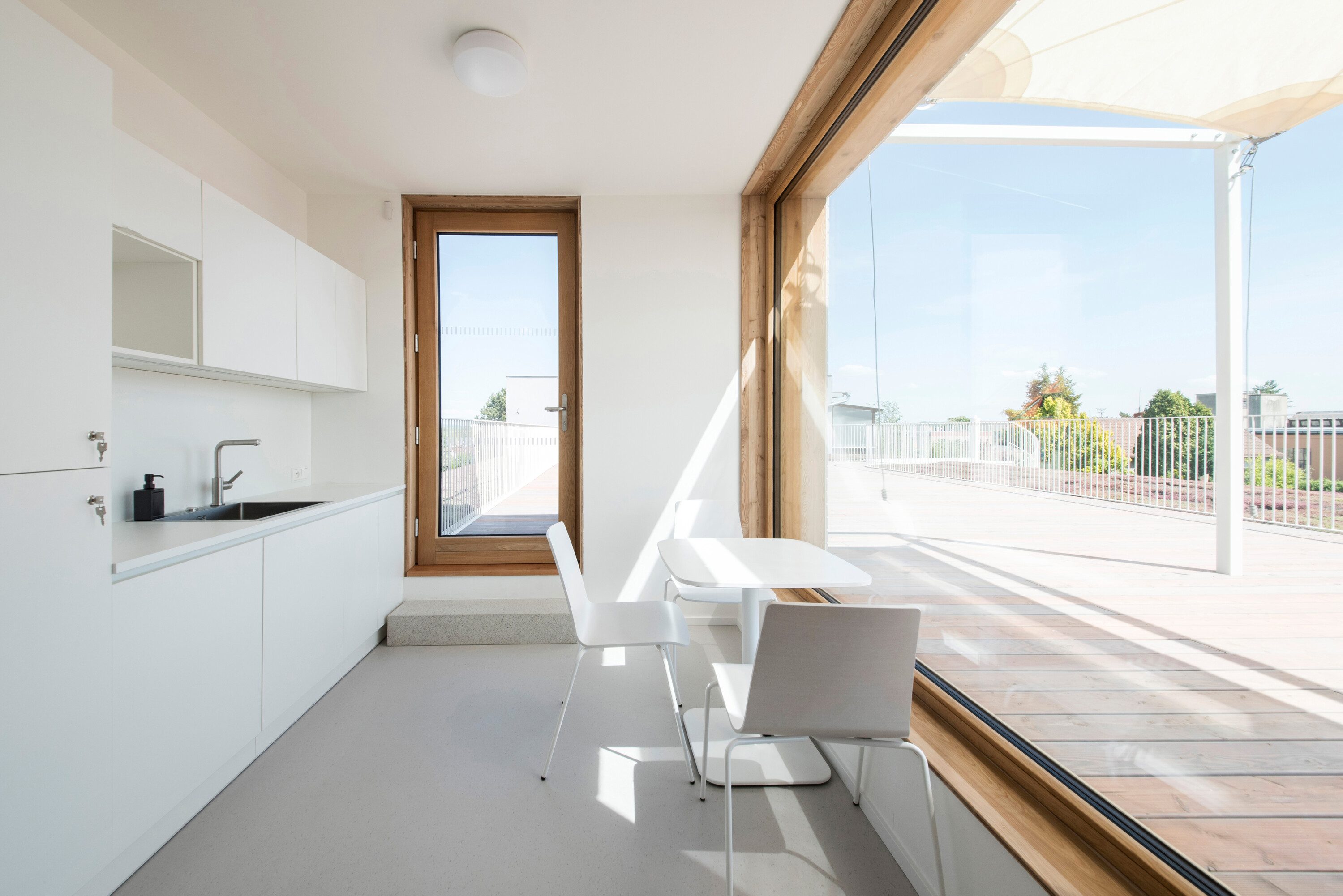 2층에는 원장실, 교직원 휴게 공간, 기술실이 위치하며, 이 층에서 옥상 교실로 이어진다. 녹화된 옥상 가장자리에서 살짝 뒤로 물린 흰색 난간은 거리에서는 거의 보이지 않으며, 그늘과 텃밭이 있는 넓은 테라스는 배 위에 있는 듯한 인상을 더욱 강화한다.