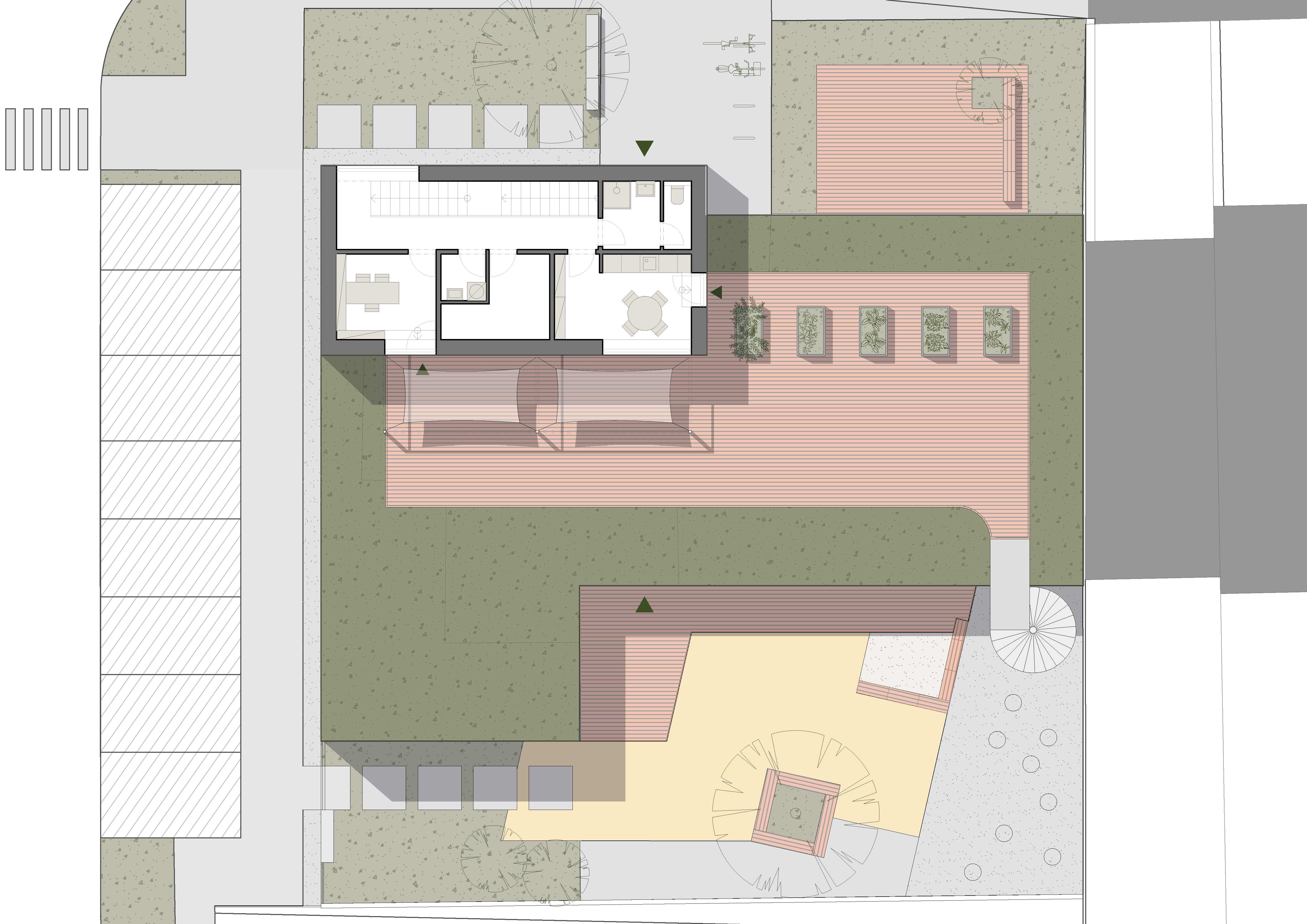 건물의 1층은 주변 주택들과 높이를 맞춰 배치되어 거리의 소음으로부터 정원을 보호하고, 반대로 놀이 소음이 거리로 퍼지는 것도 막아준다. 사무실과 교직원 휴게 공간이 위치한 2층은 코너 대지에서 건물의 존재감을 드러내는 역할을 한다.