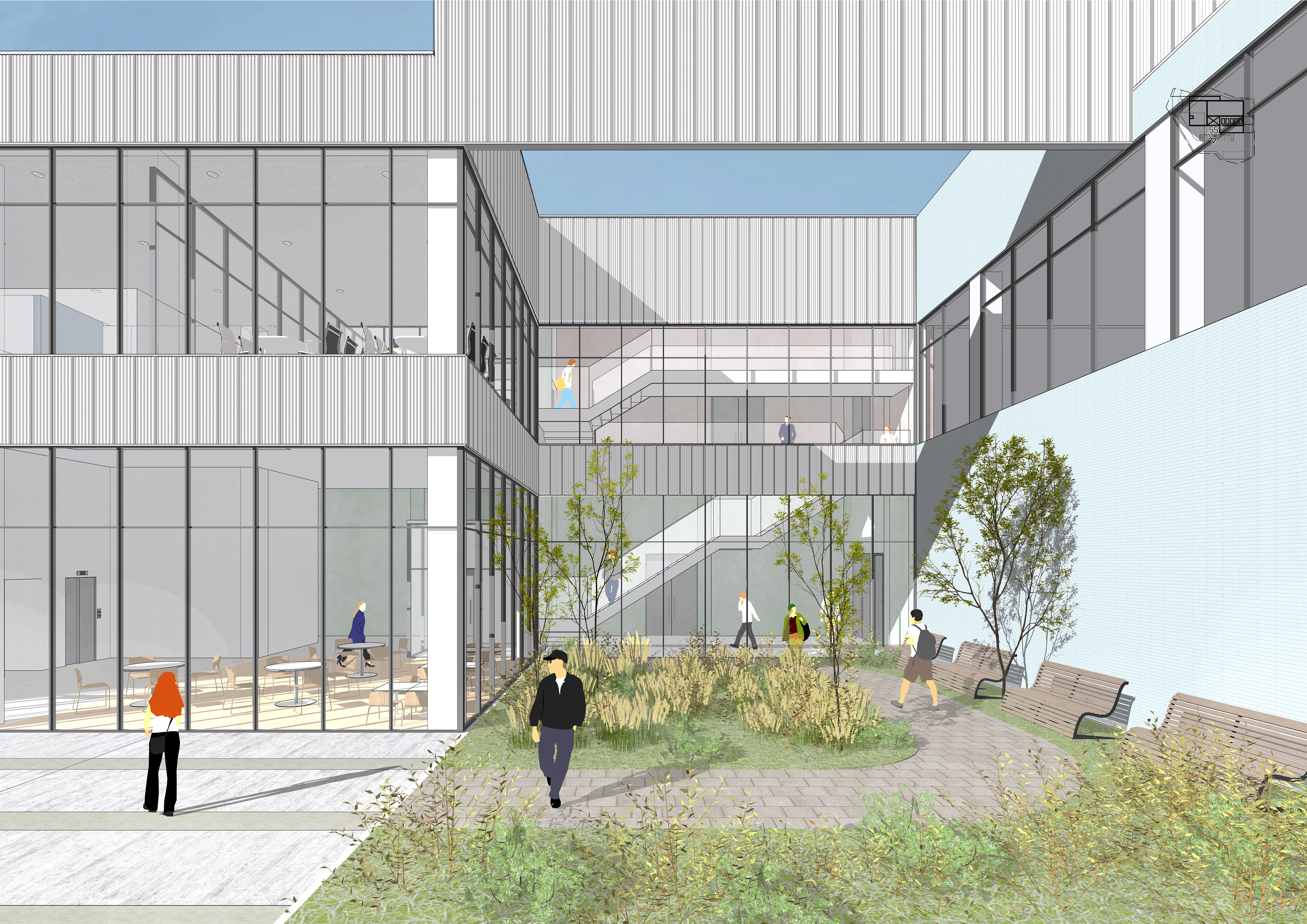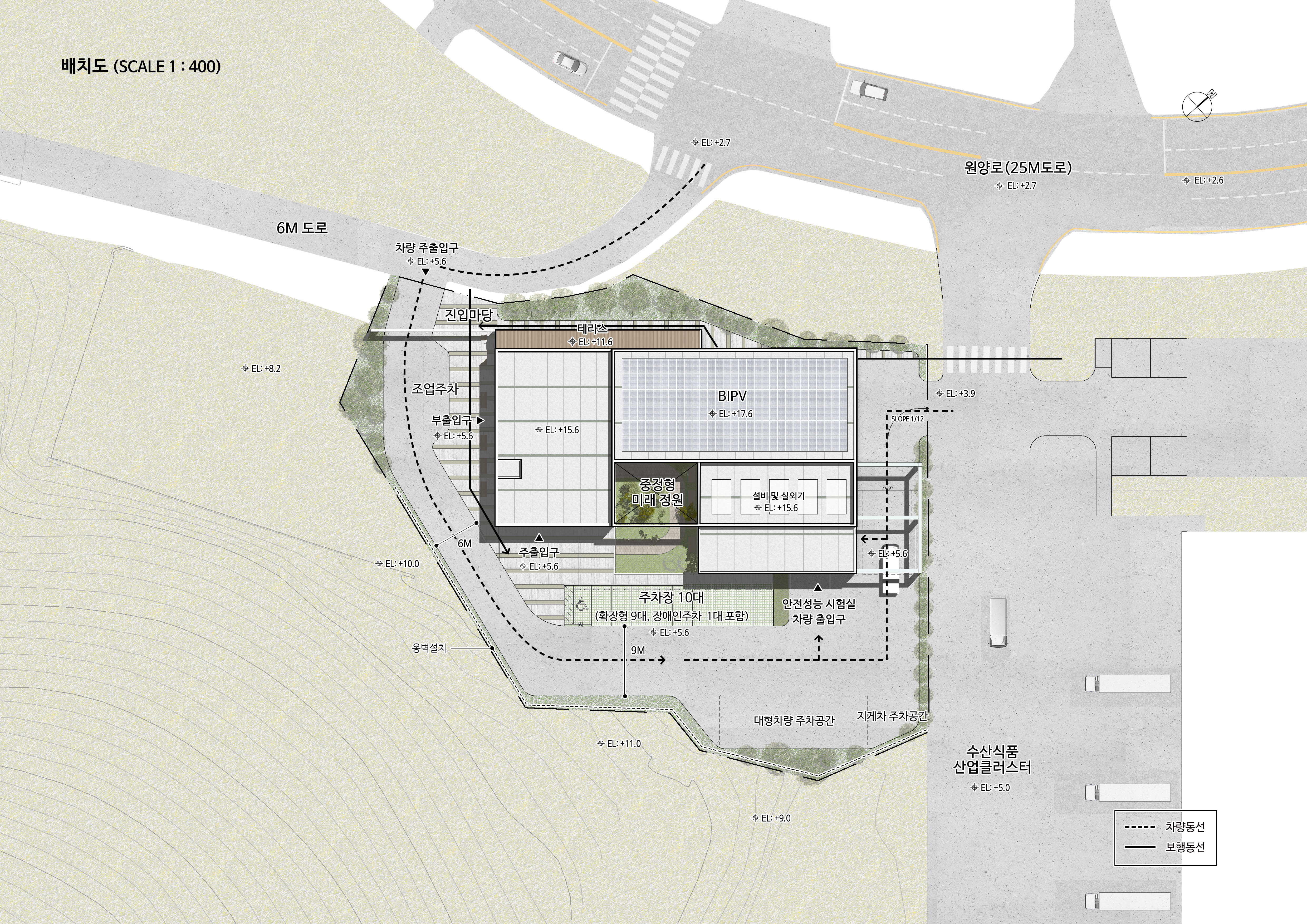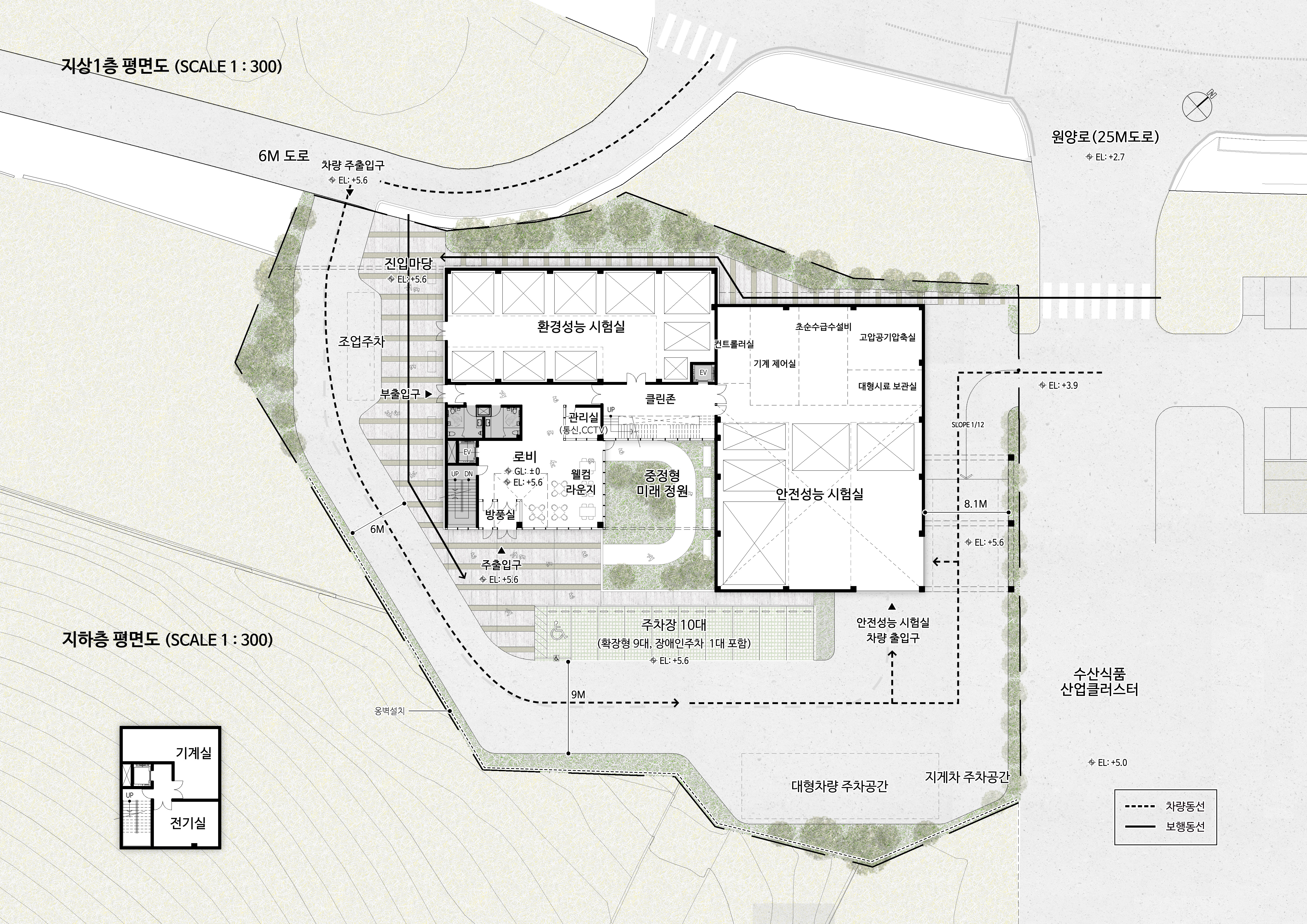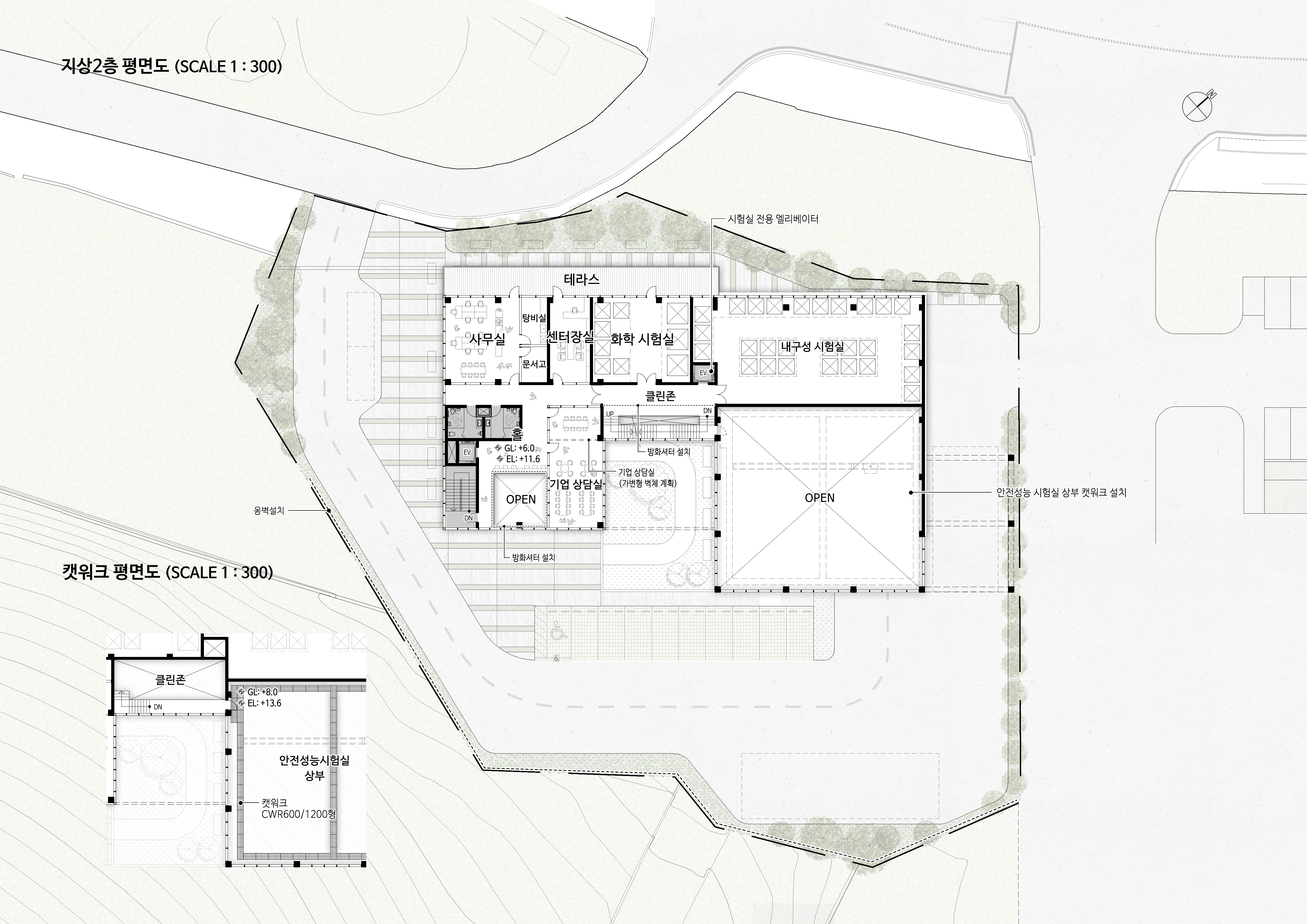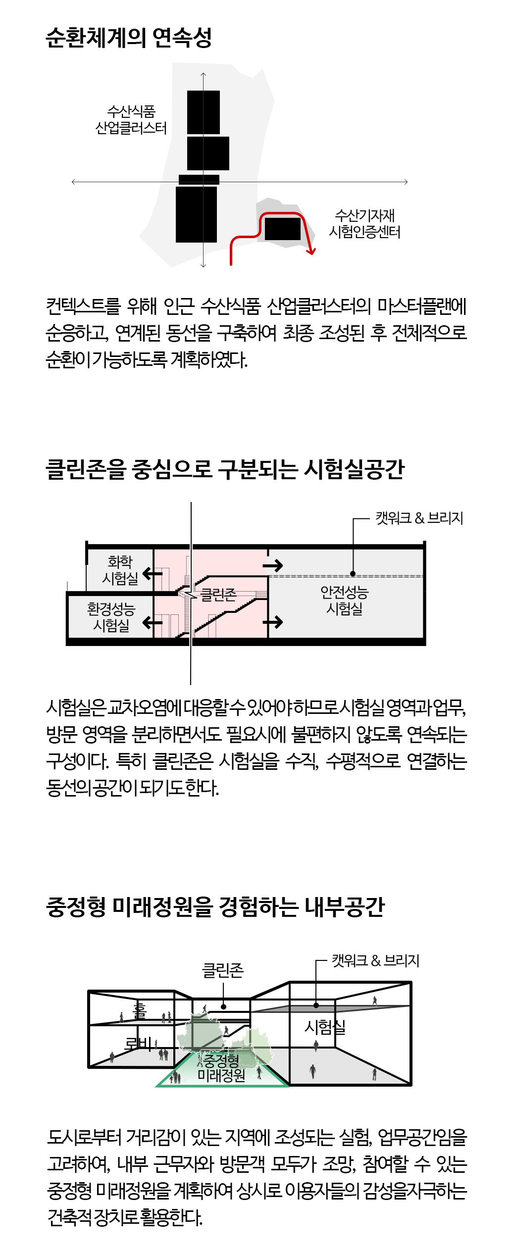 진입도로에서의 정면성을 위해 전면 공지를 계획하고, 진입마당과 차량진출입로를 분리하여 계획하였다. 전면마당의 주차장에서 접근이 가능한 어프로치 공간을 계획하고, 중정형 미래정원을 조성하여 휴게공간으로 사용할 뿐 아니라 내부의 공간에서 바라보는 중심경관을 제공하는 요소로 활용하였다. 로비와 상담실에서 조망이 가능하고, 시험실영역의 클린존에서 이동하면서 상시적으로 조망을 가능하게 계획하였다. 이는 근무환경을 양호하게 만드는 효과를 기대할 수 있다.