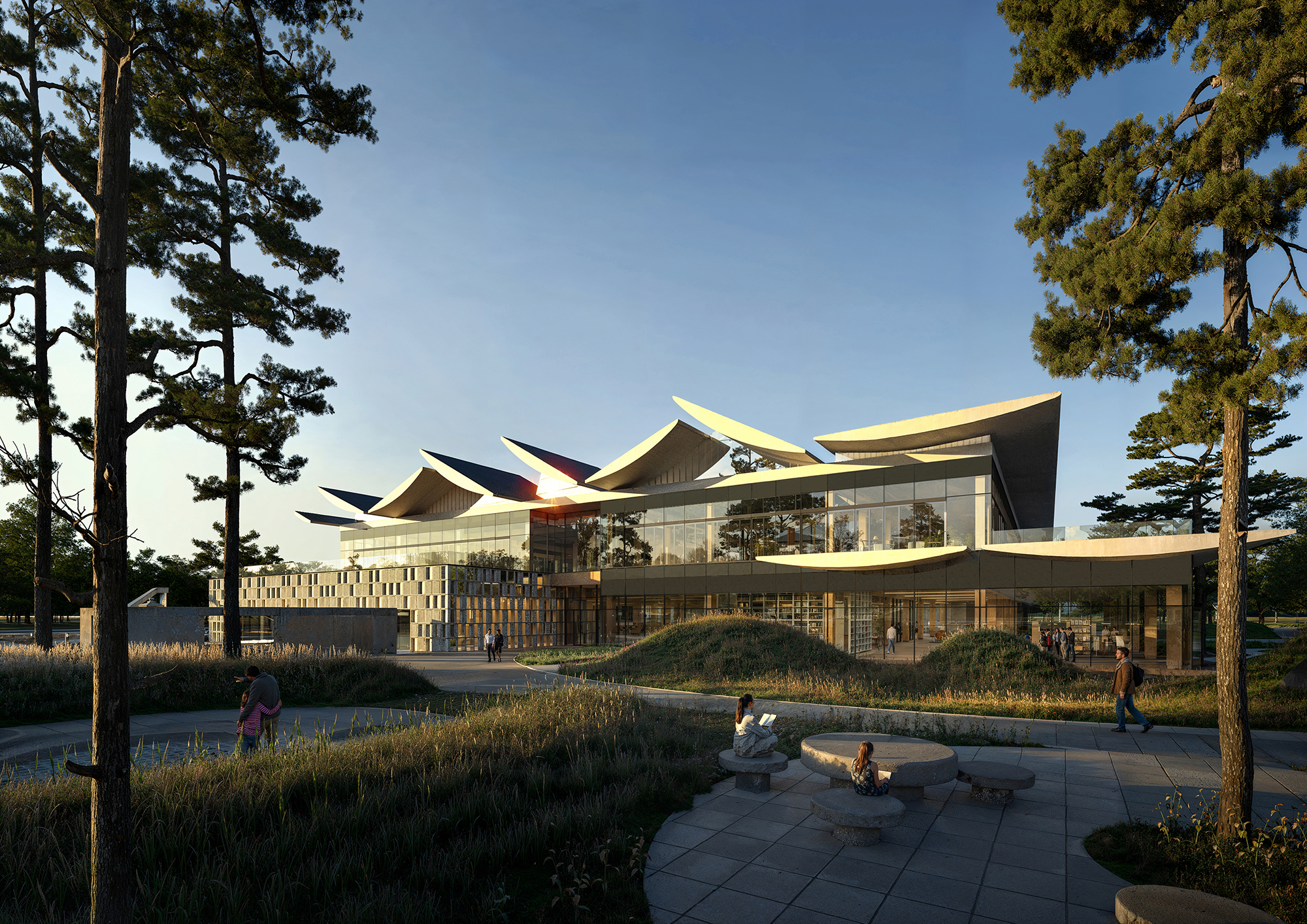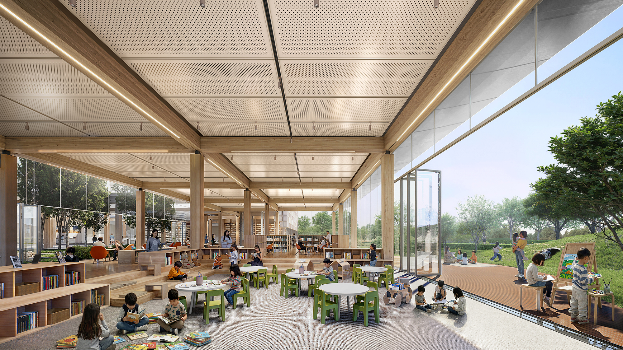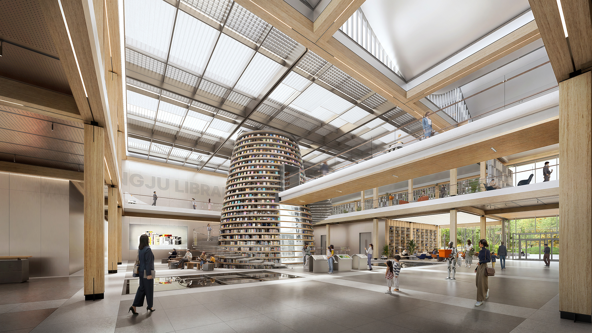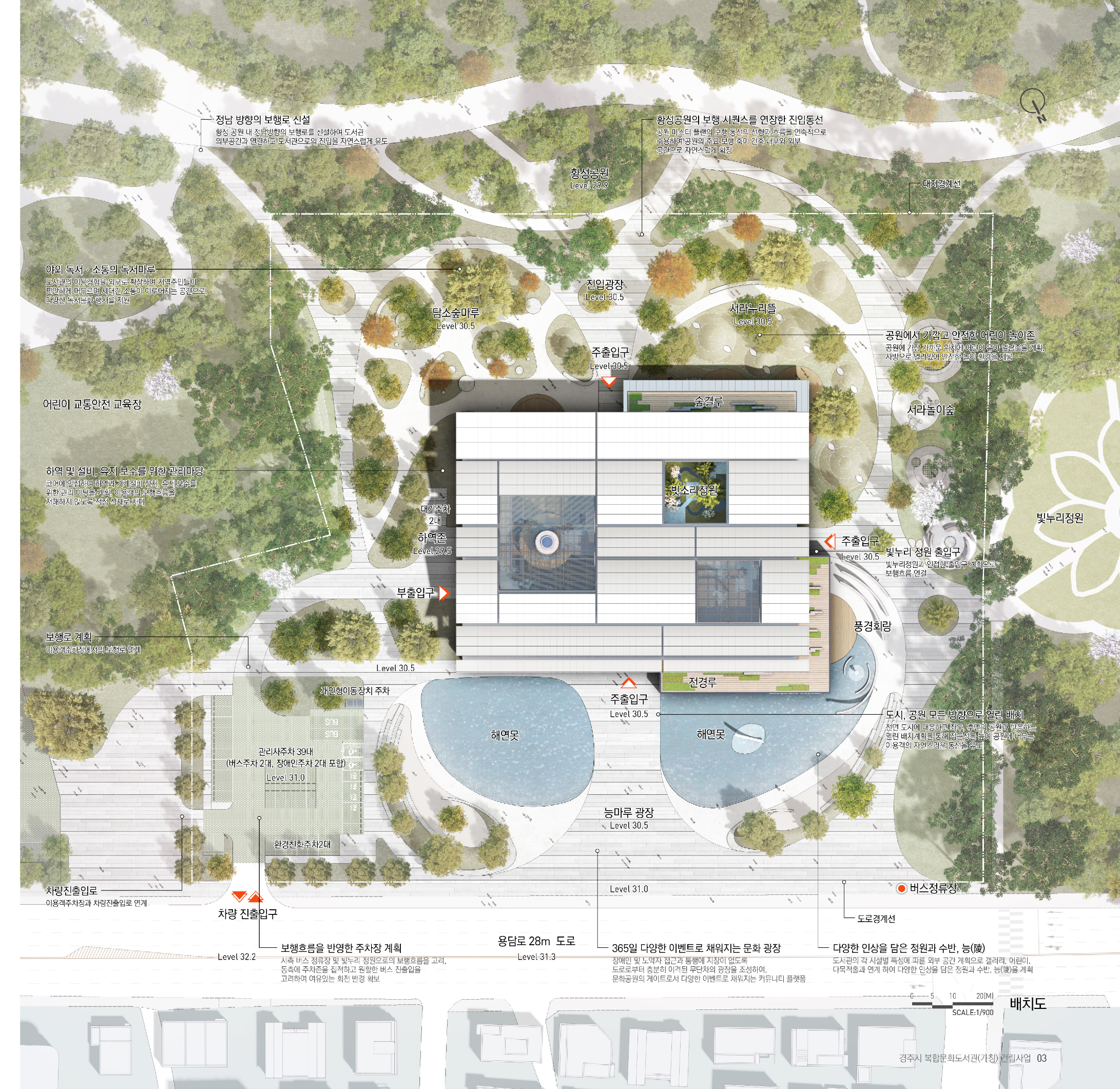 경주시 복합문화도서관은 도서관을 지역의 일상과 문화가 교차하는 커뮤니티 플랫폼으로 재정의하는 데 목적을 두었다. ‘마을’ 개념을 적극적으로 적용하여 시민들이 자연스럽게 드나들고 머무를 수 있는 열린 공간 구조를 구축하는 데 중점을 두었다. 1층에는 공원과 사방으로 연계되는 도서관 마을과 함께 도서관 내부의 중심이자 랜드마크 공간인 ‘별담터’를 배치해 문화·교육·전시 프로그램이 유기적으로 연결되도록 계획하였다. 상부에는 황성공원의 풍경을 조망하는 오픈플랜형 ‘서가의 누’를 구성하여 자연과 지식의 관계를 입체적으로 확장하였다. 단면 구성에서는 역사 기록 공간에서 현대적 열람 공간, 친환경 시스템으로 이어지는 층위적 구조를 통해 경주의 장소성과 복합 문화 도서관으로서의 역할을 함께 담아내고자 하였다.