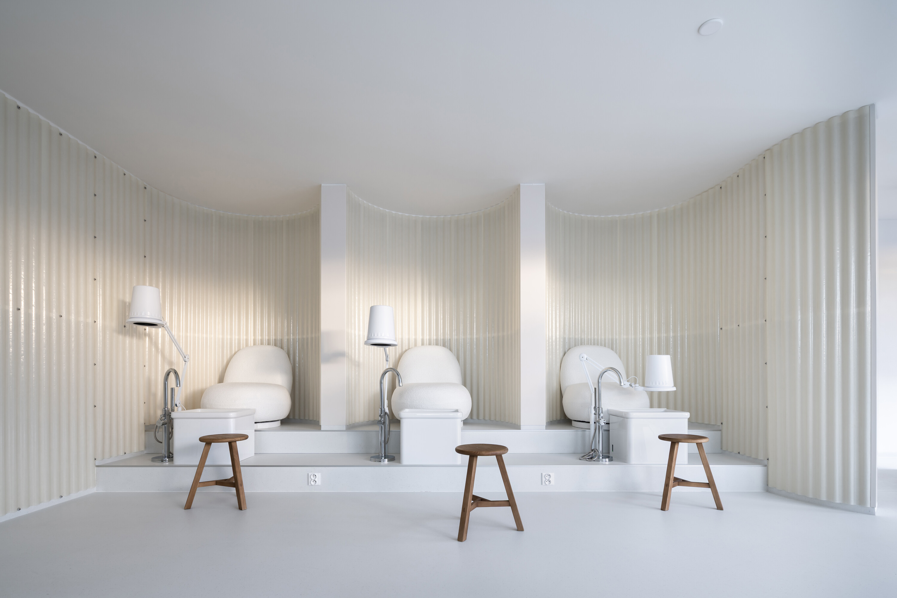 재료와 색채는 의도적으로 절제되었다. 전체 공간은 밝고 부드러운 톤을 중심으로 구성되었으며, 촉각적인 재료인 패브릭과 목재는 방문자와 직접적으로 관계 맺는 가구와 요소에만 사용되었다. 이러한 선택은 공간 전반에 차분한 인상을 부여하는 동시에, 클라이언트가 강조한 ‘돌봄’의 개념을 시각적·공간적으로 드러낸다. 이 살롱은 단순한 미용 공간을 넘어, 서비스와 웰빙이 만나는 장소로 인식되기를 지향한다.