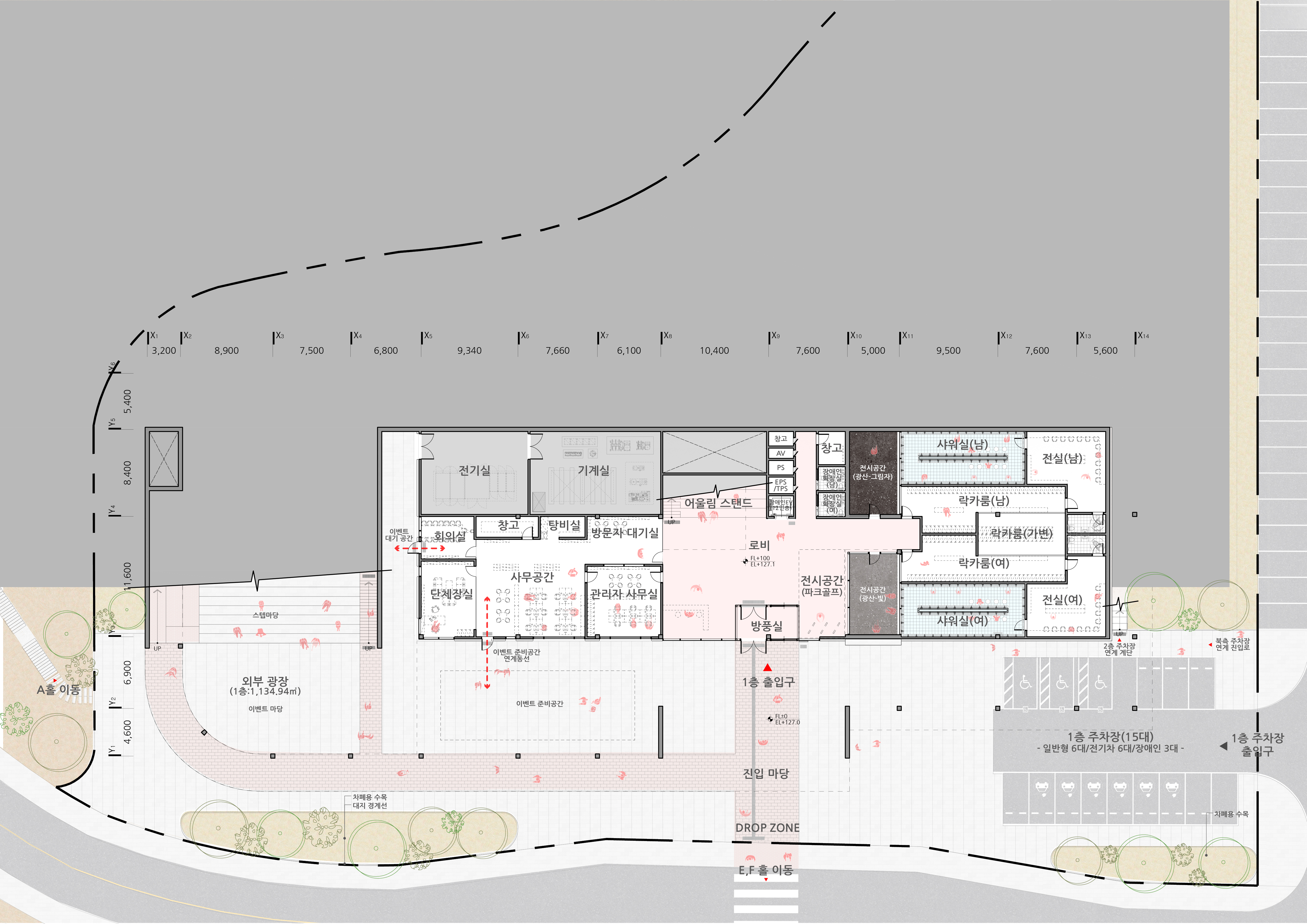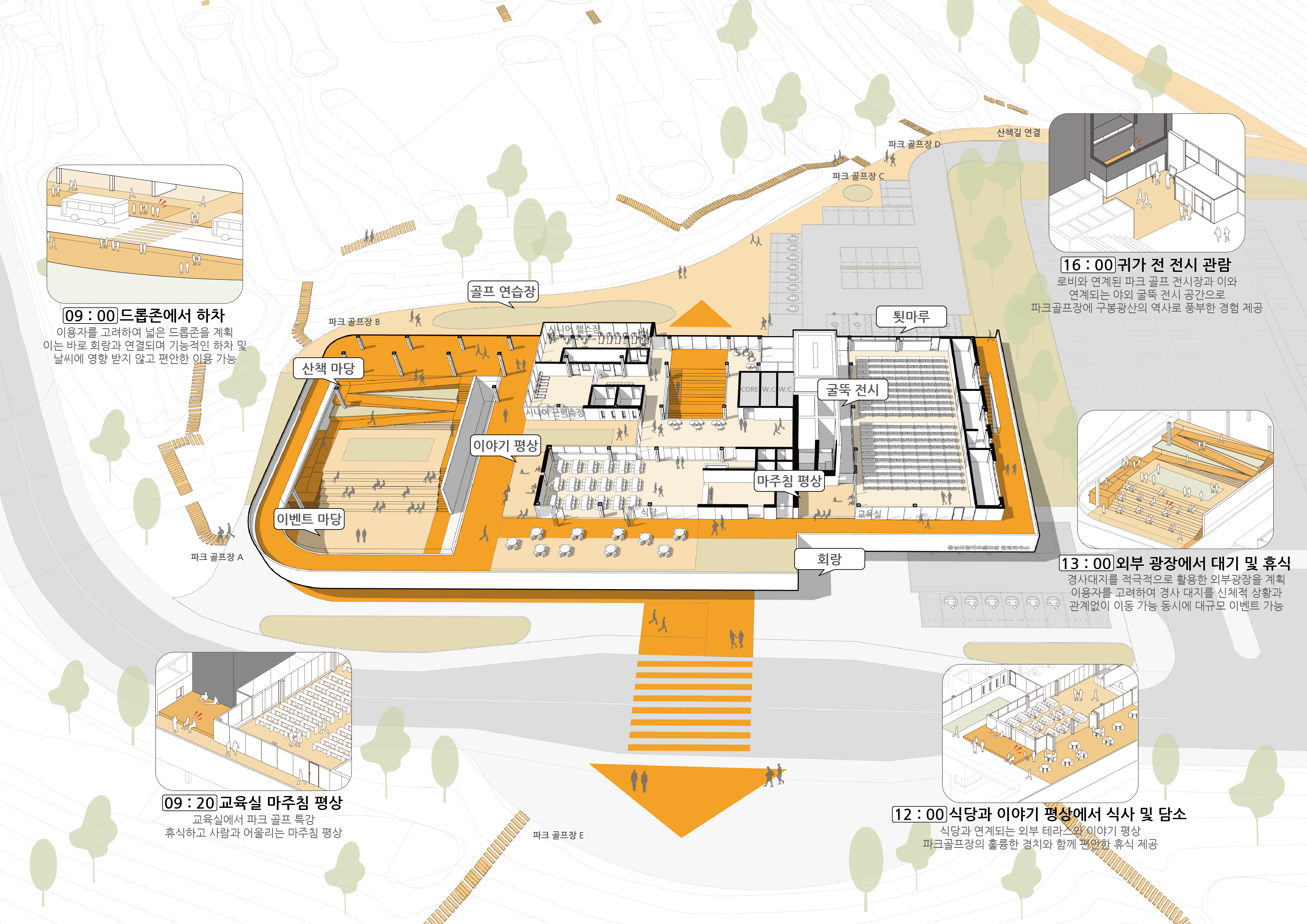 외부공간의 변주: 이벤트 광장, 순환형 산책로, 테라스 식당 등 각 섹터별로 점진적인 성격을 부여해 풍부한 야외 활동을 지원합니다.
