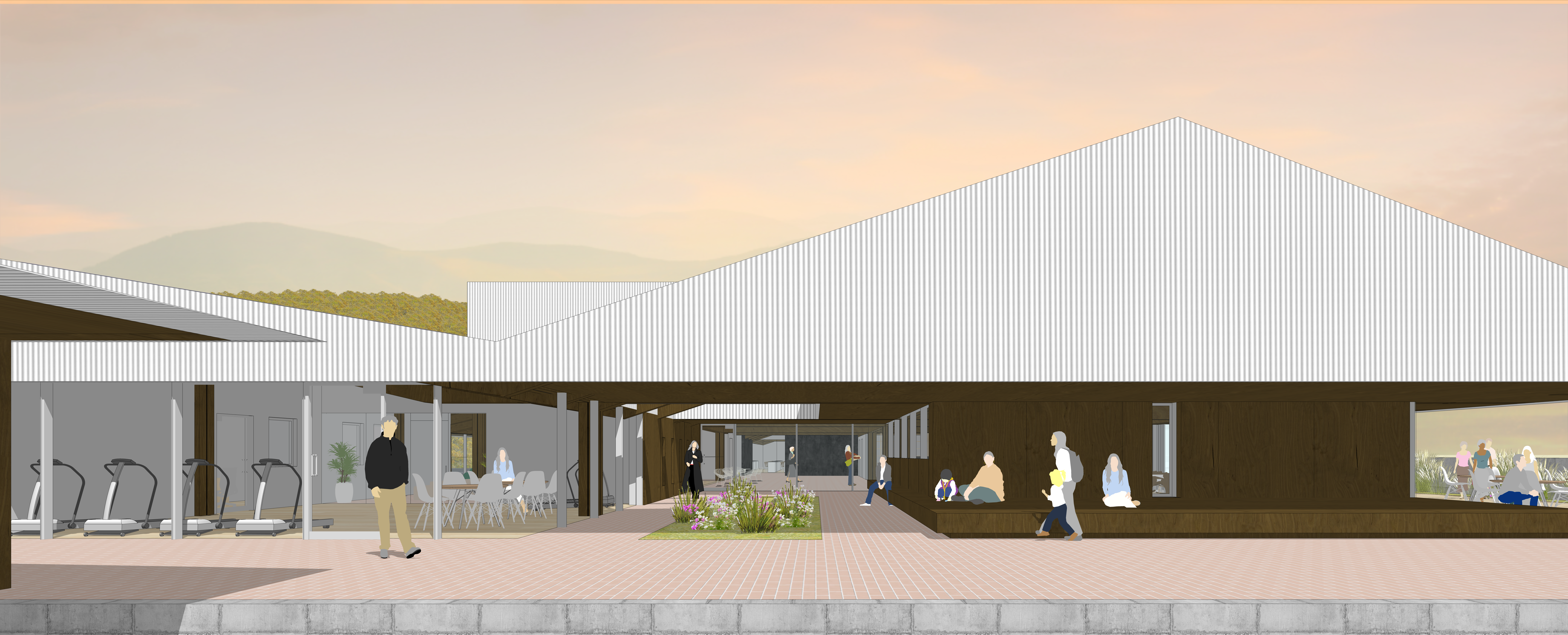유기적 동선: 경사지형을 활용해 1, 2층 모두 보행 진입이 가능하도록 계획했으며 휠체어 접근로와 회랑, 평상을 배치하여 시니어 이용객을 배려한 무장애(Barrier-free) 환경을 구축했습니다.