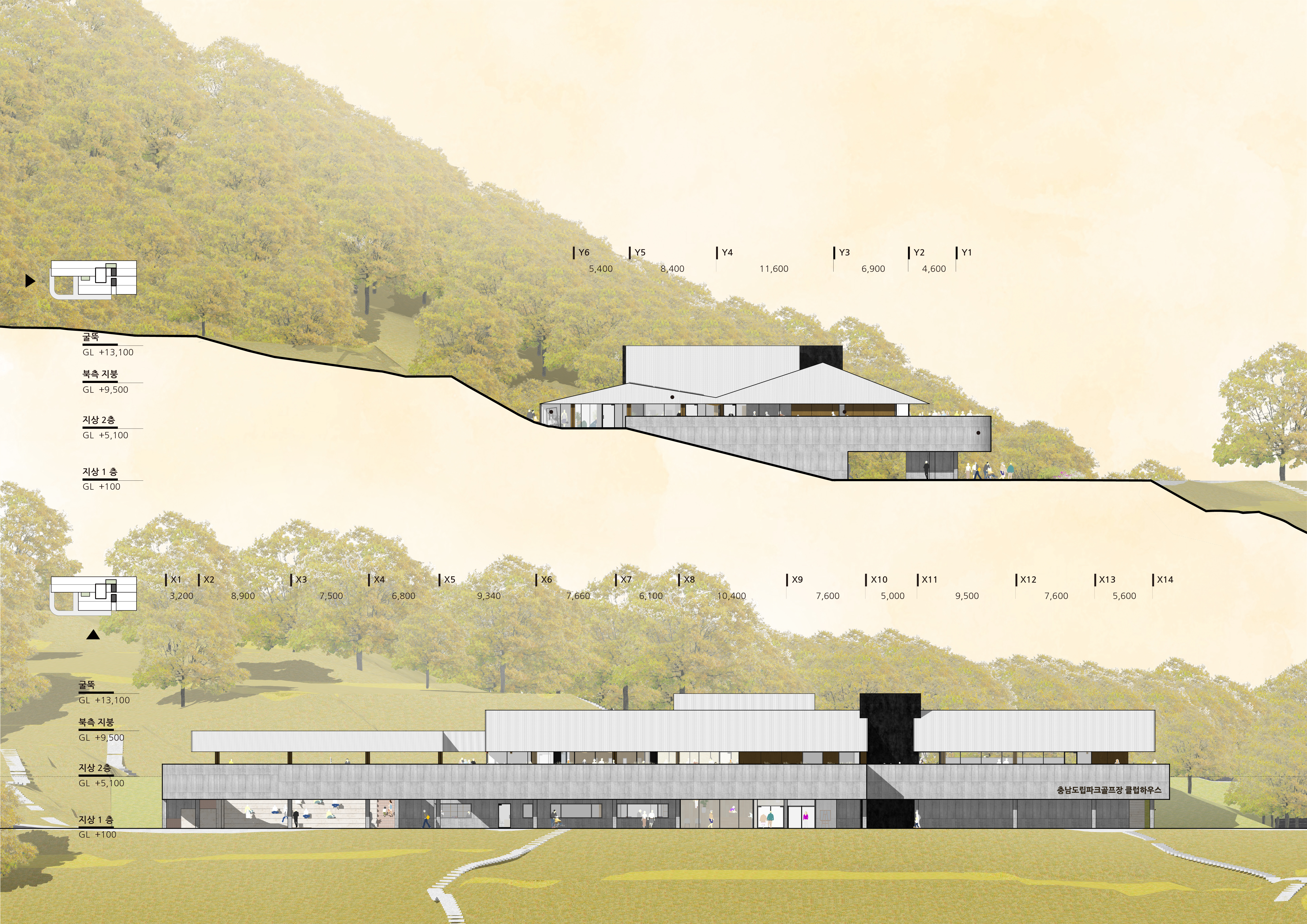 본 계획안은 구봉산의 완만한 능선과 구룡천의 물줄기가 어우러진 목가적 풍경 속에 자연스럽게 순응하며 과거 구봉광산의 역사적 흔적을 현대적 감각으로 재해석한 ‘적층된 시간의 클럽하우스’를 제안합니다.