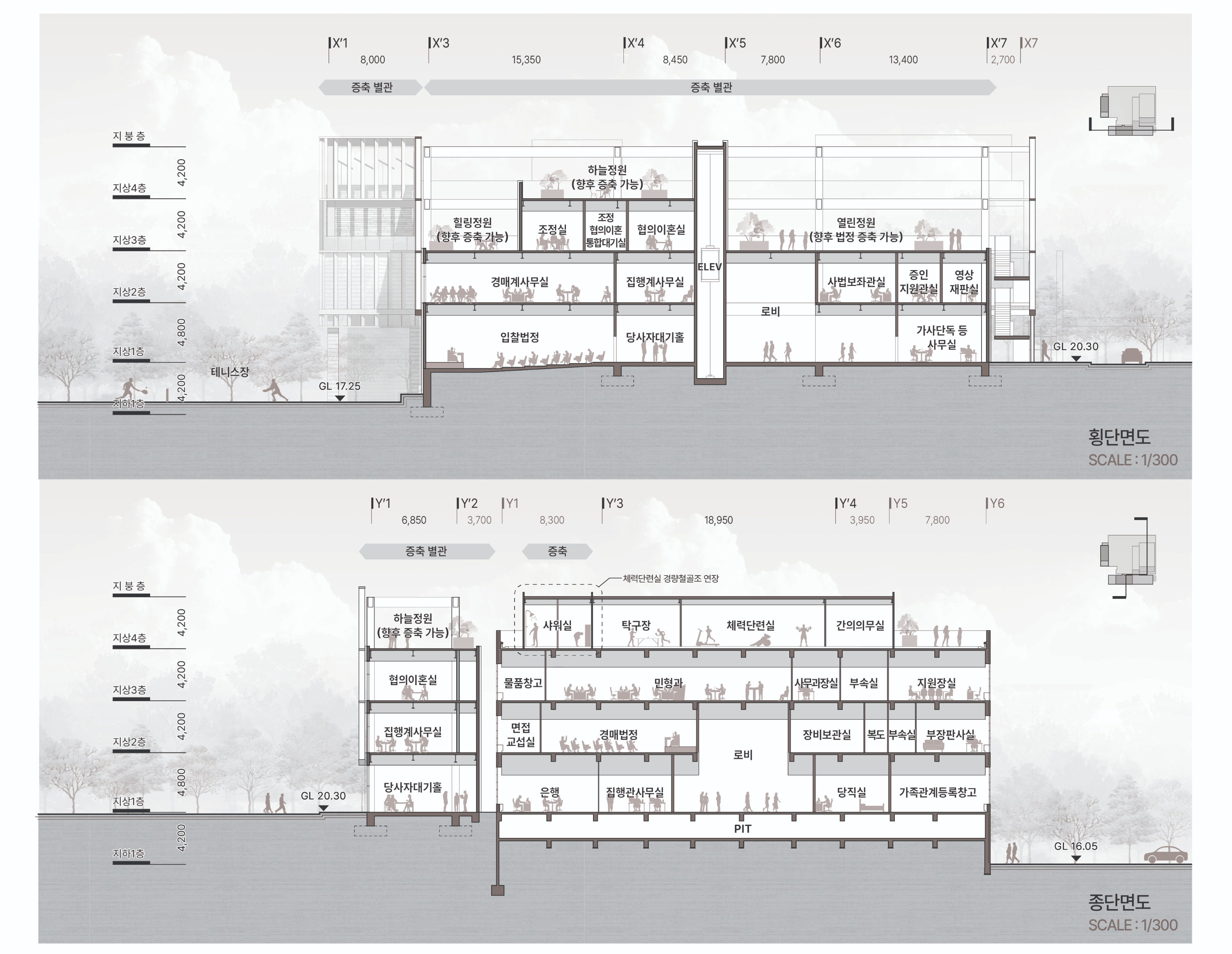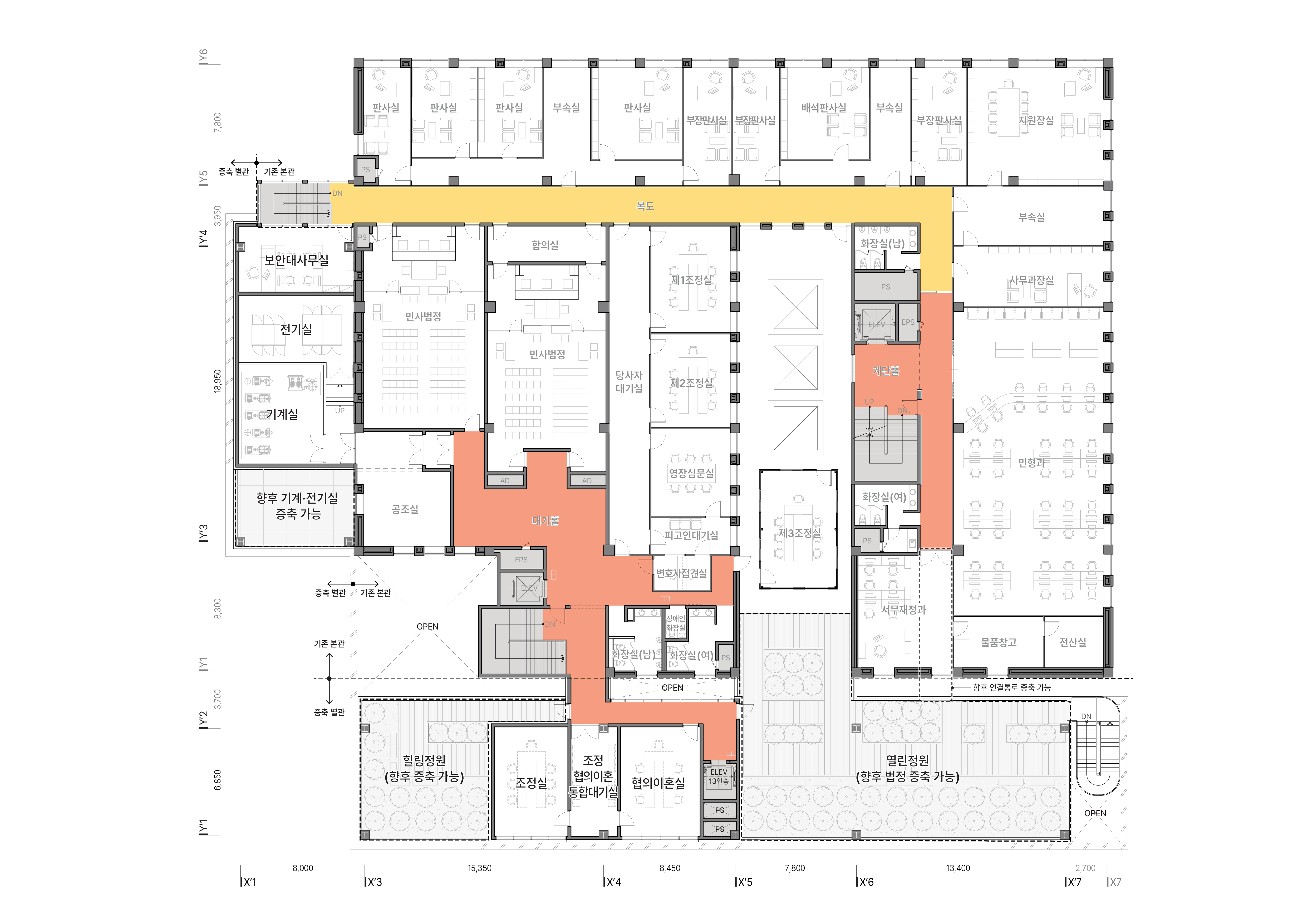 기존 본관은 법정과 법관 / 민원실과 민원인의 동선 분리가 명확했다. 이번 증축 계획의 핵심은 기존 법관 동선과 민원인 동선을 유지하여 별동 배치계획이 아닌 수평증축 계획을 하였다. 기존 동선을 유지하고 증축으로 인해 추가되는 동선을 최소화하여 계획하였다. 본관이 형성해온 축과 질서를 존중하여 이격 배치를 통해 본관의 입면 훼손과 기능적 간섭을 최소화하였다. 동시에 명확한 매스 정렬을 통해 독립적인 인지성을 확보하였다. 이용자(민원인·직원·사법) 동선은 체계적으로 분리하여 보안과 운영 효율을 높였으며, 특히 민원 동선은 단순하고 직관적으로 구성하여 이용자의 편의성을 극대화하였다.