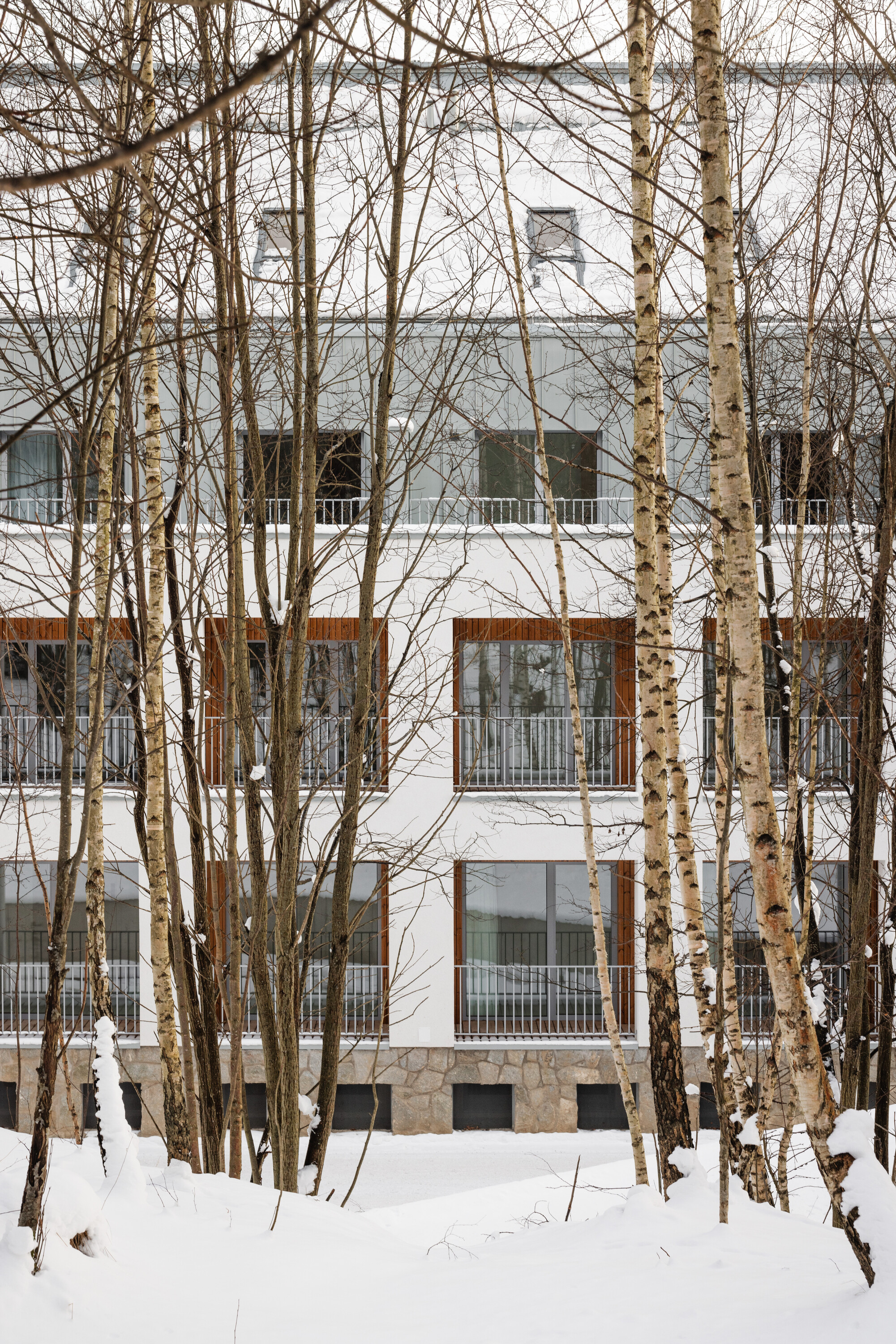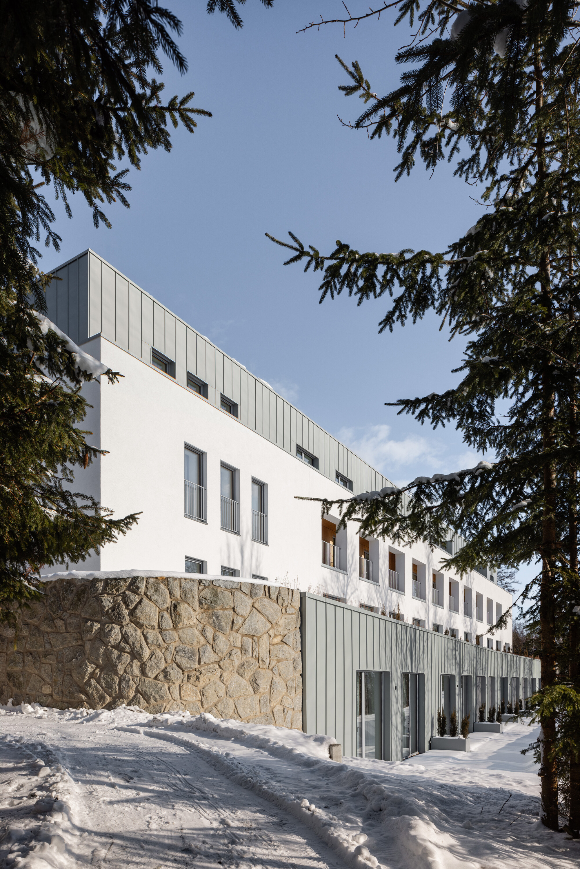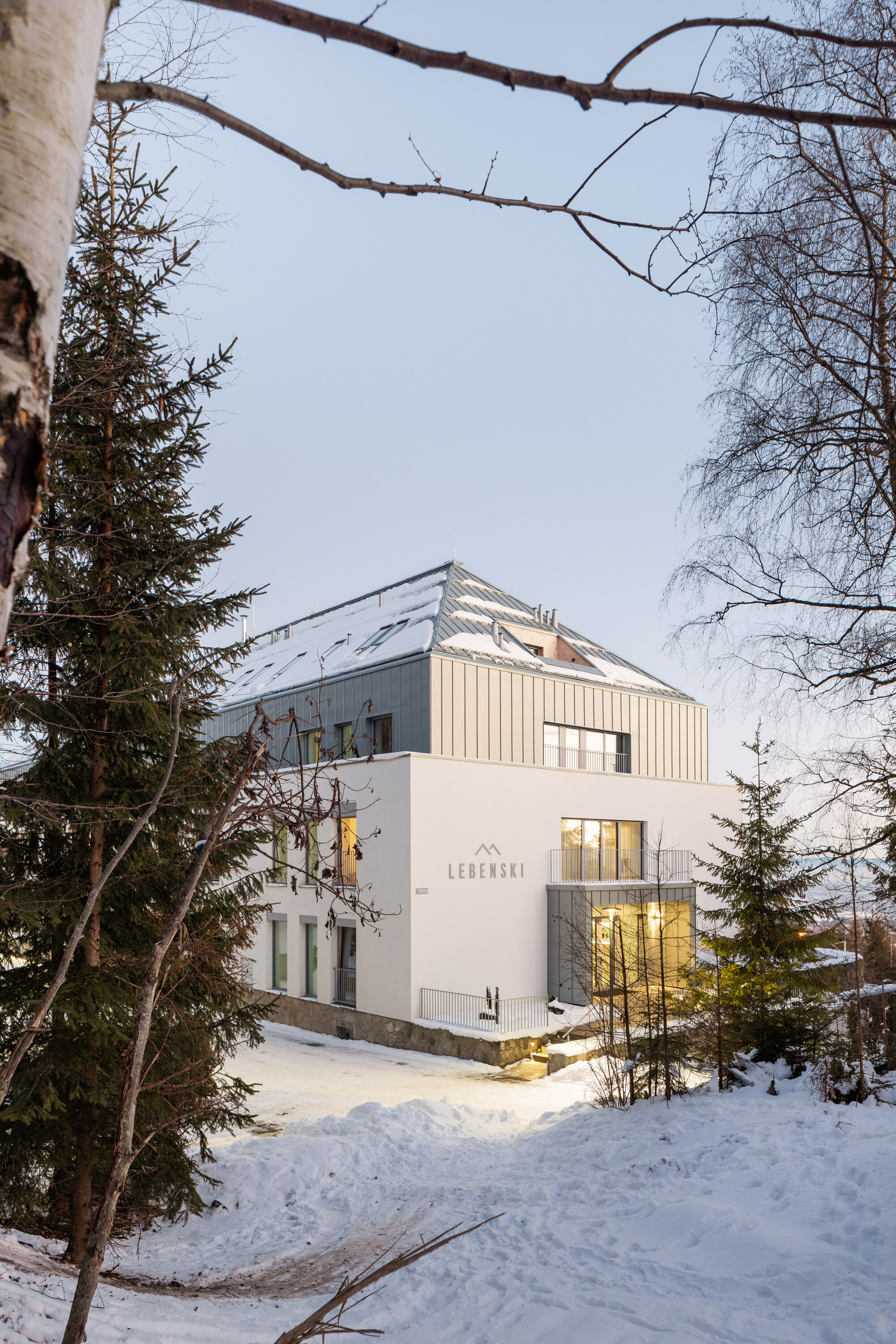 Lebenski라는 이름은 1960년대 초반에 지어진 요양 시설 ‘노비 지보트(Nový život, 새로운 삶)’에서 비롯된다. 1990년대 이후 건축적·기능적 가치를 상실했던 이 건물은 2023년 본격적인 재생을 시작했고, 아트리움 아르키텍티(Atrium Architekti)가 설계를 맡아 아파트형 주거 건물로 탈바꿈했다. 이 프로젝트는 이전에 같은 스튜디오가 진행했던 돌니 쿠빈(Dolný Kubín)의 작업에 이어, 산악 지역 건축에 대한 또 하나의 해석으로 이어진다.
