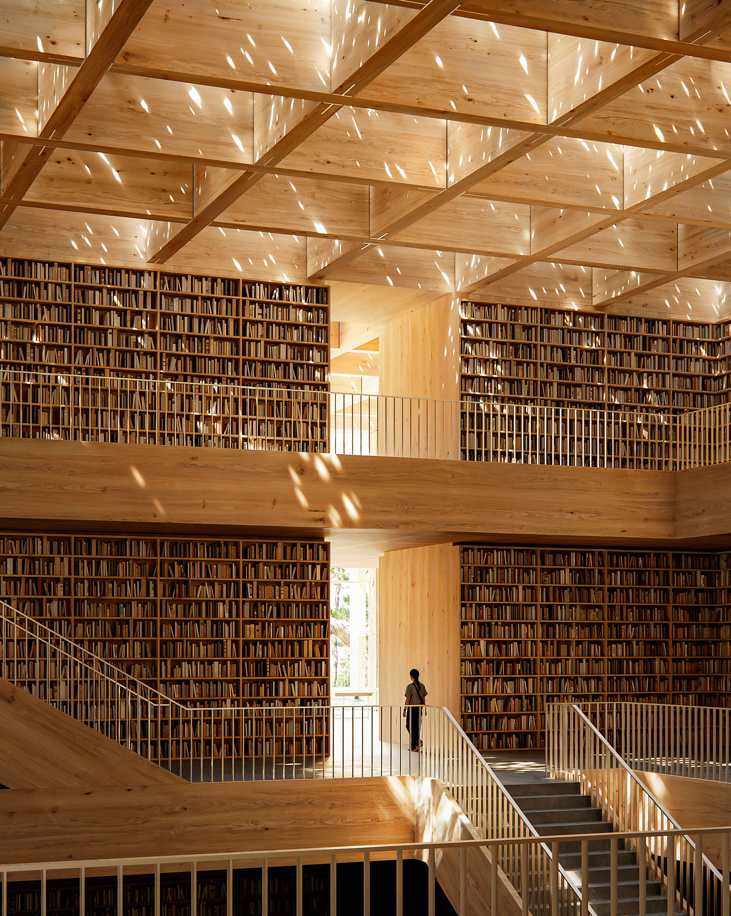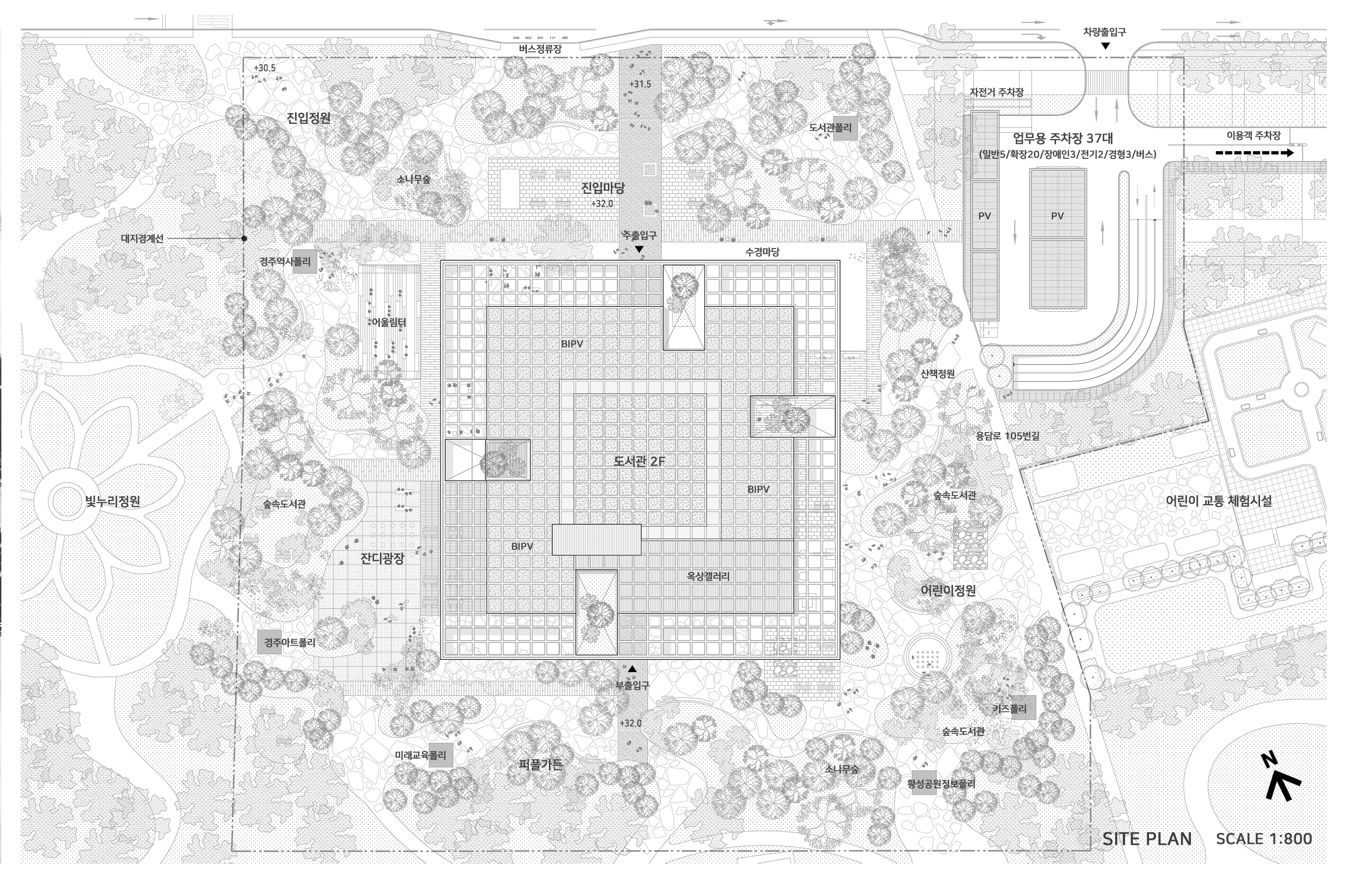 디자인은 소나무숲과 도서관의 병치를 통해 굽이치는 숲을 헤치고 순수한 기하학으로 계획된 도서관을 조우하는 여정을 설계하고