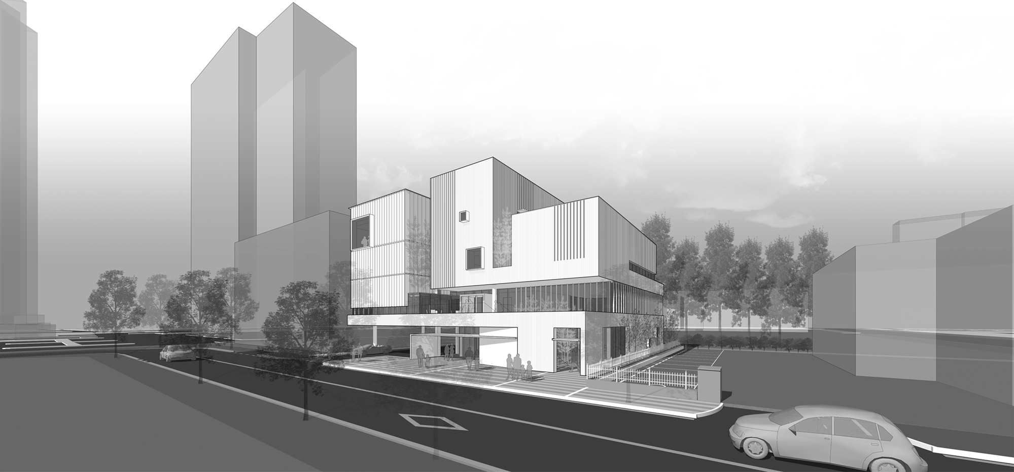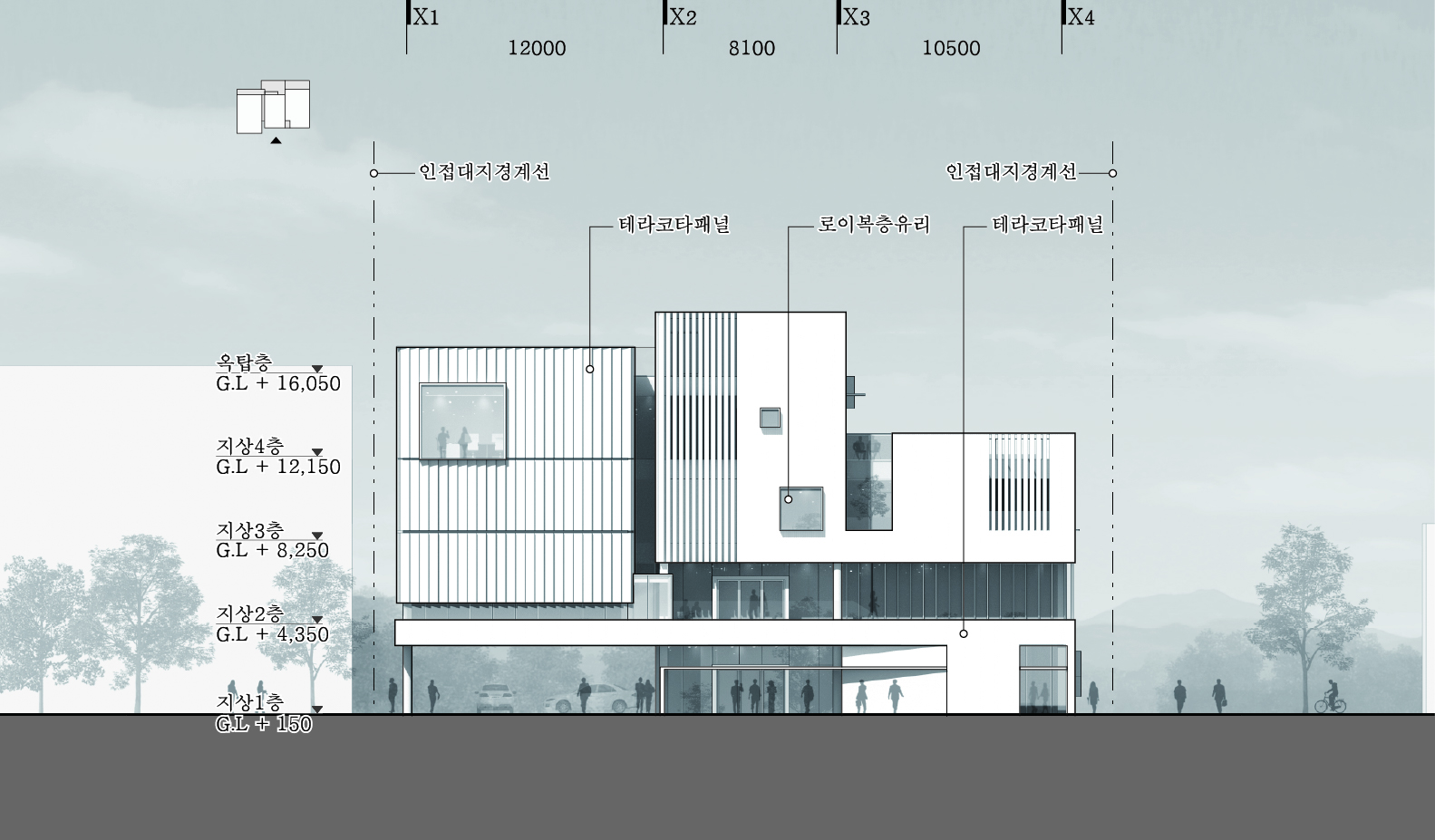 입면에서는 이러한 커뮤니티 루프의 흐름이 과도하게 드러나지 않도록 매스를 분절하고 개구부의 리듬을 조절했다. 이를 통해 상부로 이어지는 커뮤니티 공간은 도시 풍경 속에 자연스럽게 스며들며, 건물 전체가 하나의 열린 커뮤니티 구조임을 은근히 드러낸다.