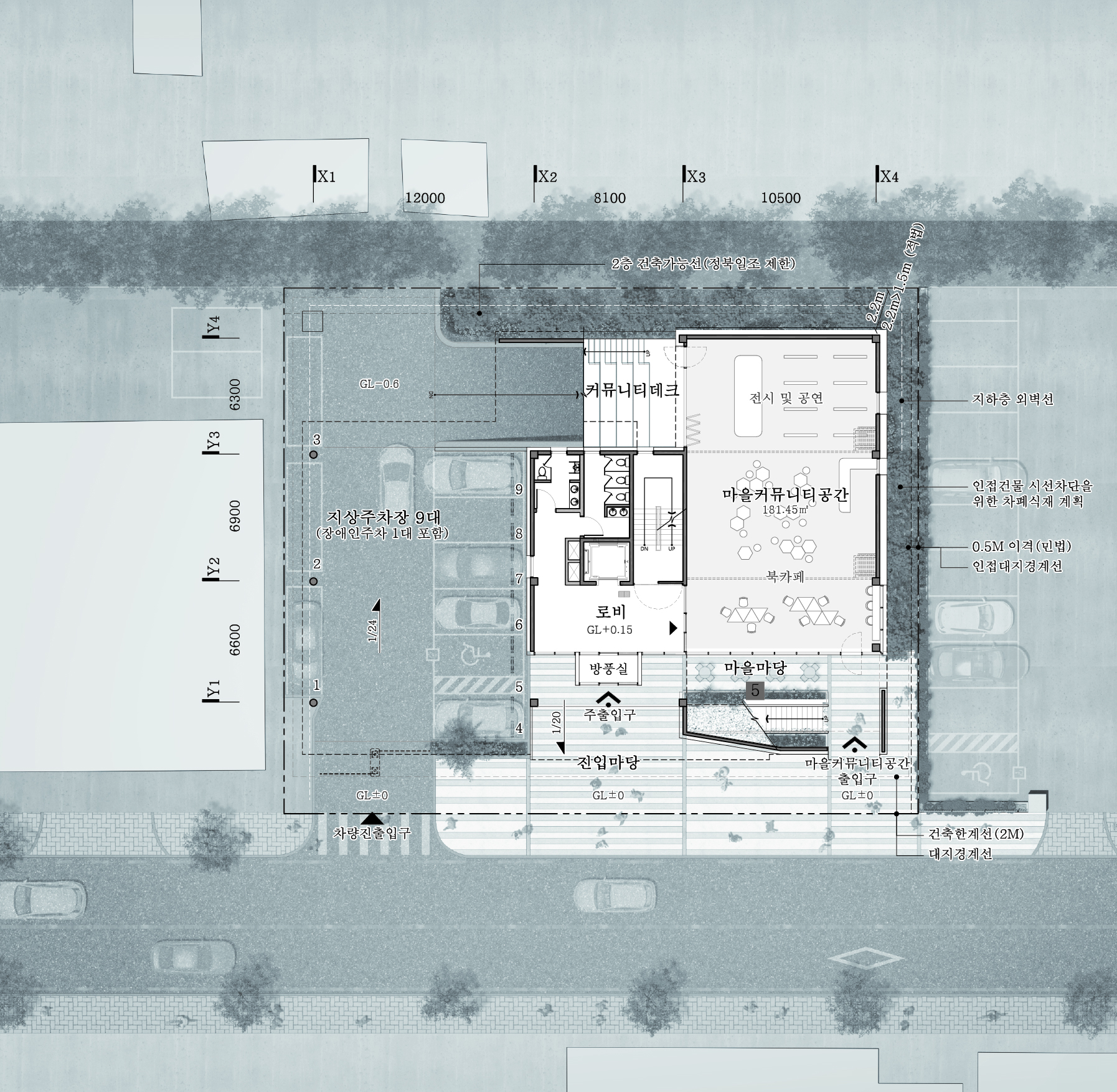 본 계획은 이러한 조건을 전제로, 커뮤니티센터가 단순한 프로그램 수용 시설을 넘어 일상의 흐름 속에서 사람들이 반복적으로 마주치고 관계를 쌓아갈 수 있는 공간적 기반이 되어야 한다고 보았다. 이를 위해 노은3동 마을커뮤니티센터는 도시와 건물, 내부와 외부, 이동과 체류가 분리되지 않고 이어지는 공간 구조를 통해, 오늘의 도시 환경 속에서 ‘마을’을 다시 구성하고자 한다.