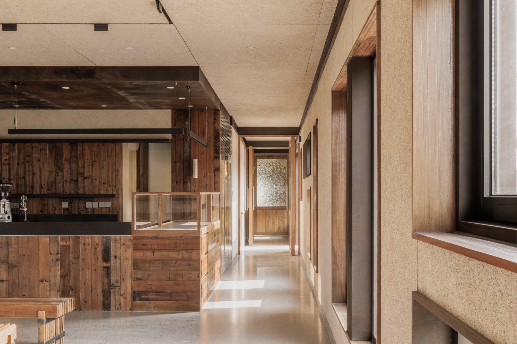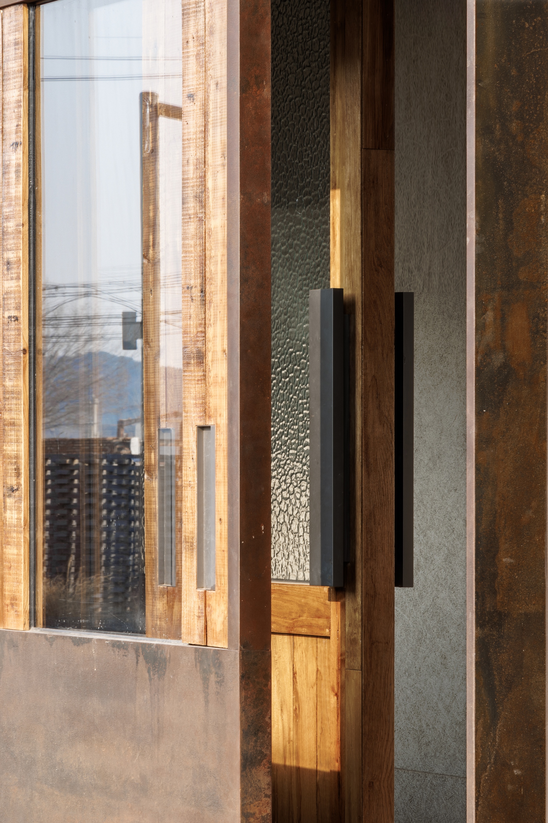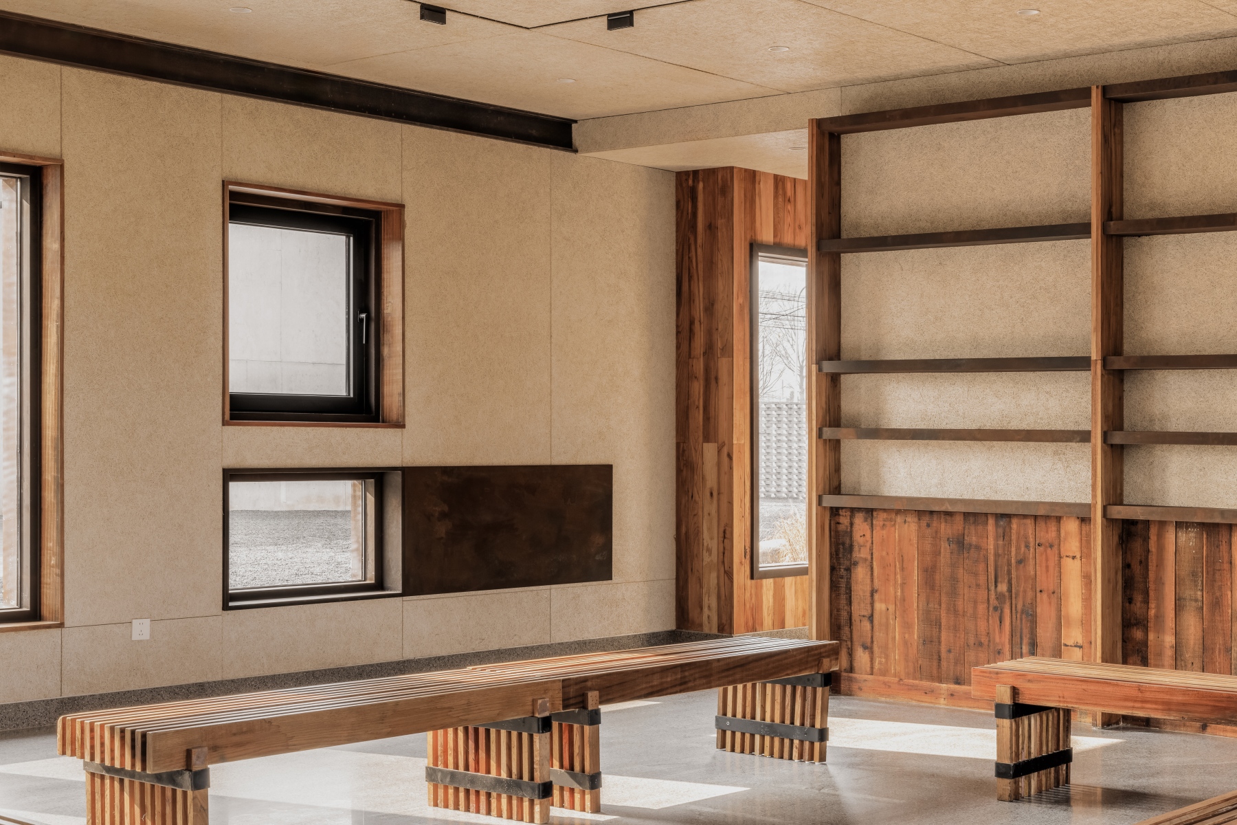레스토랑 리노베이션에서는 기존의 철골 구조와 골강판 지붕이 유지되었다. 모듈식 벽체를 도입해 계절에 따른 열환경을 조절하고, 남북으로 배치된 수직·수평 창을 통해 농장의 풍경이 실내로 스며든다. 외부는 오래된 목재와 녹슨 강판으로 마감되어 농장의 생명력을 드러내고, 내부는 목섬유 흡음 패널, 재활용 목재, 테라조 마감으로 차분한 분위기를 형성한다. 실내외의 대비는 극적이지 않으며, 오히려 하나의 연속된 장면처럼 이어진다.