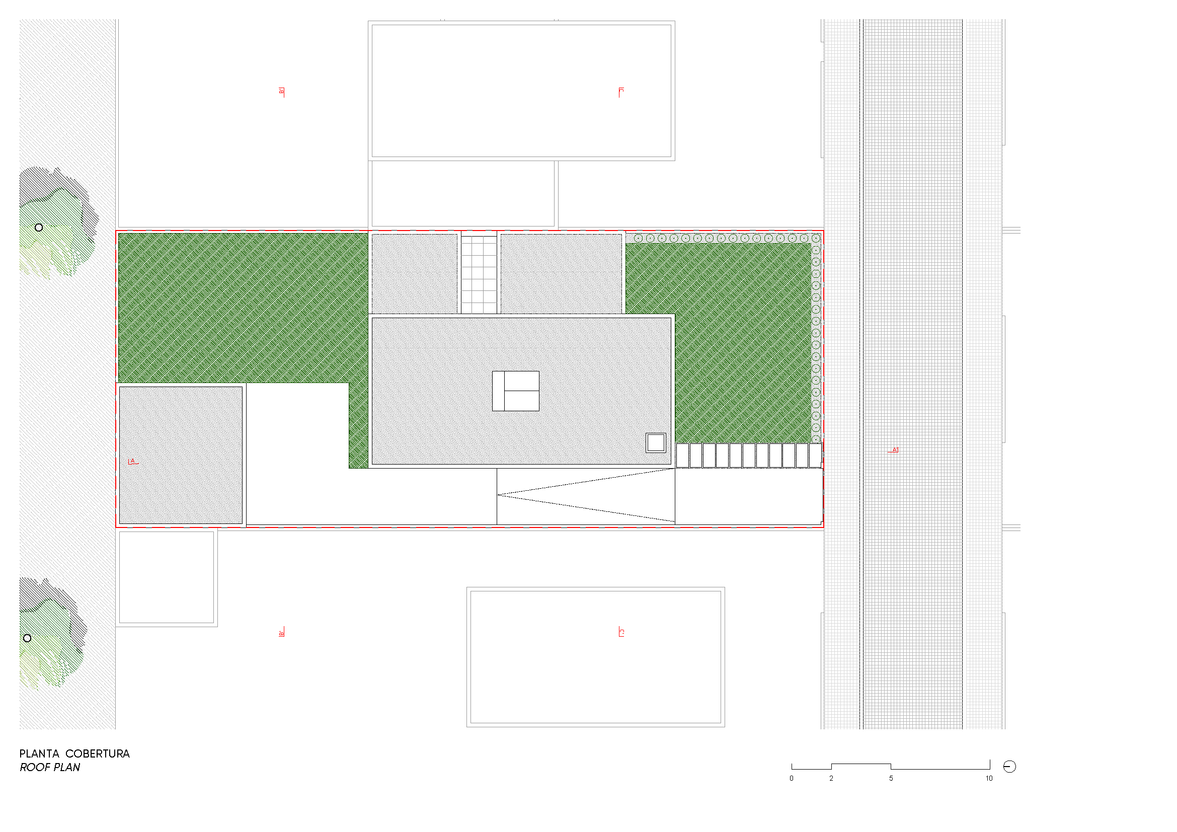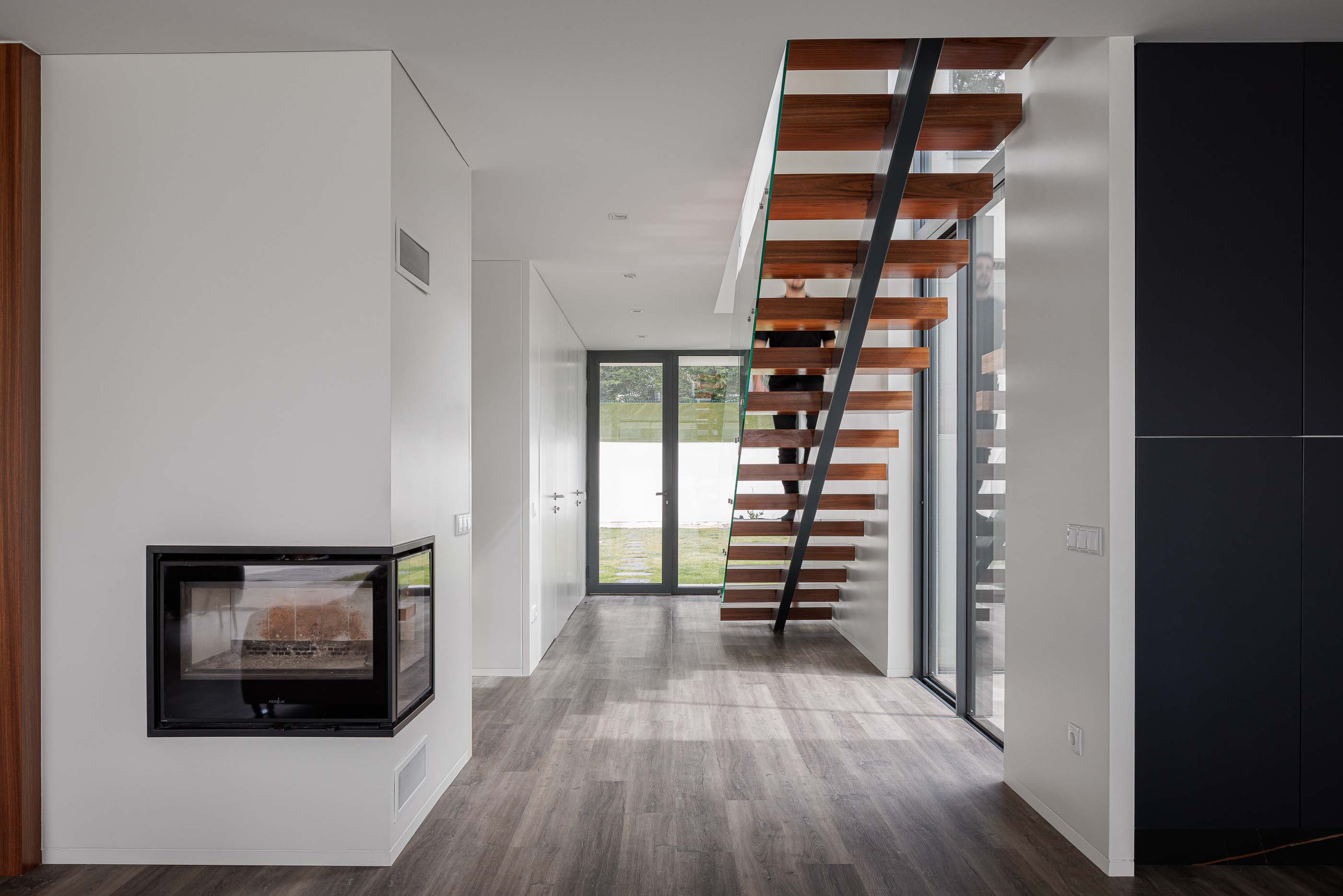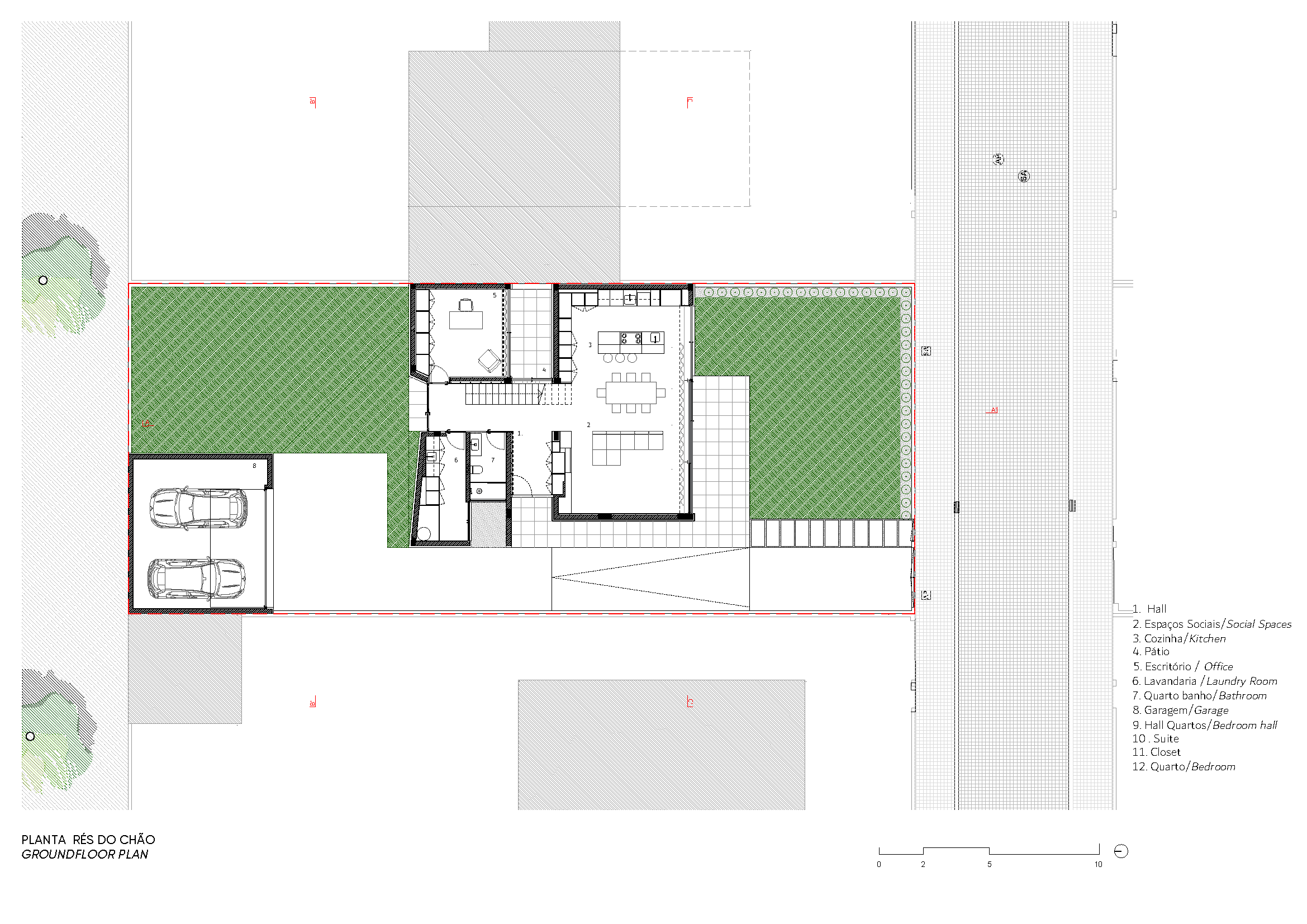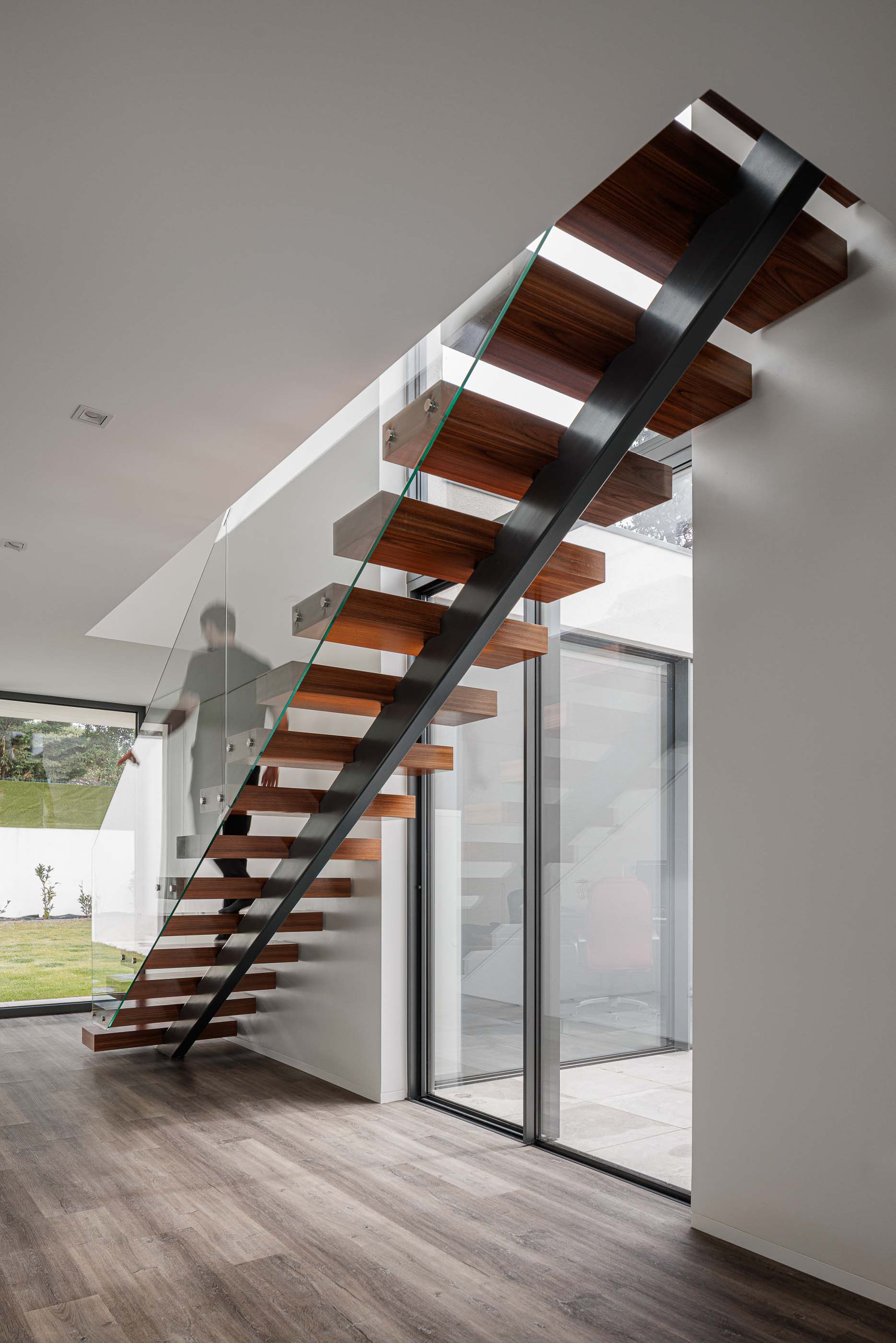 1층에는 거실과 주방을 중심으로 한 사회적 공간이 배치되었다. 이 영역은 전면 유리 개구부를 통해 정원으로 완전히 열리며, 실내 공간은 외부 풍경의 연장으로 인식된다. 오픈 플랜으로 구성된 이 공간은 가족의 일상과 교류를 자연스럽게 수용한다. 상부 매스가 일부 들어 올려진 구조는 그 아래에 그늘과 보호된 외부 공간을 형성해, 열적 쾌적성을 높이는 동시에 외부 활동의 질을 강화한다.