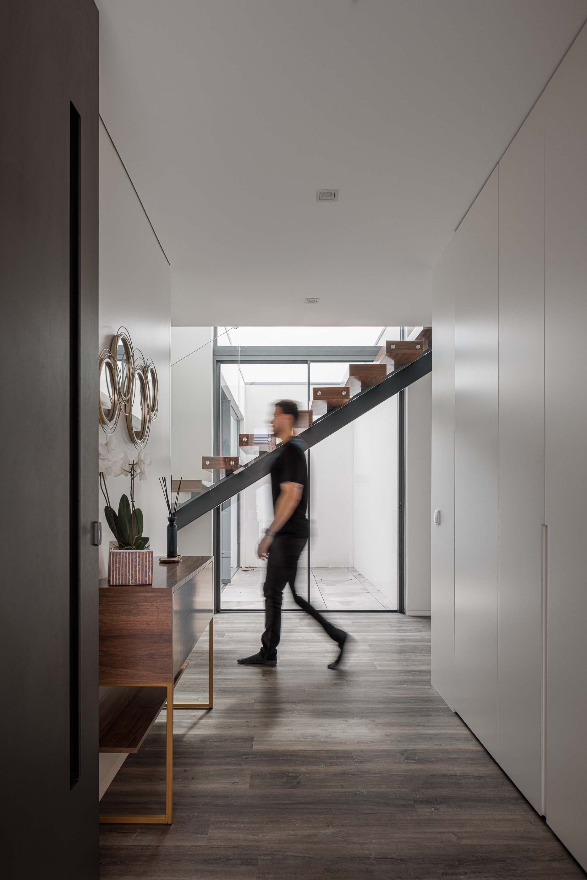 건물의 공간 구조는 두 개의 주요 축을 중심으로 조직된다. 진입을 담당하는 횡축에는 내부 중정이 배치되어, 자연광을 주택의 중심부로 끌어들이며 동선 공간의 질을 끌어올린다. 한편 남측 정원을 향해 열린 종축은 외부와의 지속적인 시각적 관계를 형성하며, 상부층 침실로 이어지는 공간의 흐름을 만든다. 이 두 축은 채움과 비움, 투명성과 불투명성이 명확히 대비되는 질서를 형성하며, 공적 영역과 사적 영역의 관계를 정리한다.