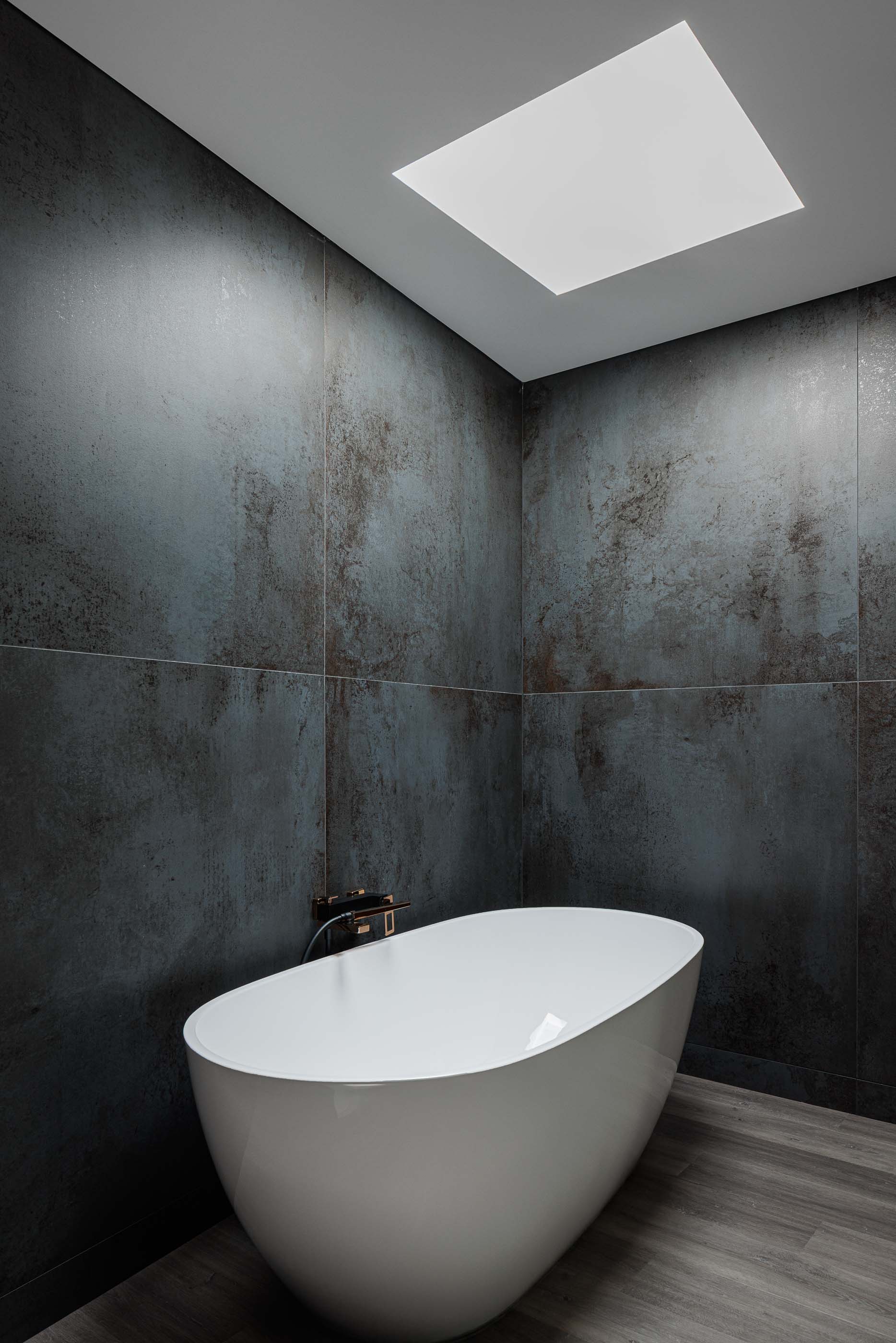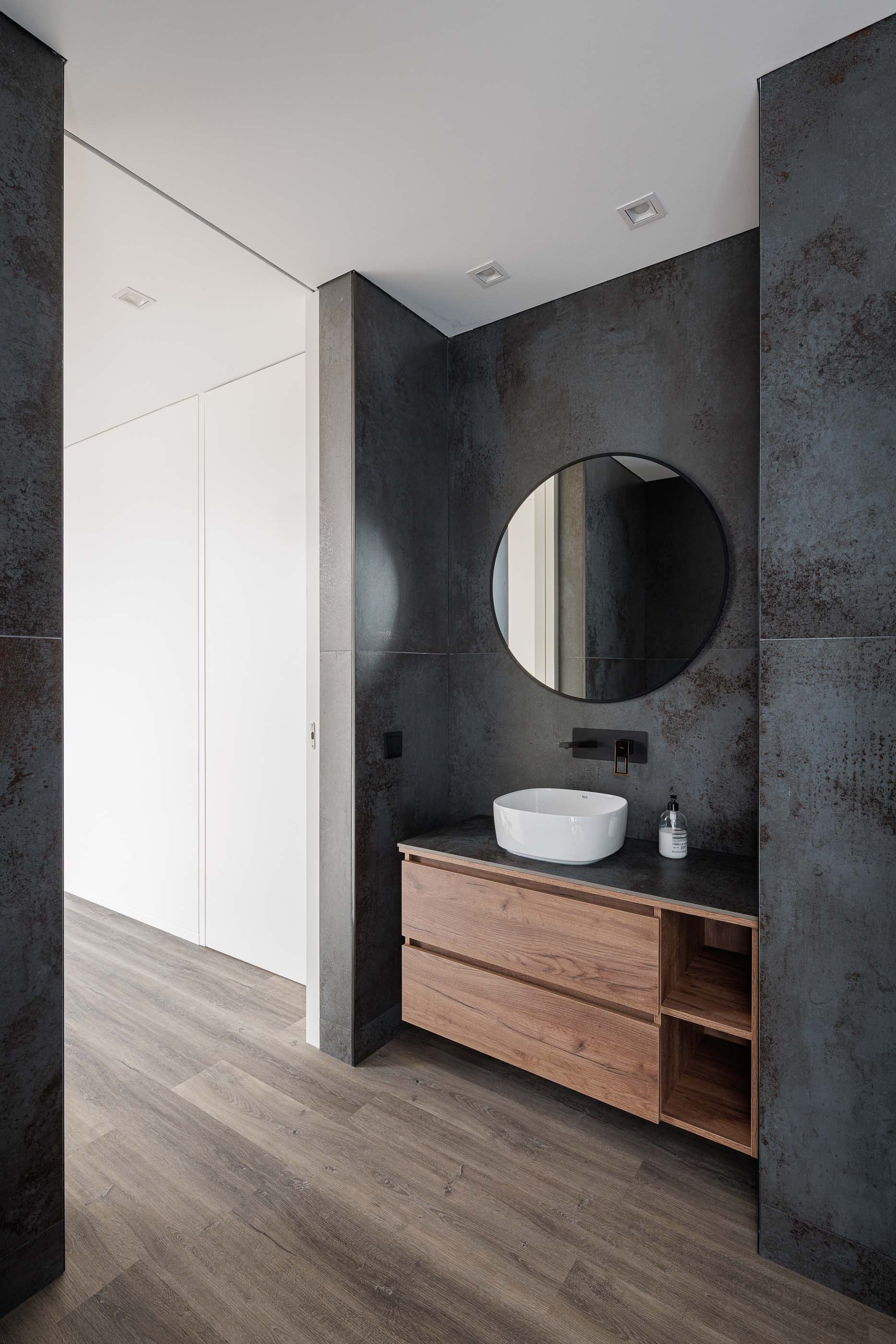재료와 디테일은 절제된 정확성을 바탕으로 선택되었다. 연속된 백색 표면, 최소 단면의 창호, 넓은 유리 면과 균질한 바닥 마감은 공간을 정제된 하나의 장면으로 만든다. 매입형 수납 시스템은 시각적 잡음을 줄이며, 조명 역시 기하학적 축에 맞춰 은은하게 배치되어 밤에는 건물을 하나의 입체적 오브제로 드러낸다. 빛과 그림자, 깊이와 비례가 조용히 강조된다.