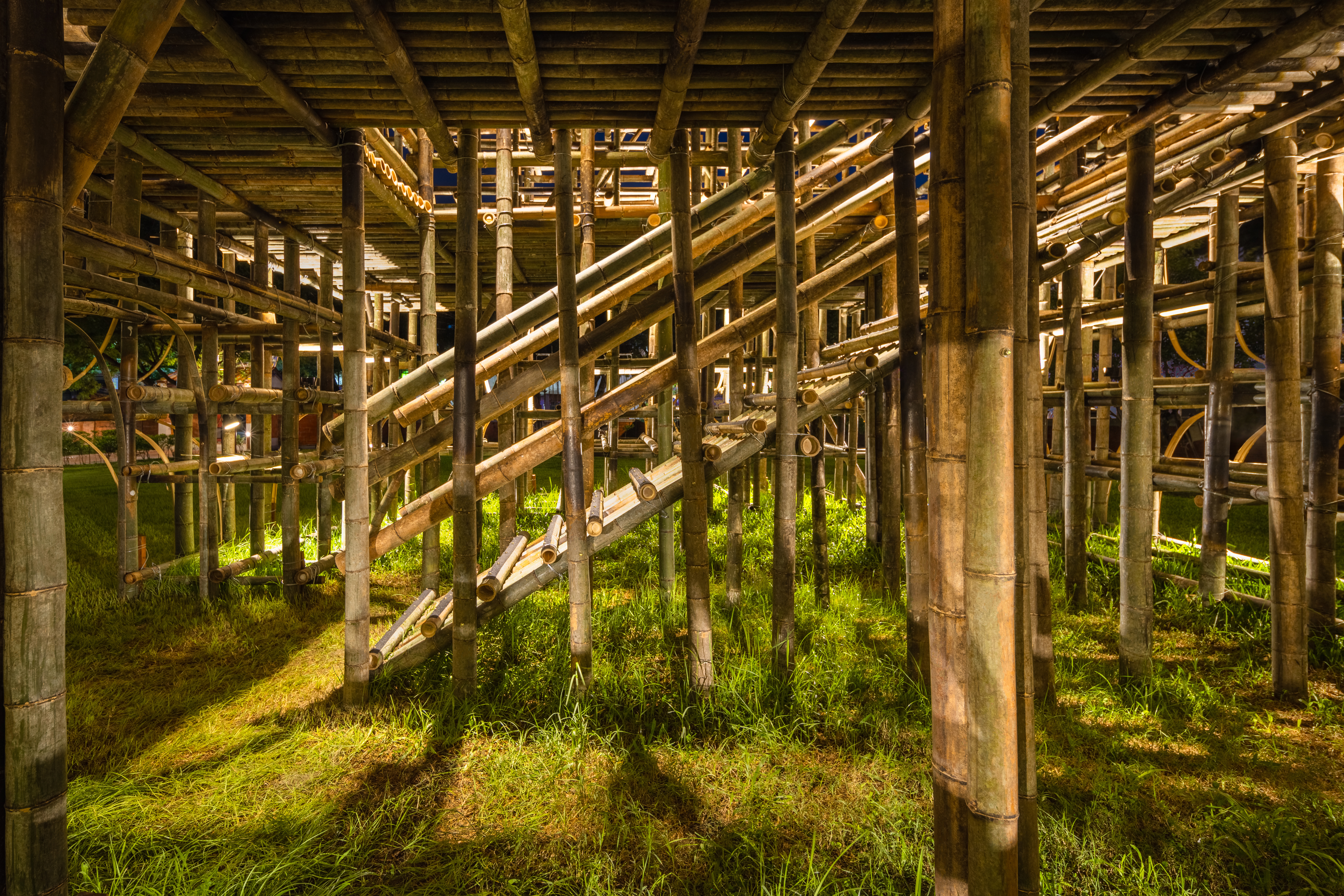 구조는 수직과 수평으로 교차하는 대나무 프레임을 기본으로 한다. 반복되는 리듬과 질서가 공간의 골격을 이루고, 그 사이를 가느다란 쪼갠 대나무가 부드러운 곡선으로 감싼다. 이 곡선들은 파사드와 평면에 동시에 작용하며, 구조의 엄격함을 완화한다. 관람자는 대나무로 만든 계단을 따라 무대 위로 올라가고, 그 순간부터는 관객이자 배우로서 공간 안에 포함된다. 발과 손, 몸의 움직임을 통해 대나무라는 재료의 물성과 전통 구조의 공간감을 직접 체험하게 된다.