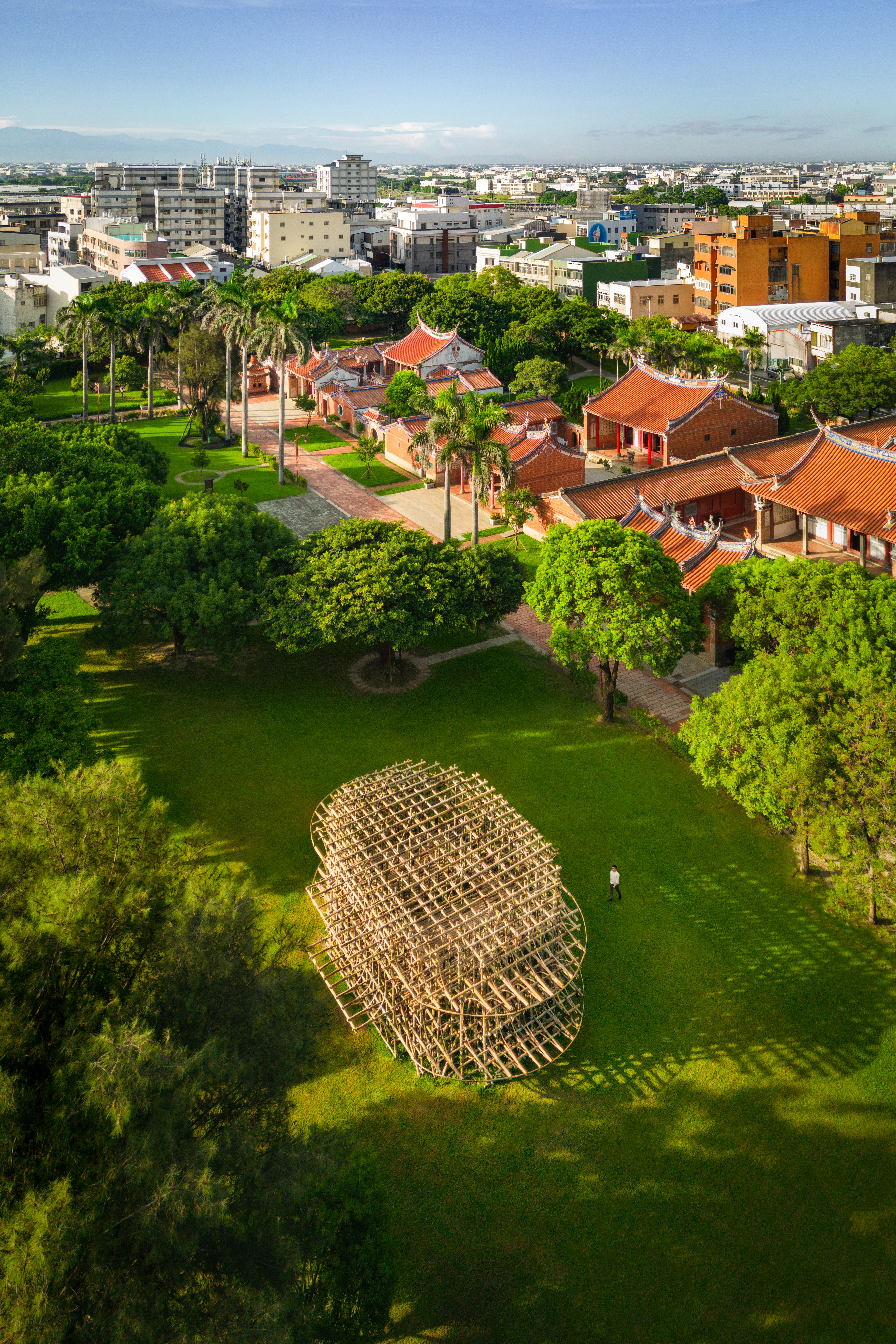 대만 창화현 루강에 위치한 문무묘 앞 잔디광장에는 2022년 여름, 하나의 거대한 대나무 구조물이 들어섰다. 이 프로젝트는 작가 청충펑이 대만 전통 축제 문화에서 점차 사라지고 있는 ‘죽붕희대(竹棚戲台)’, 즉 대나무 임시 극장을 현대적으로 재해석한 대형 야외 공간 설치 작업이다. 이 작업은 단순한 조형물이 아니라, 공동체의 기억과 신체적 경험을 다시 불러오는 하나의 장소로 기능한다.