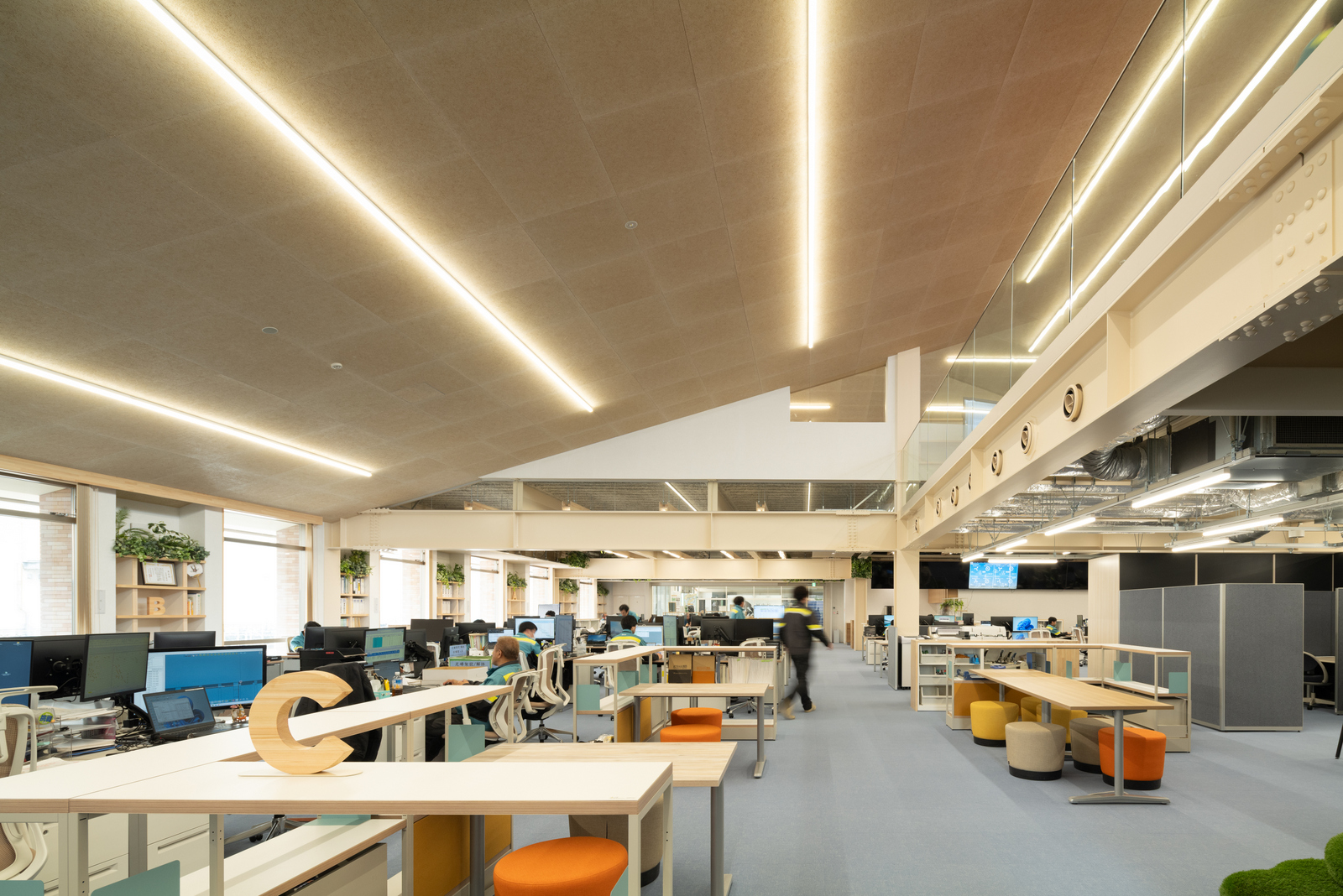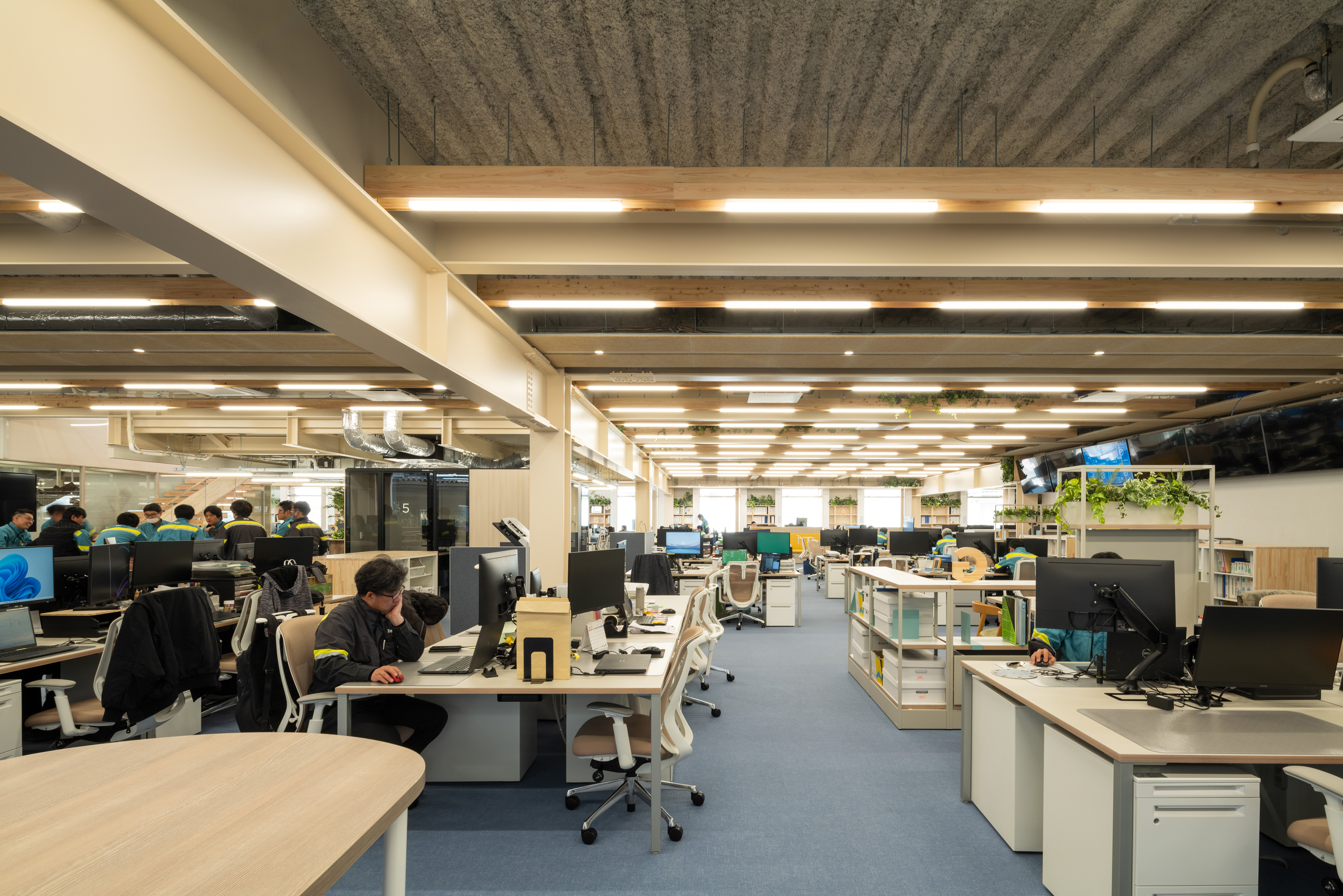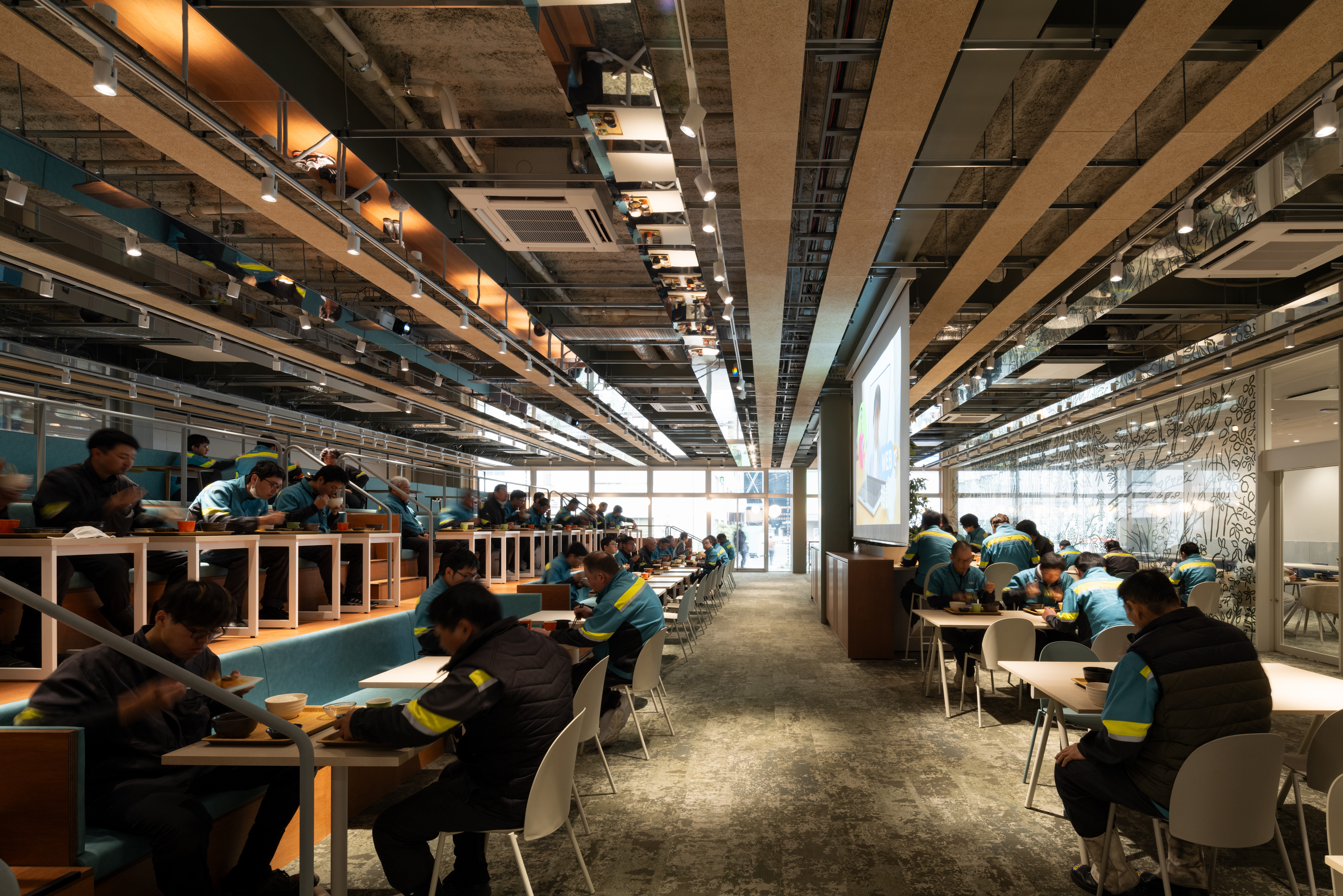 공간은 10.8m의 규칙적 구조 그리드를 기반으로 형성된다. 서로 다른 경사를 가진 지붕 면이 결합되어 두 개의 대형 매스를 만들고, 이 매스는 반외부 복도로 연결된다. 브레이크 공간, 워크스테이션, 회의실, 식당, 탈의실, 라운지 등 복합 프로그램은 구조 그리드 안에 치밀하게 배치되었다. 조선소 현장에서 근무를 마치고 돌아오는 작업자부터 해외에서 방문한 관계자까지, 다양한 사용자가 이 공간에서 교차한다. 이 흐름을 적절히 필터링하면서도 자연스럽게 교류하도록 유도하는 것이 설계의 주요 과제였다. 이를 위해 건조실과 로커룸, 컨시어지 라운지 등 완충 공간이 전략적으로 배치되었다.