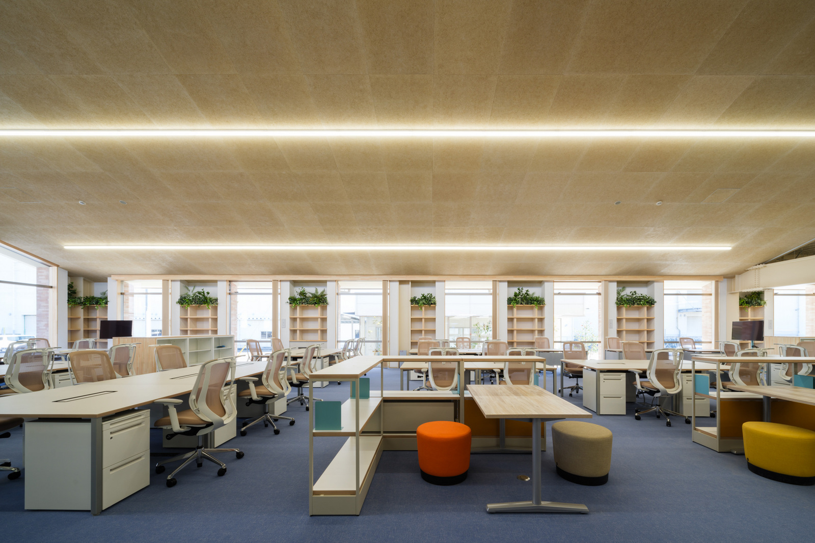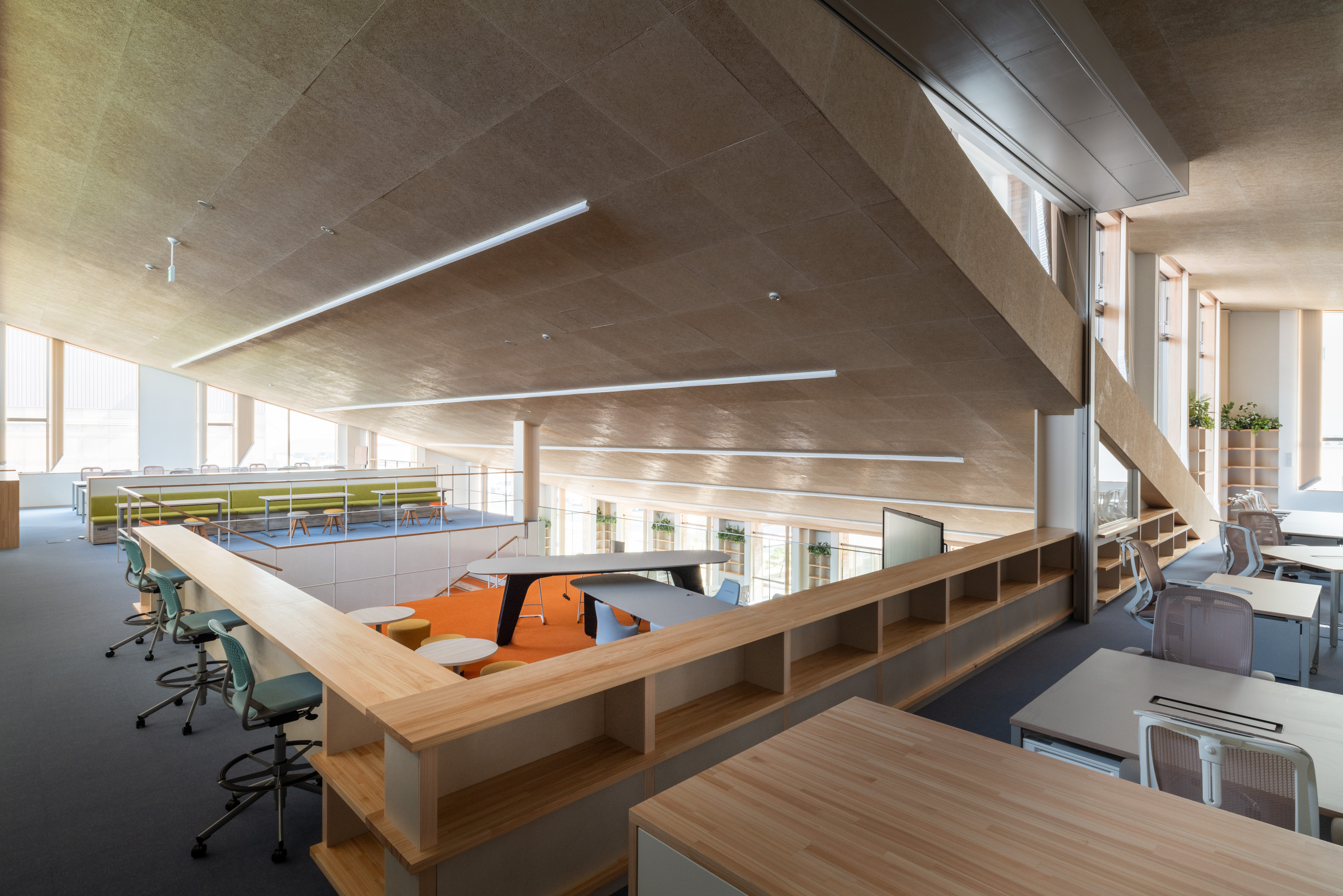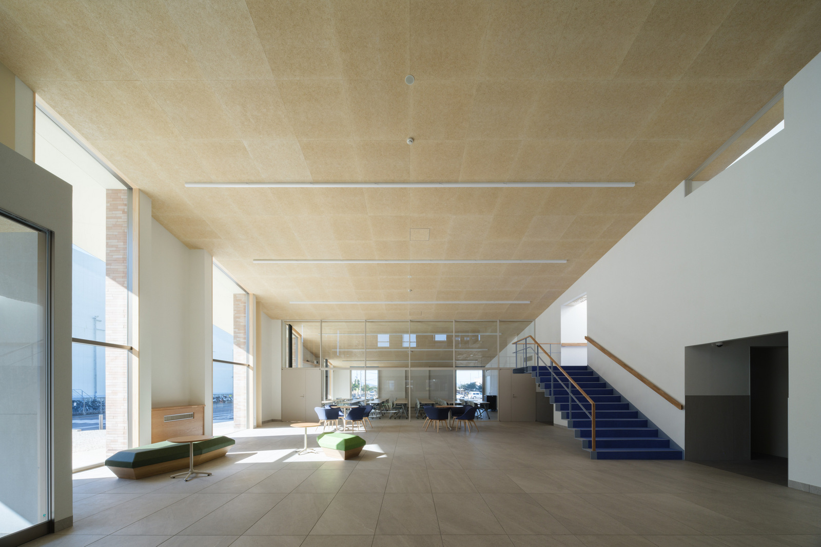공간은 10.8m의 규칙적 구조 그리드를 기반으로 형성된다. 서로 다른 경사를 가진 지붕 면이 결합되어 두 개의 대형 매스를 만들고, 이 매스는 반외부 복도로 연결된다. 브레이크 공간, 워크스테이션, 회의실, 식당, 탈의실, 라운지 등 복합 프로그램은 구조 그리드 안에 치밀하게 배치되었다. 조선소 현장에서 근무를 마치고 돌아오는 작업자부터 해외에서 방문한 관계자까지, 다양한 사용자가 이 공간에서 교차한다. 이 흐름을 적절히 필터링하면서도 자연스럽게 교류하도록 유도하는 것이 설계의 주요 과제였다. 이를 위해 건조실과 로커룸, 컨시어지 라운지 등 완충 공간이 전략적으로 배치되었다.